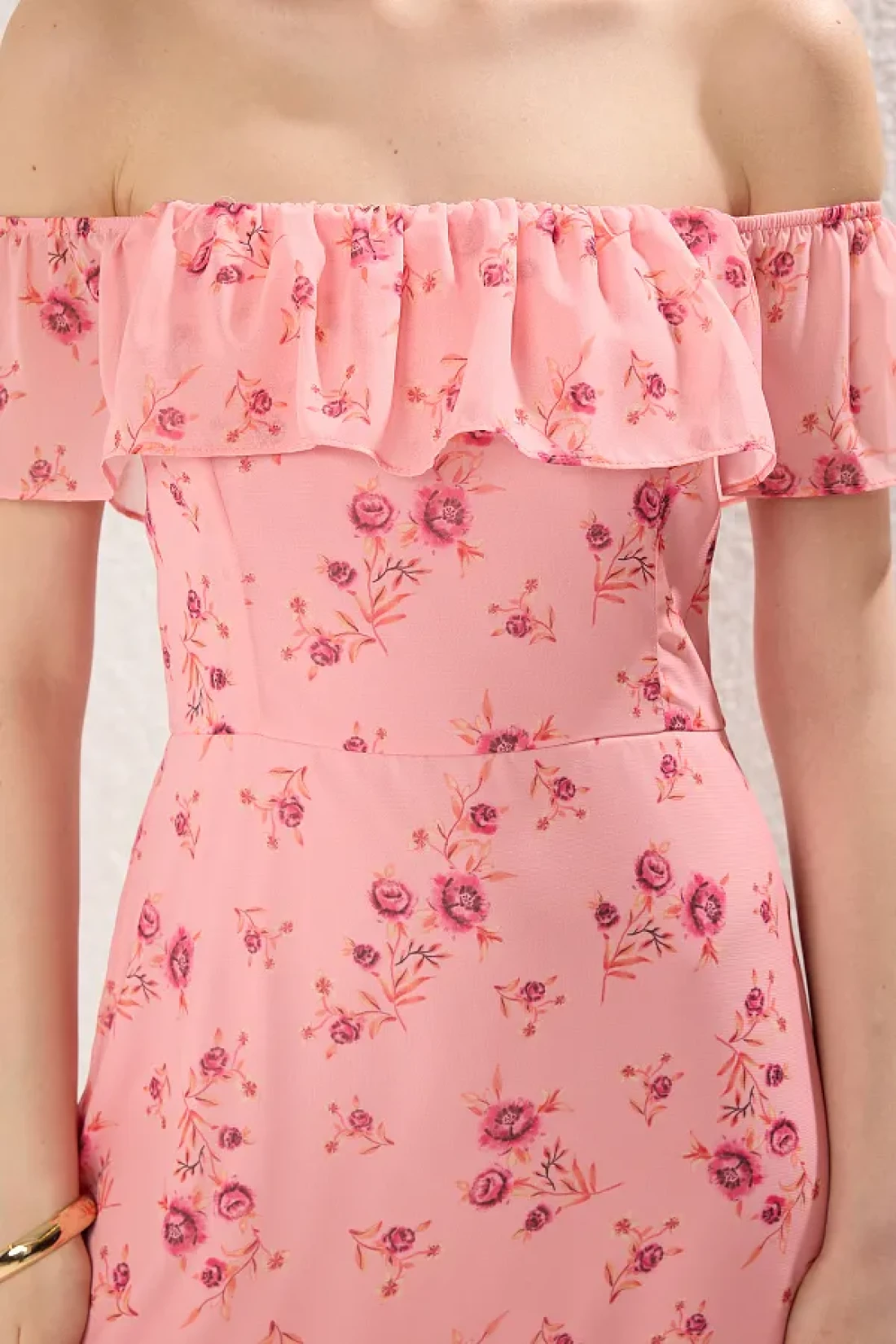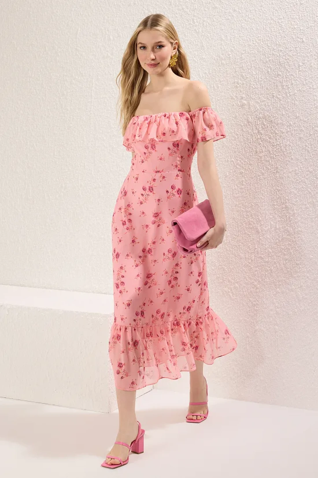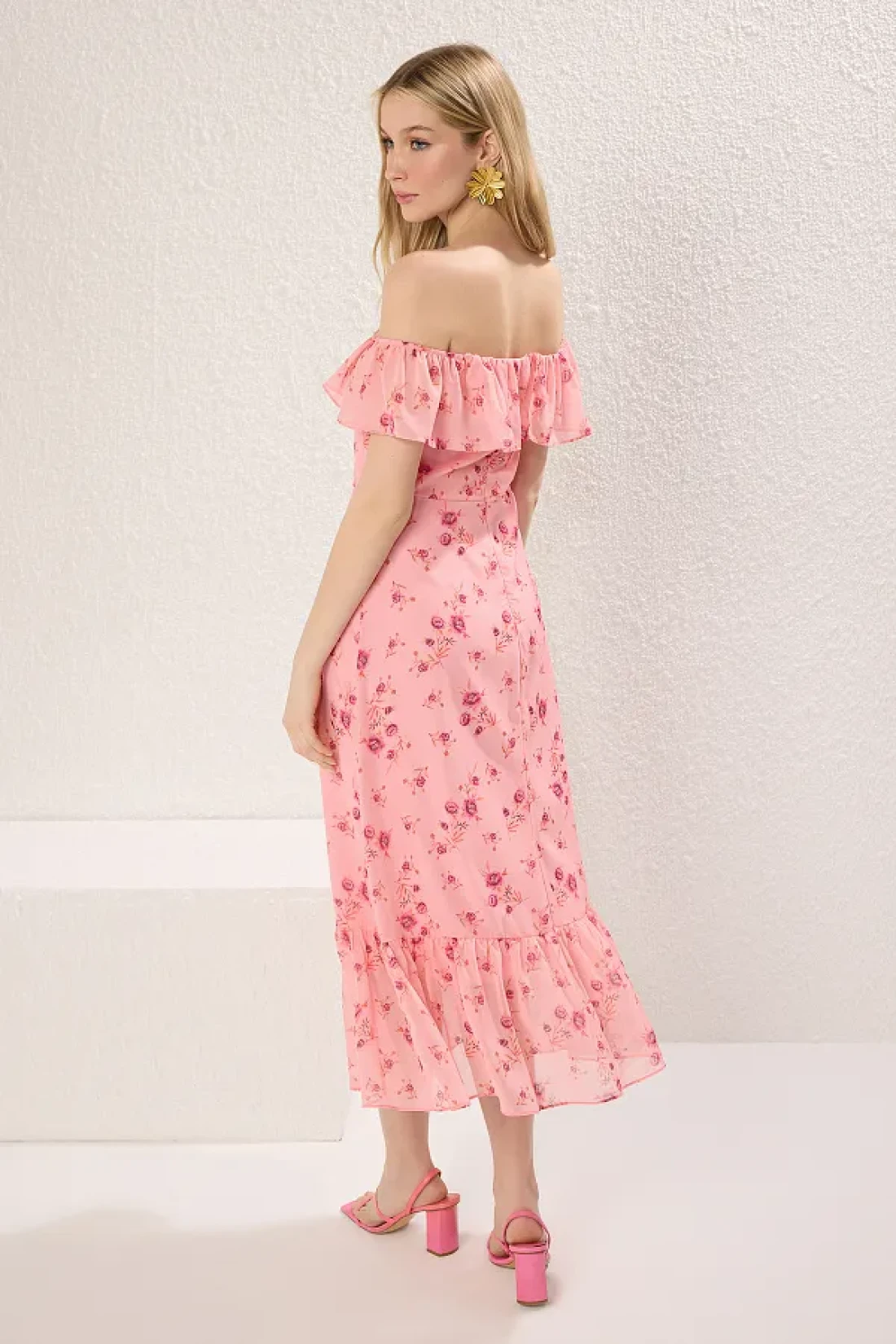 Collection Pink Floral Skirt Waist Opening Ruffle Chiffon Flight Flight Woven Midi Dress Twoss25El00278