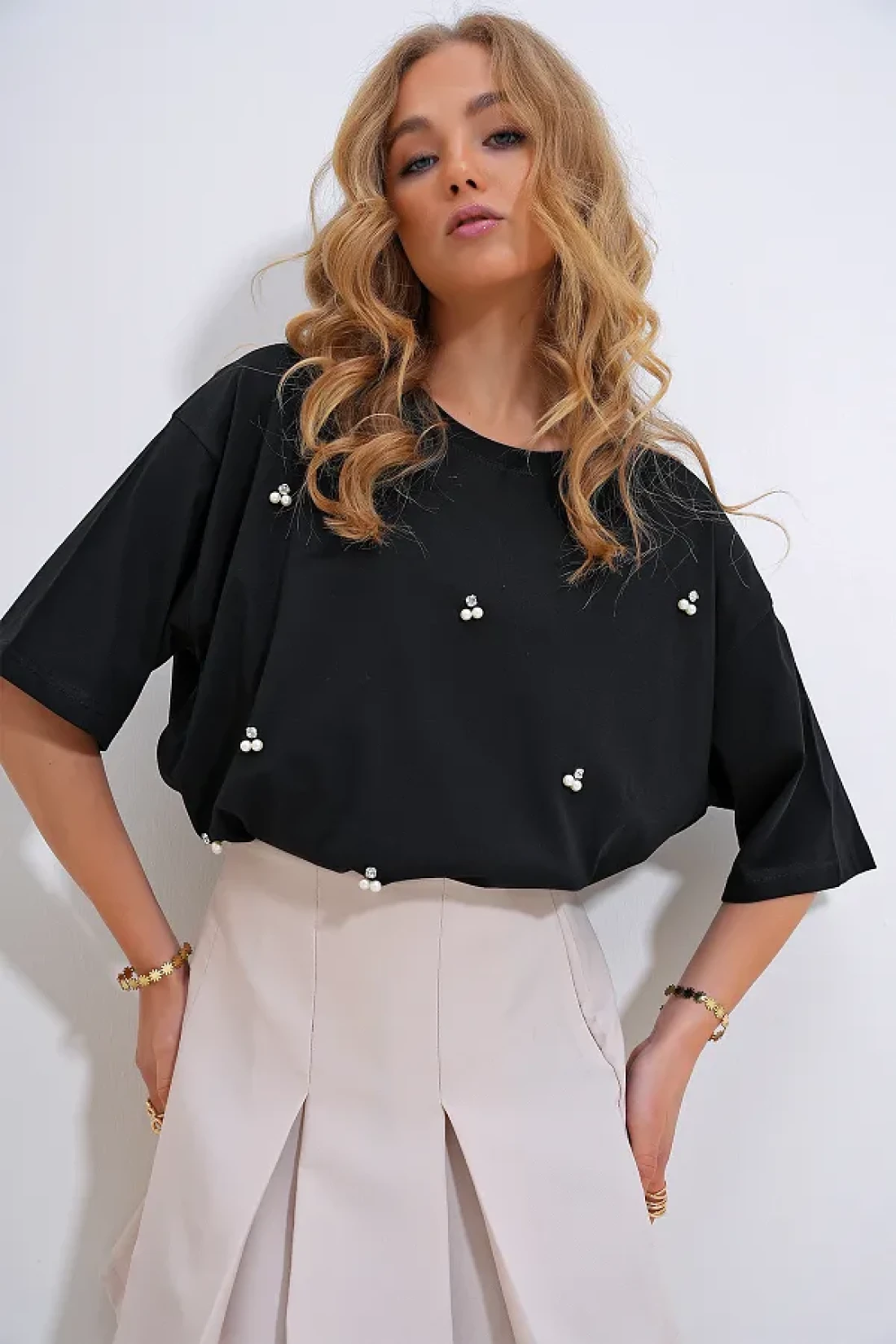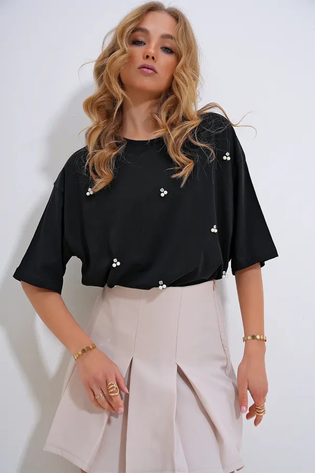 Trend Alaçatı Stili Women's Black Crew Neck Oversize Pearl and Stone Embroidered T-Shirt ALC-X11964