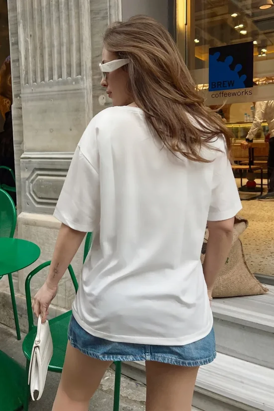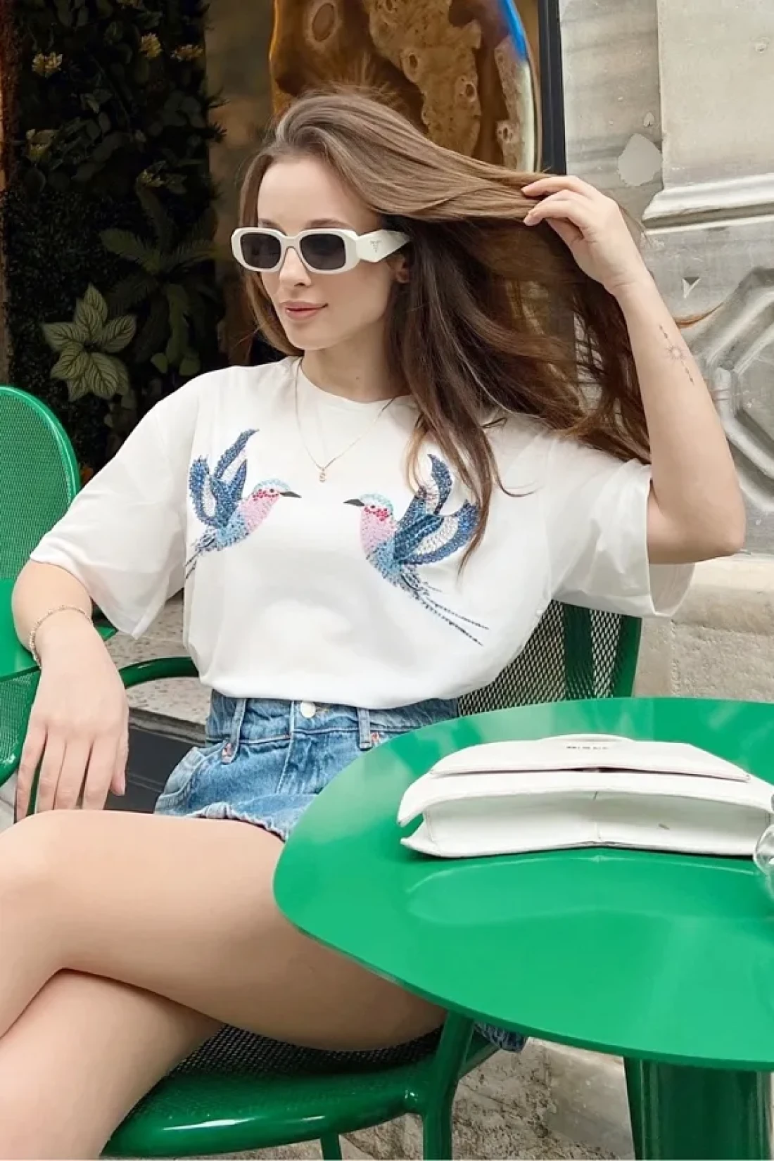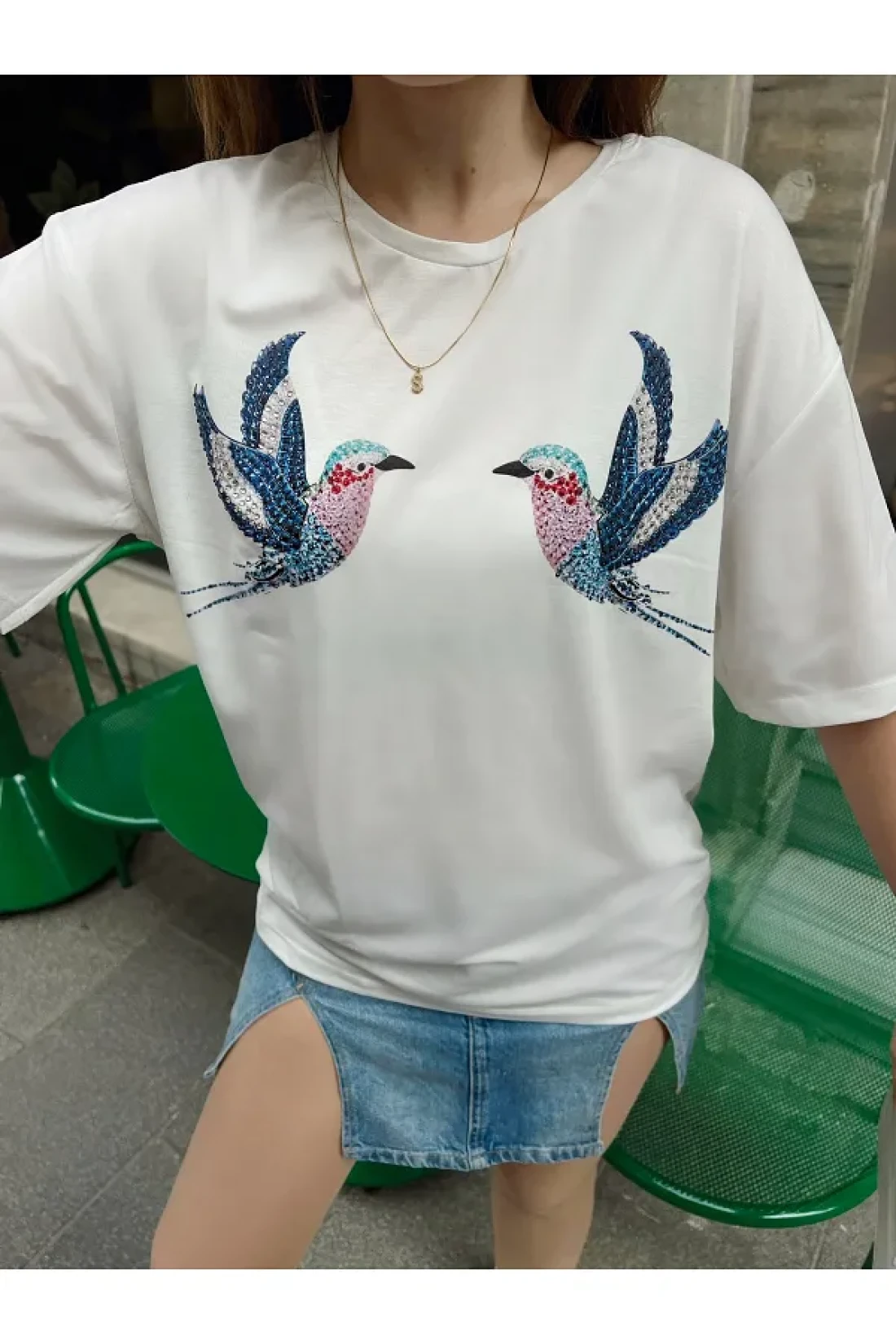Bianco Lucci Women's Bird Patterned Combed Cotton Tshirt