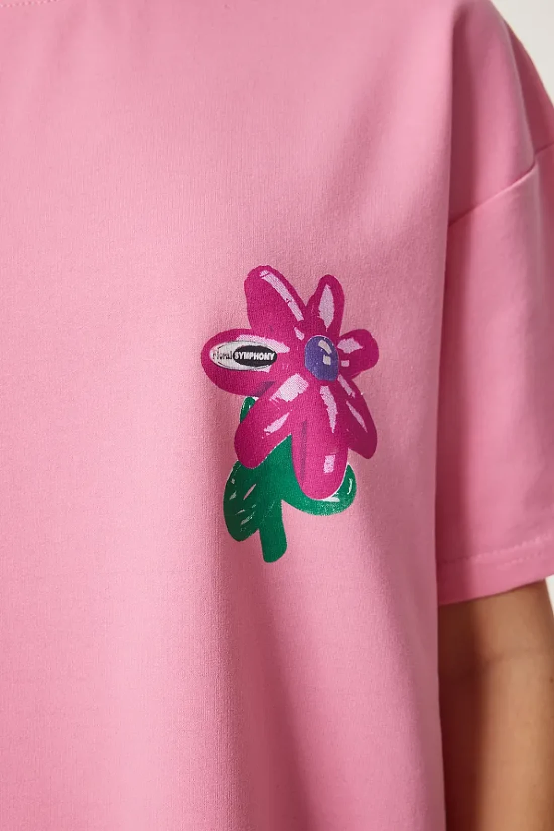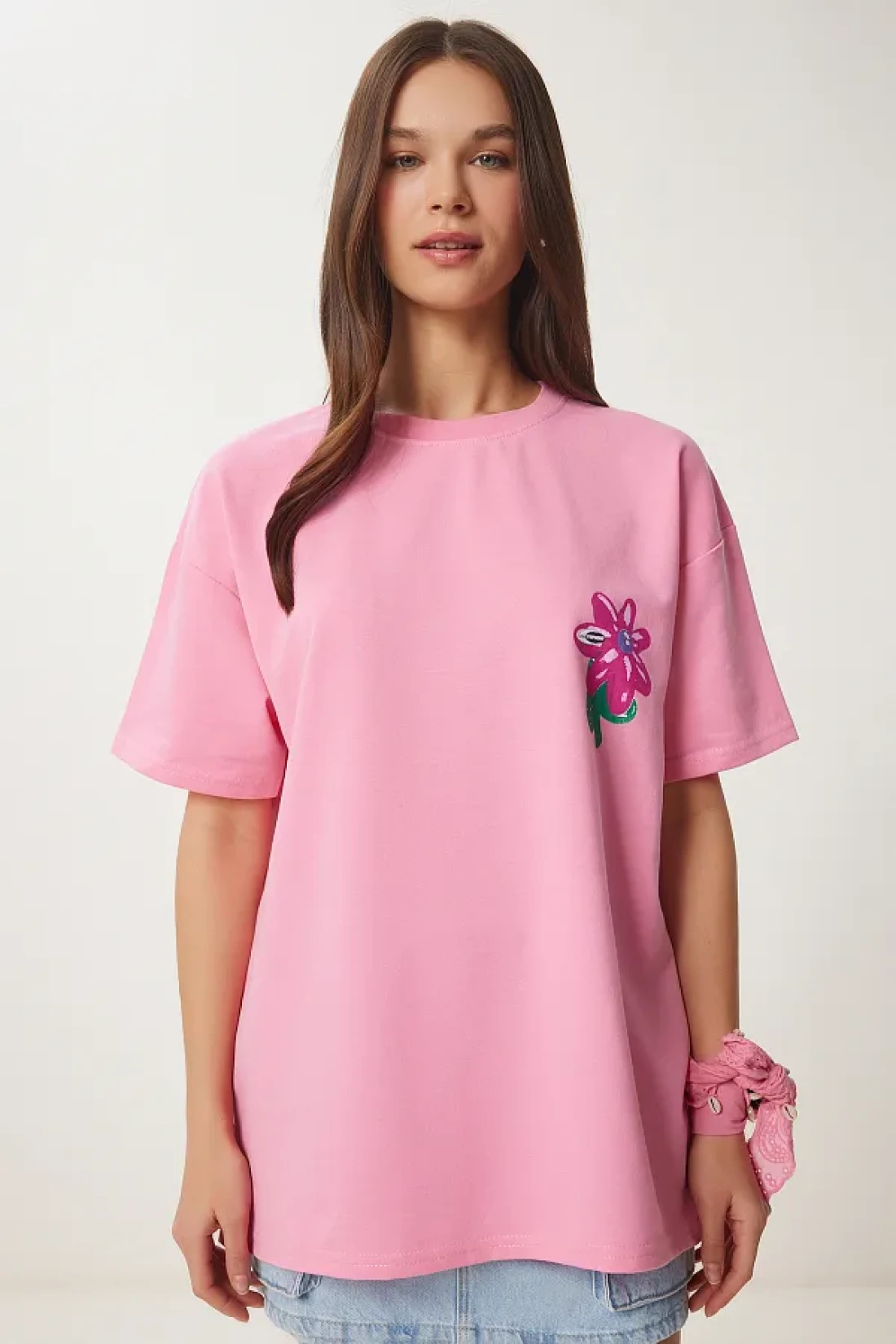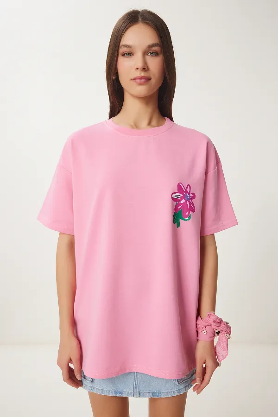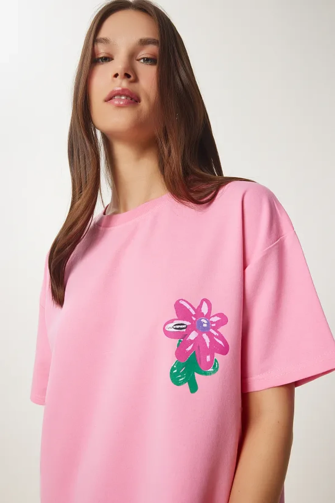 Happiness İstanbul Women's Pink Flower Printed Oversize Knitted T-Shirt Zv00282