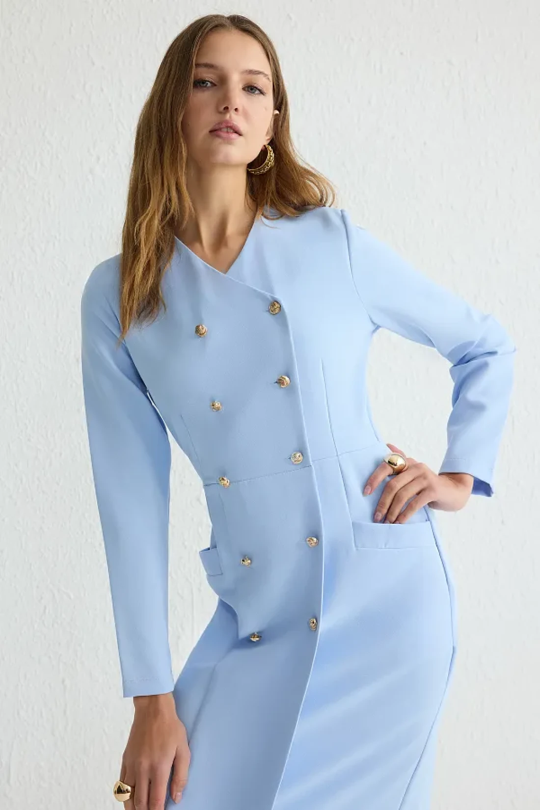 Modest Blue Button Woven Fabric Dress Tctss25Eb00027