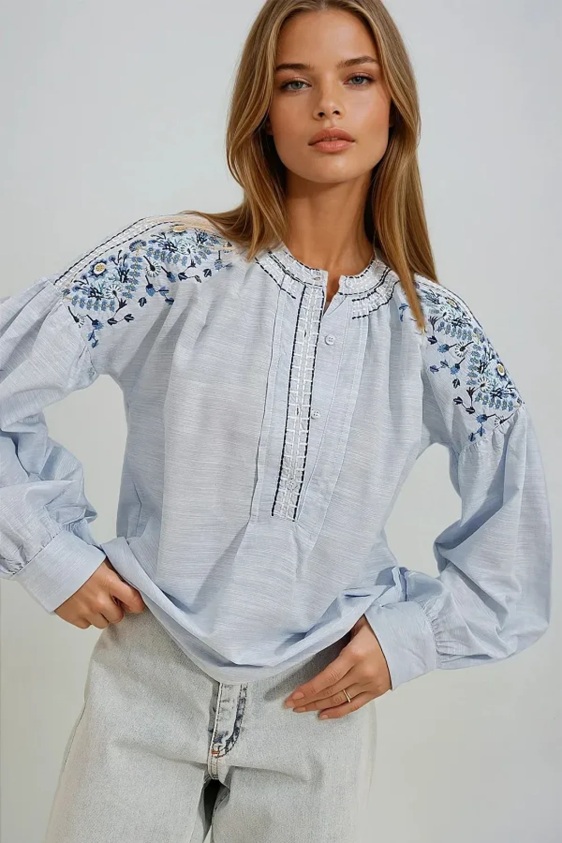 VAGGON Women's Blue Crew Neck Shoulders Embroidery Button Front Terry Cotton Blouse