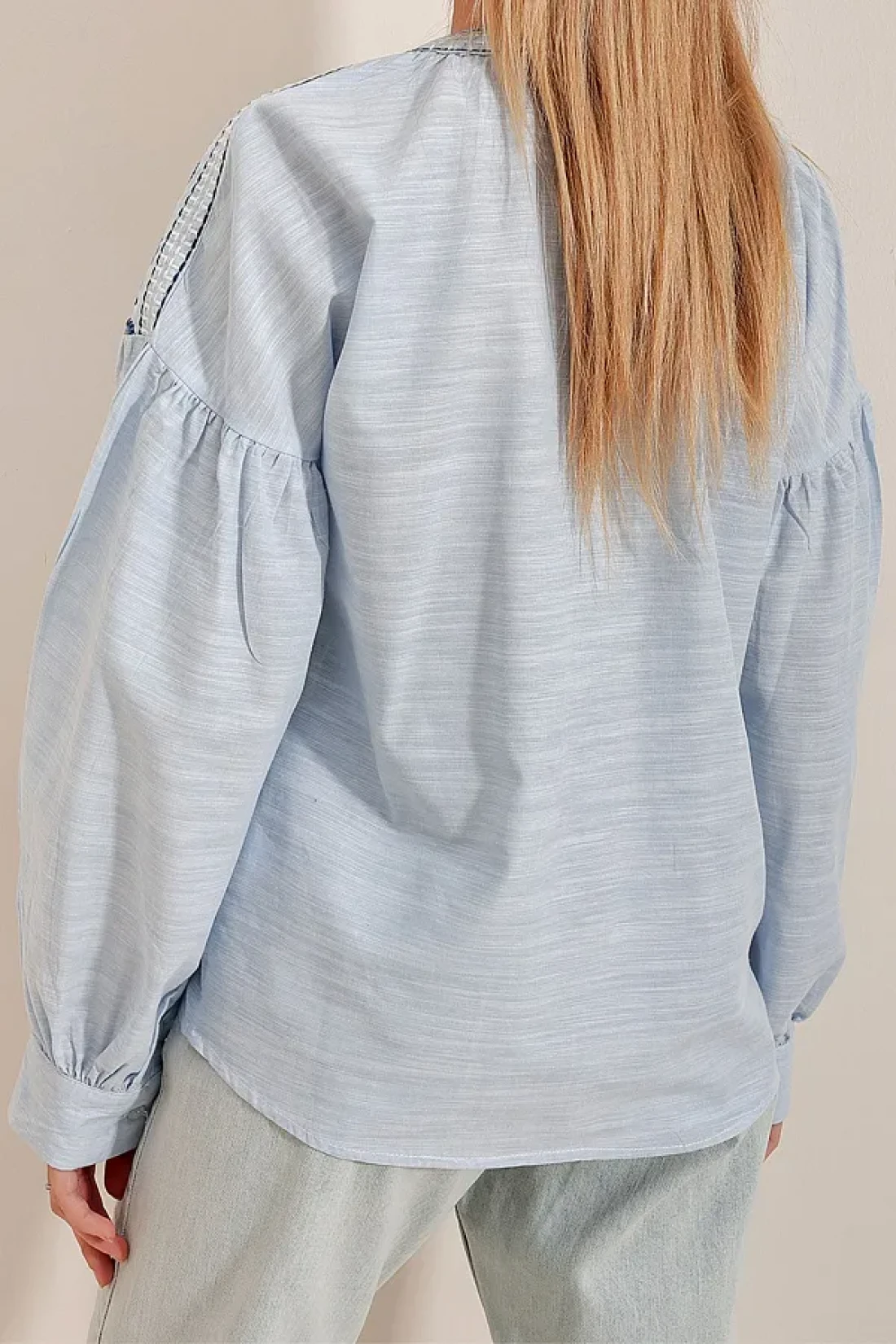 Trendy design, quality fabric, elegant bicycle collar design that should be in your wardrobe in every season, high waist jean pants, high waist woven pants, jogger pants, faux leather pants, woven leggings, shorts and skirts you can complete with your casual or classic combinations, vaggon bicycle collar embroidered front button terry cotton blouse is waiting for you! ! !