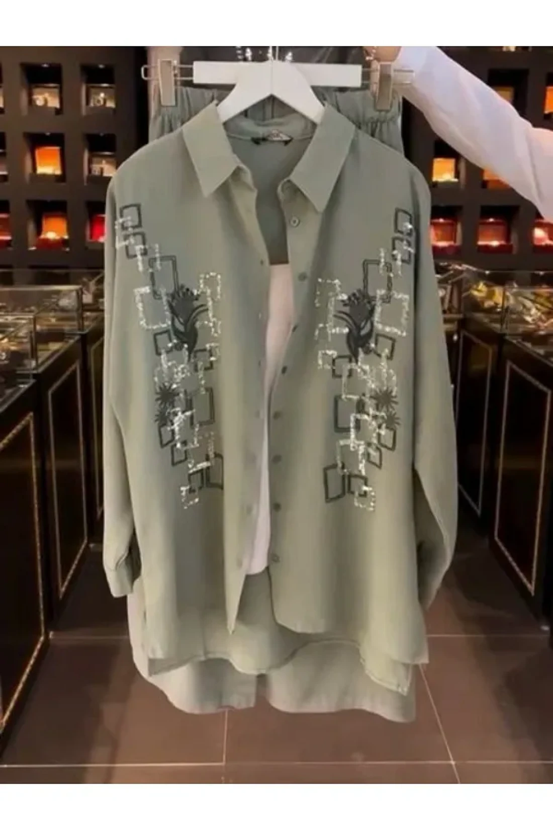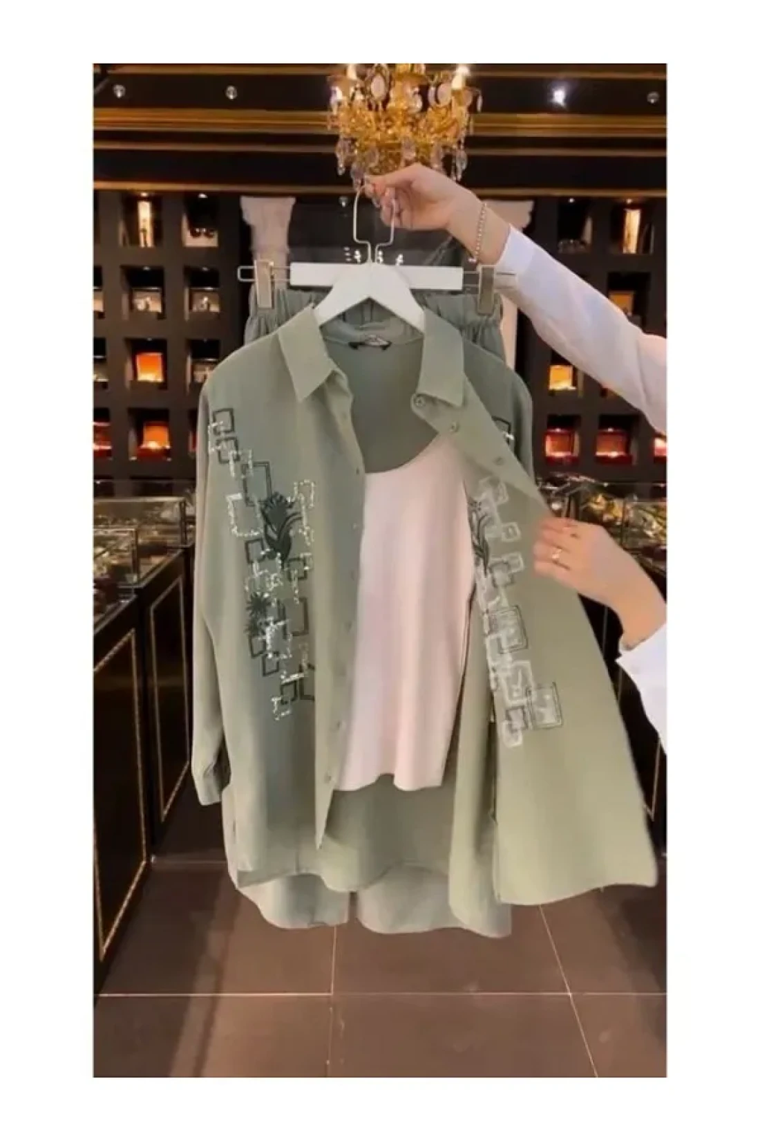 CLASSY.MODA Three-Piece Set - Shirt, Pants and Tank Top Scale Embroidered