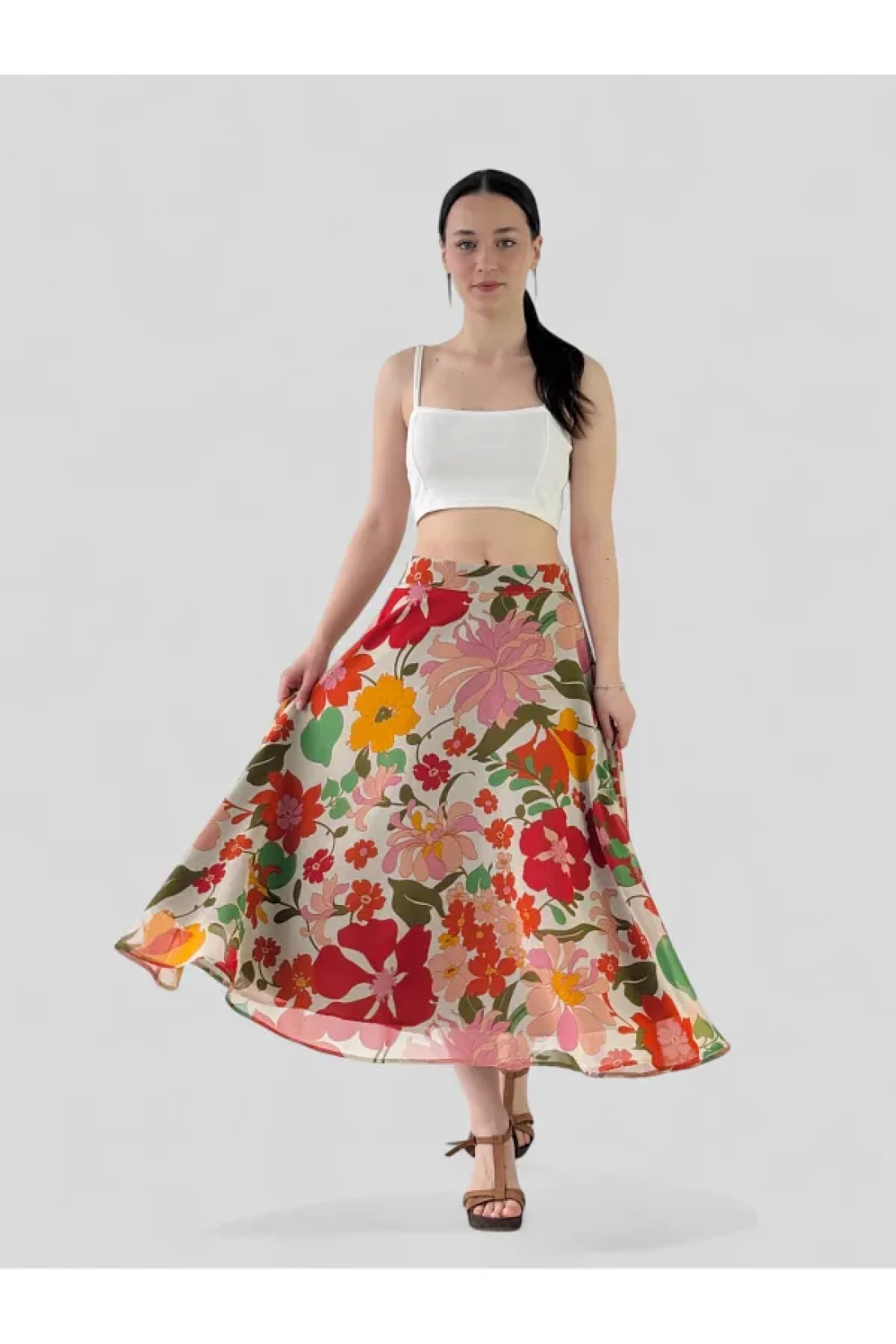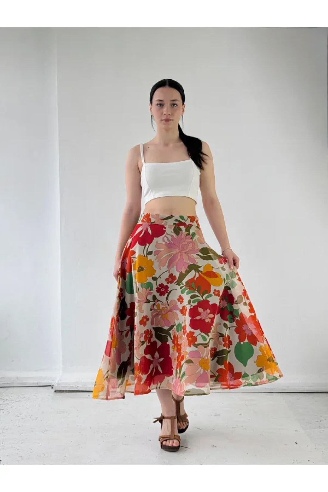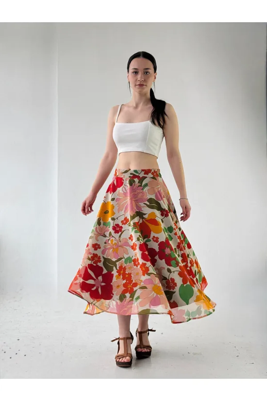 with its long length, this skirt combines classic and modern lines, and attracts attention with its design that suits all sizes.