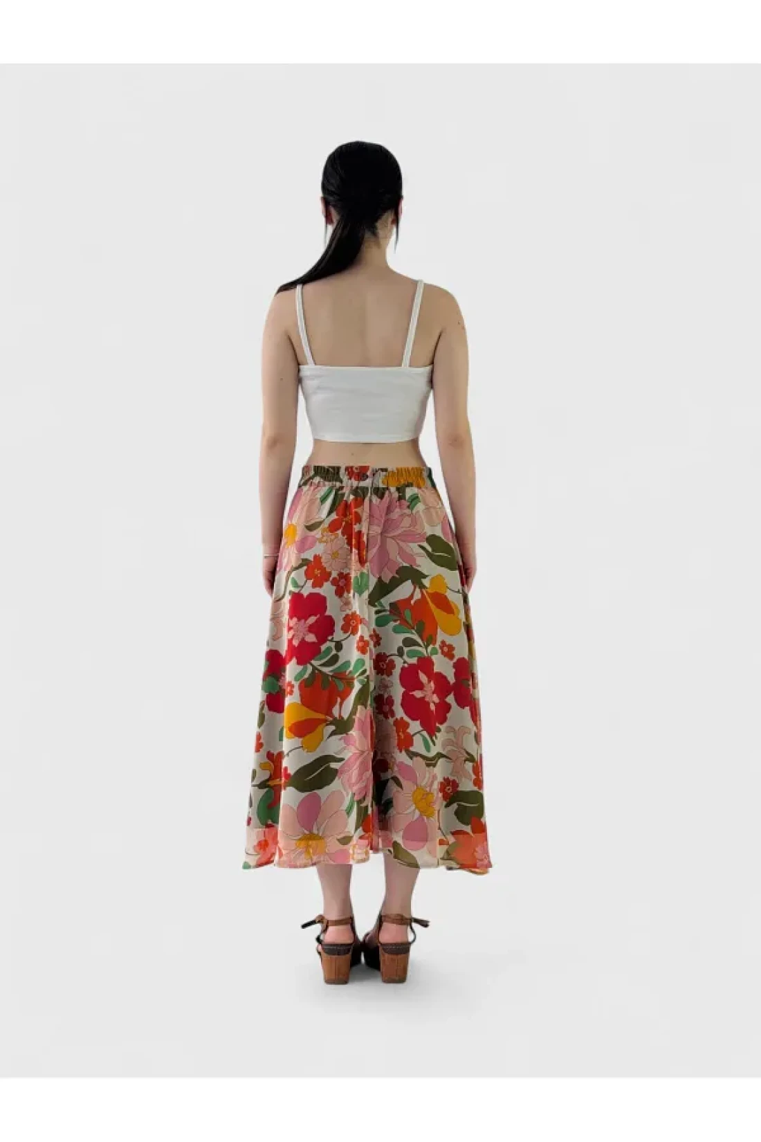 located at the perfect point with its 80 cm length, this skirt offers flexibility thanks to the closed waist measurement of 64cm in the s-m size range and comfortably expands to 69-70cm with the elastic detail on the back of the waist.