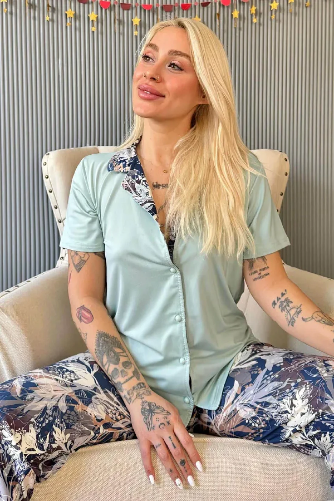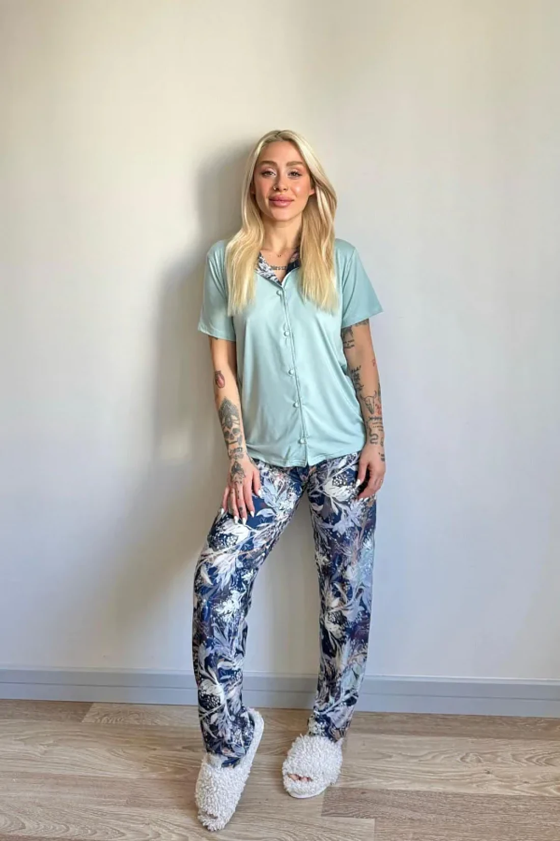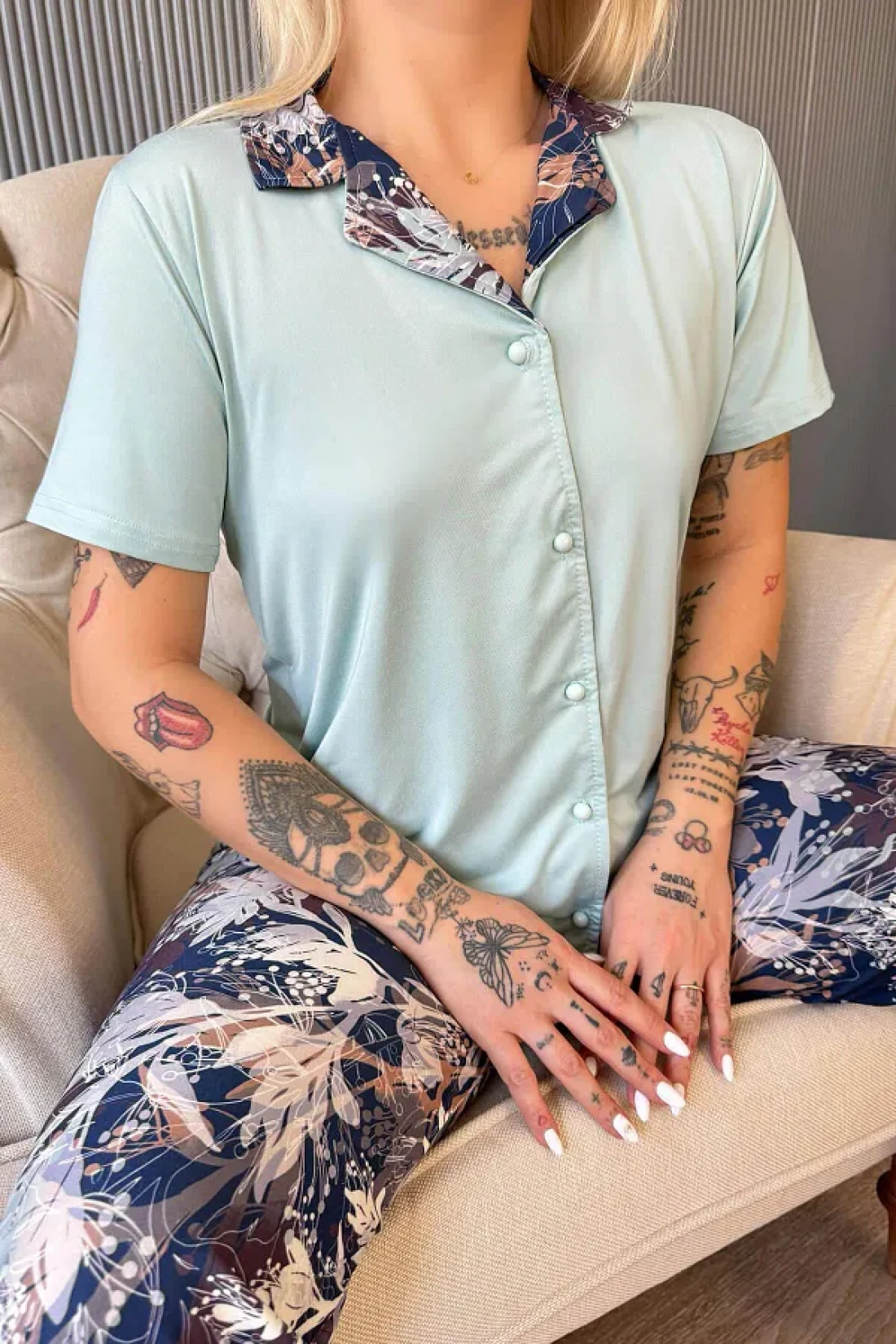 Pijamaevi Mint Florado Exclusive Front Buttoned Short Sleeve Women's Pajamas Set