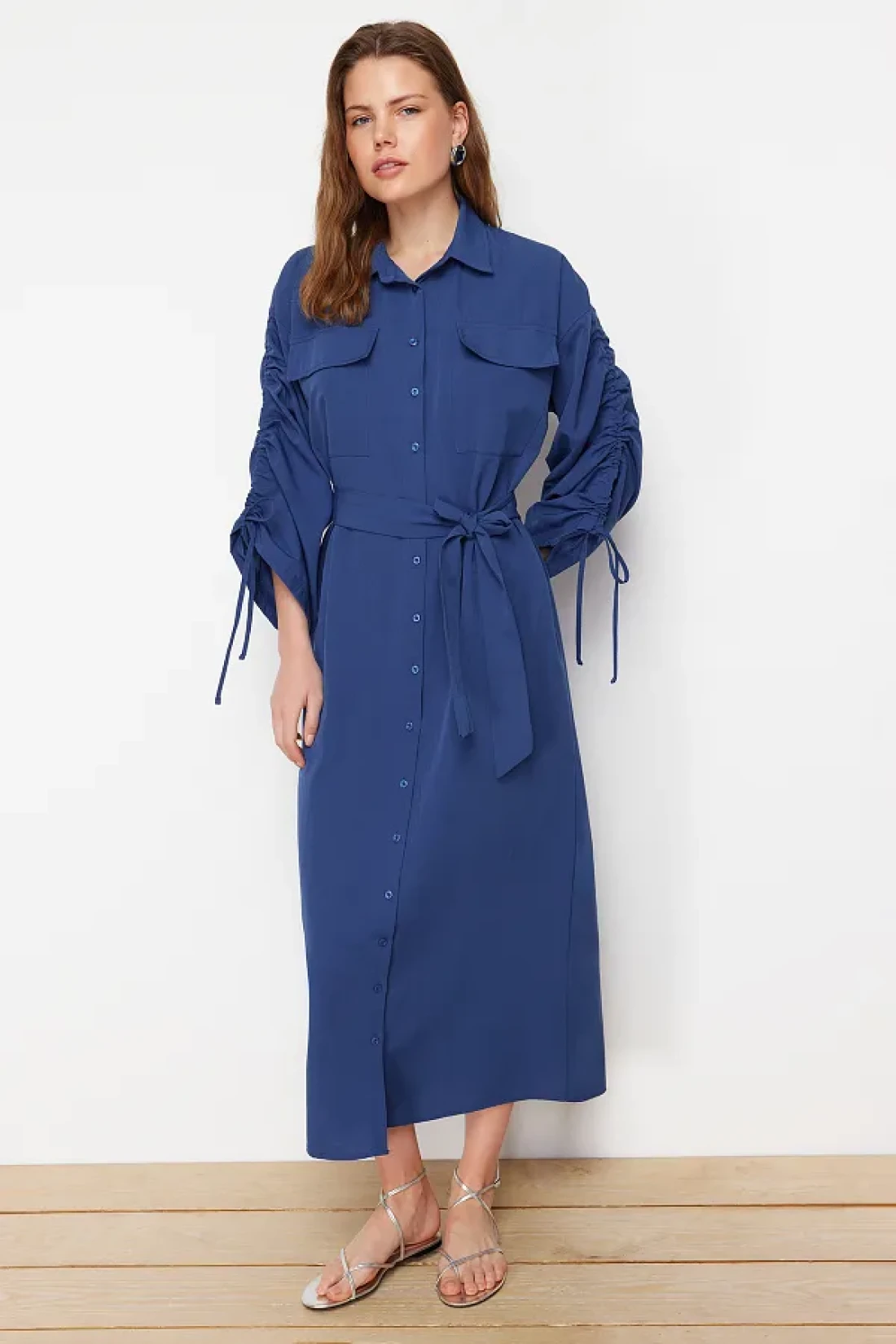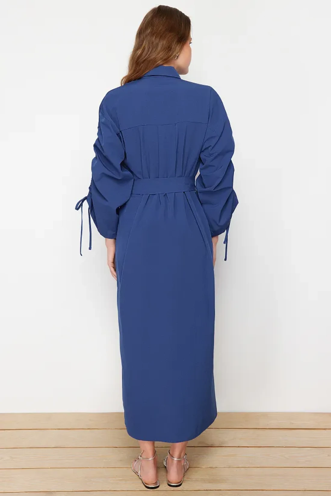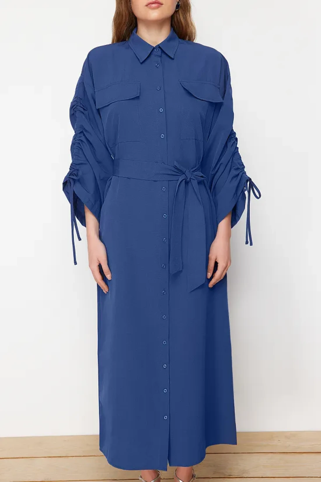 Modest Saks Cotton Shirt Dress with Adjustable Sleeves and Belted - TCTSS23EB00365