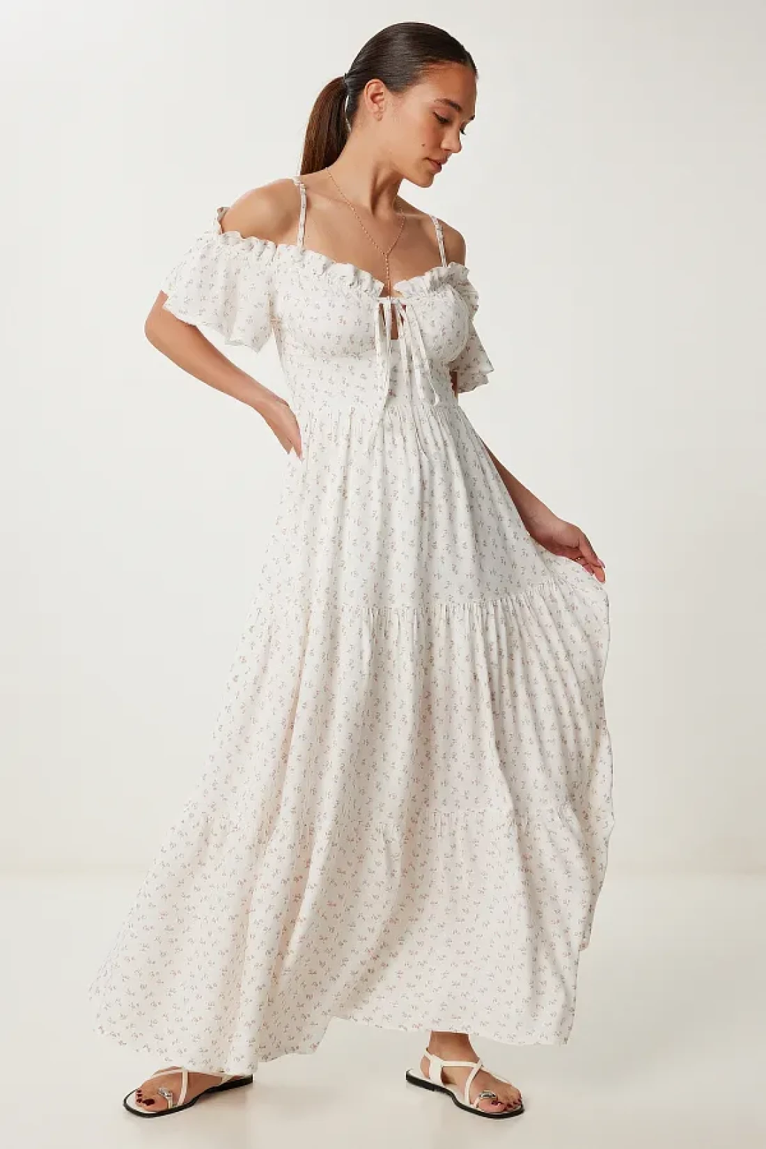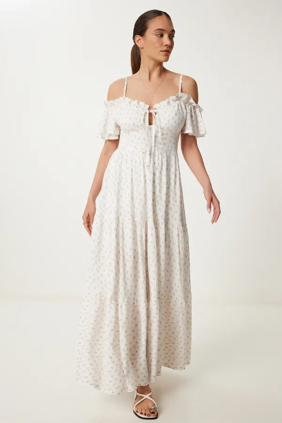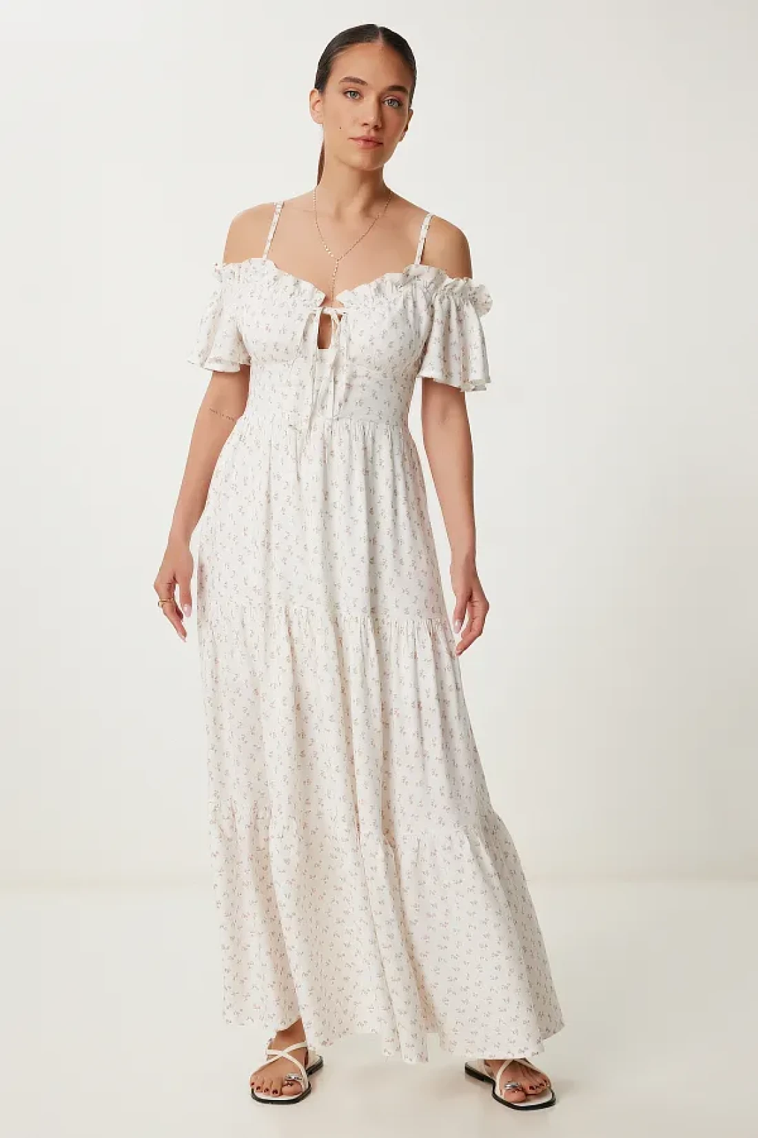 Lovelyİstanbul Patterned Strappy Ruffled Long Summer Viscose Dress Ecru Murdum Lub0112