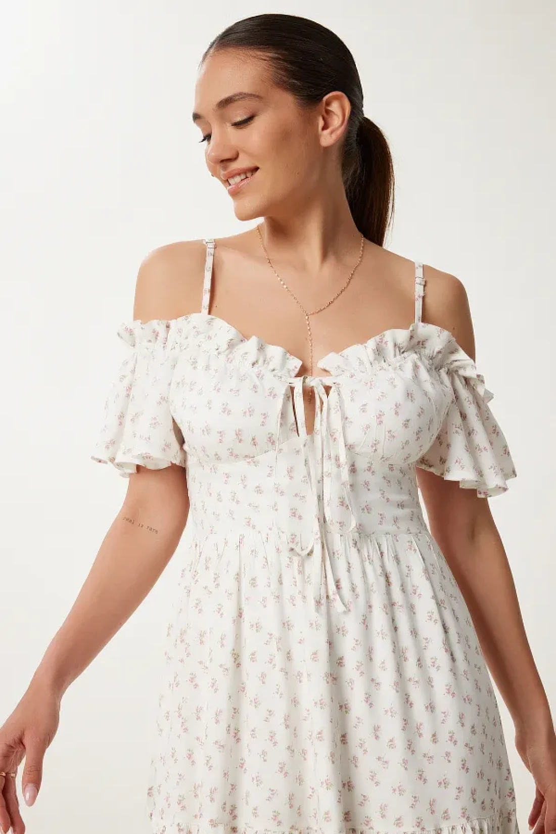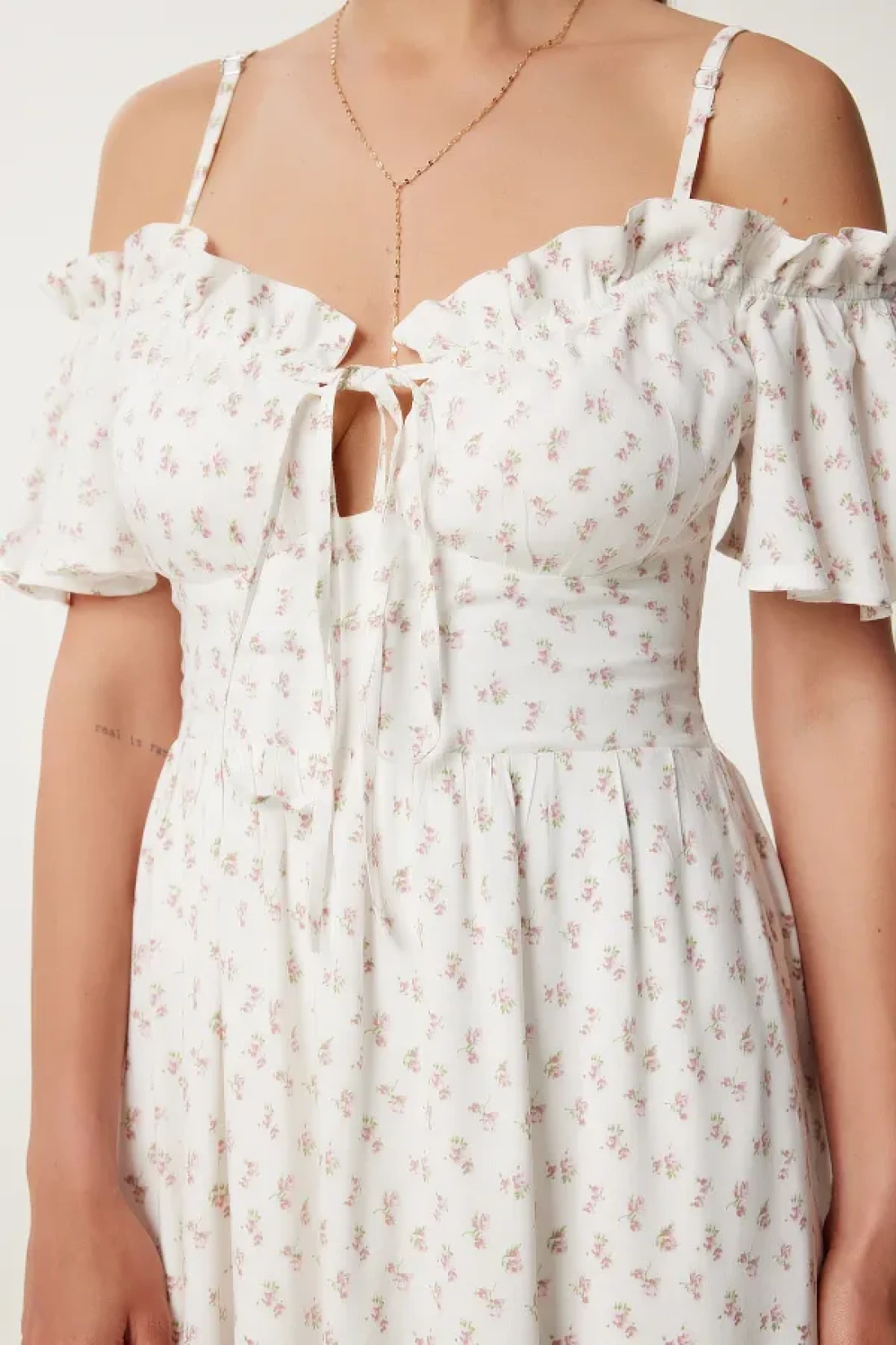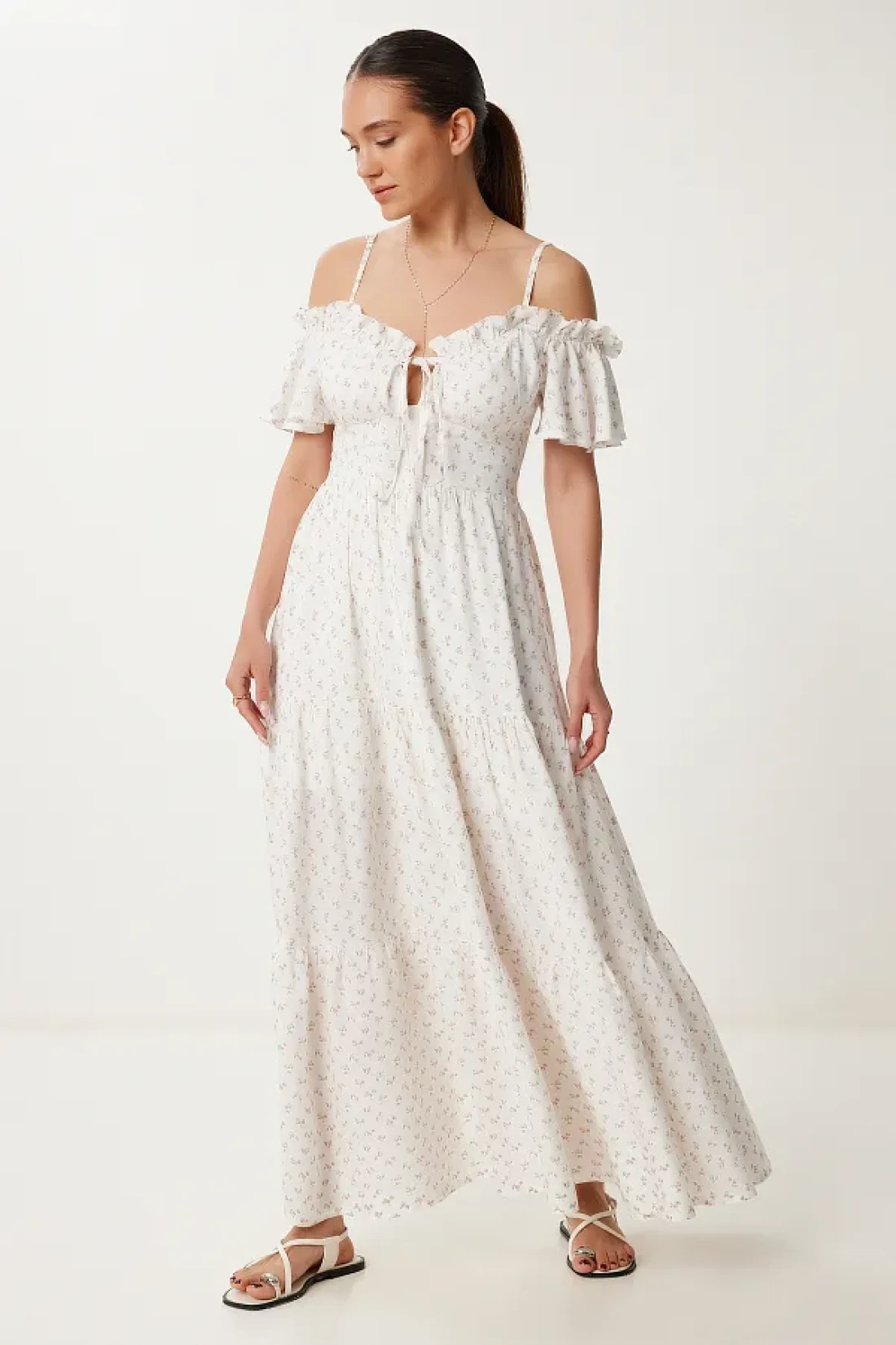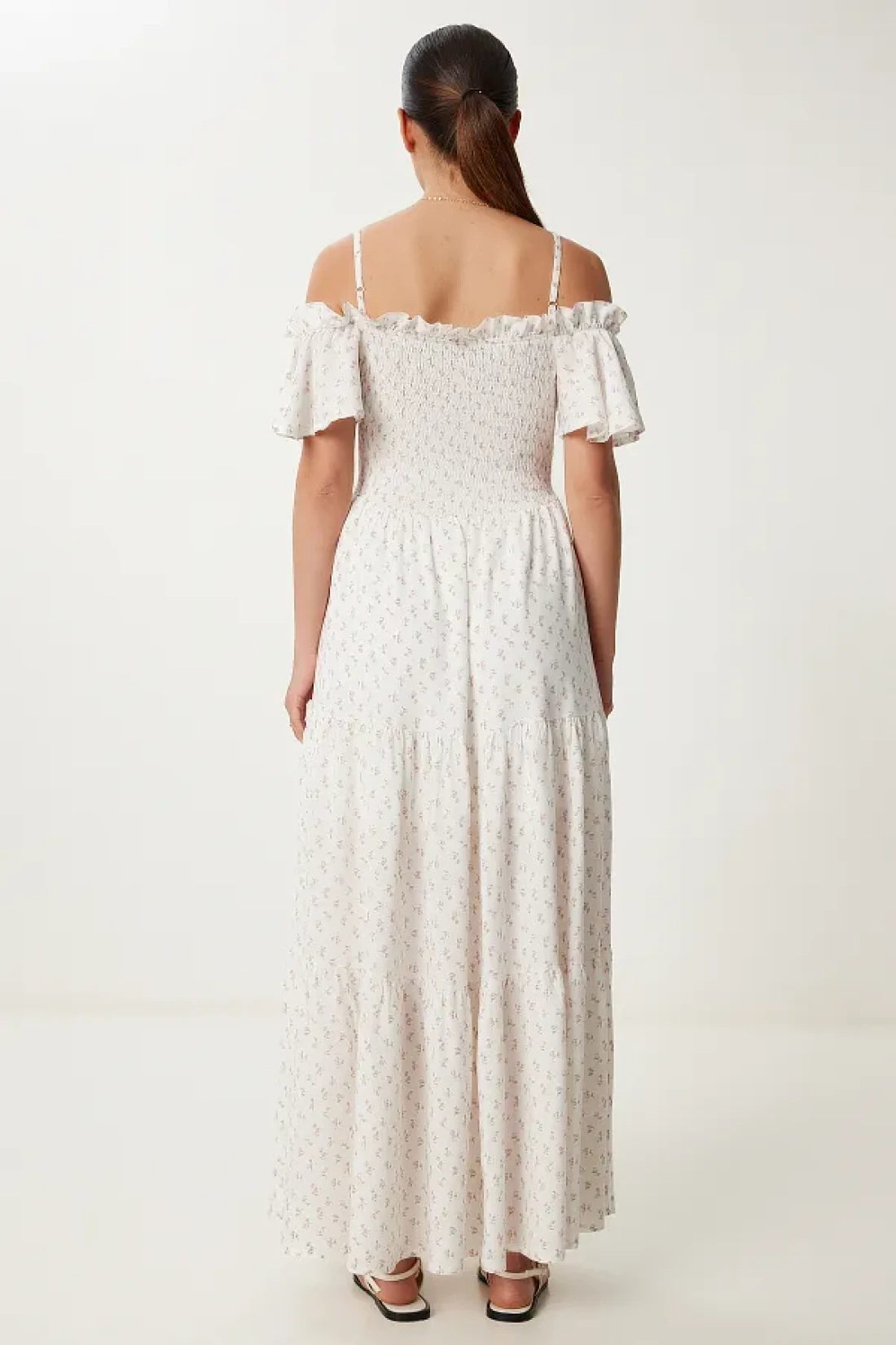 Lovelyİstanbul Patterned Strappy Ruffled Long Summer Viscose Dress Ecru Murdum Lub0112