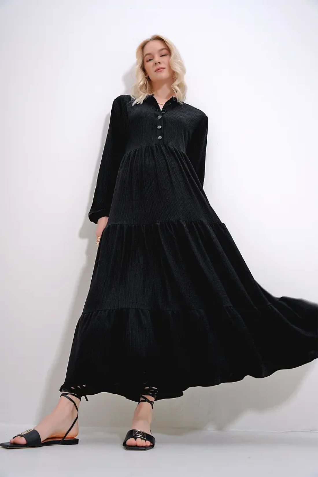 Trend Alaçatı Stili Women's Black High Collar Buttoned Front Layered Flounced Crinkle Dress ALC-X12050