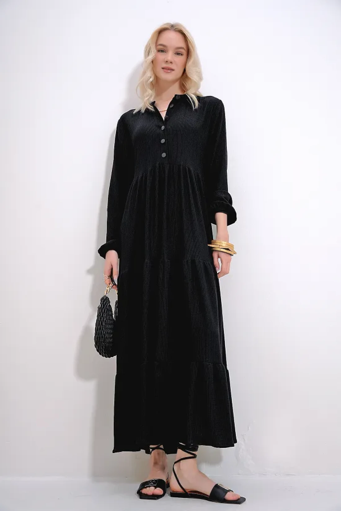 The black judge collar dress, offering elegance and comfort together with its buttoned front design, is ideal for daily use. Thanks to its plain pattern, it provides a simple and timeless look, it can be easily combined with any accessory