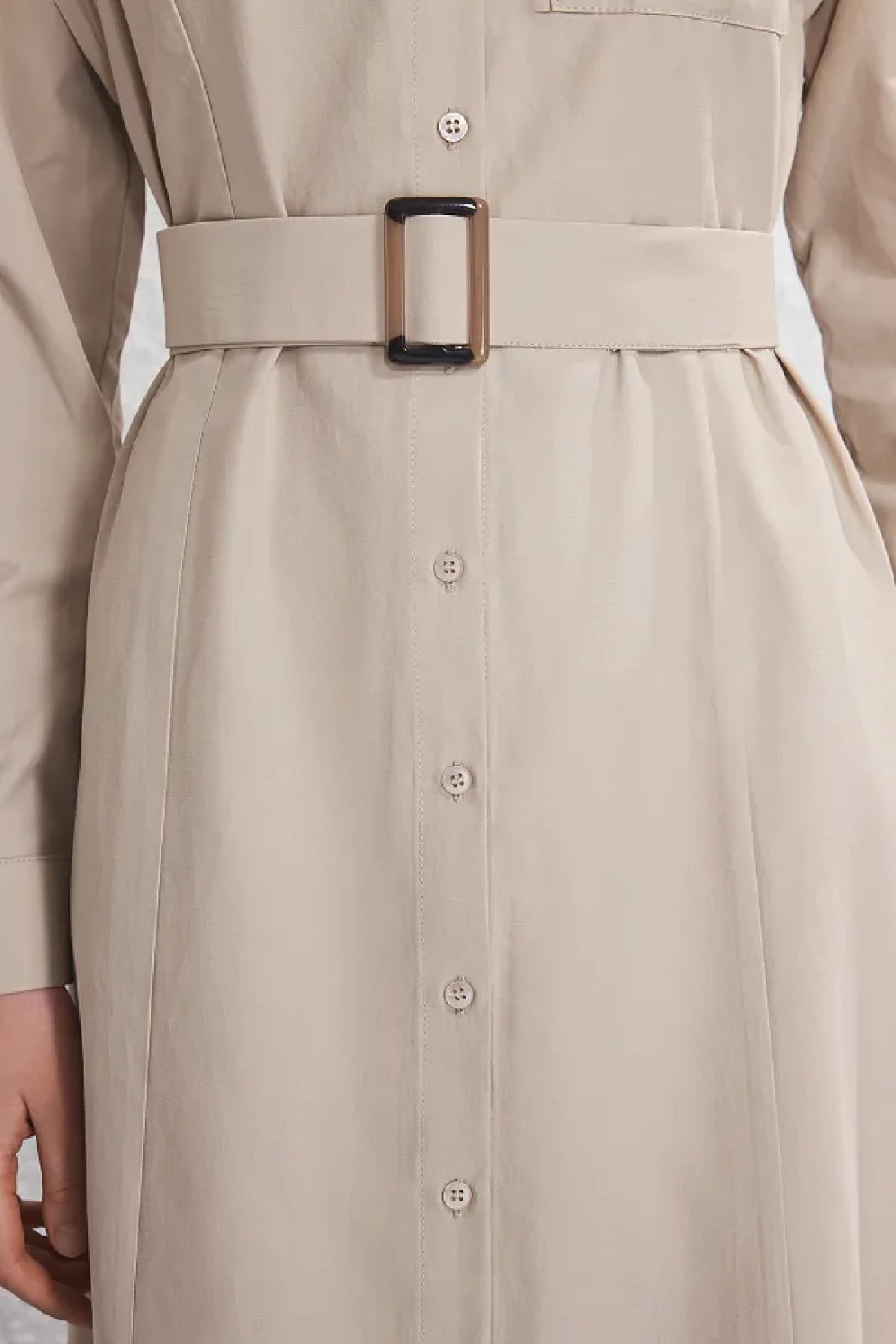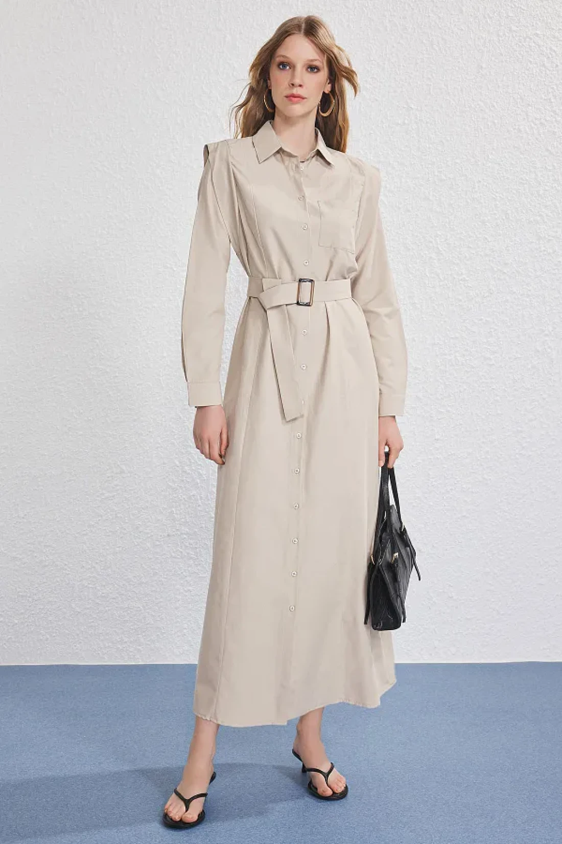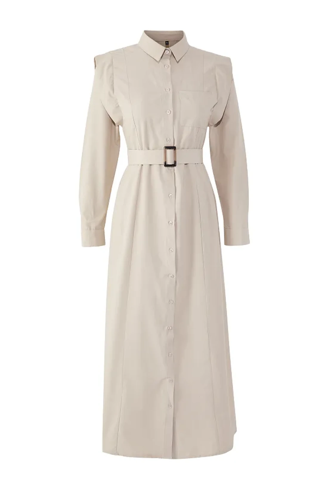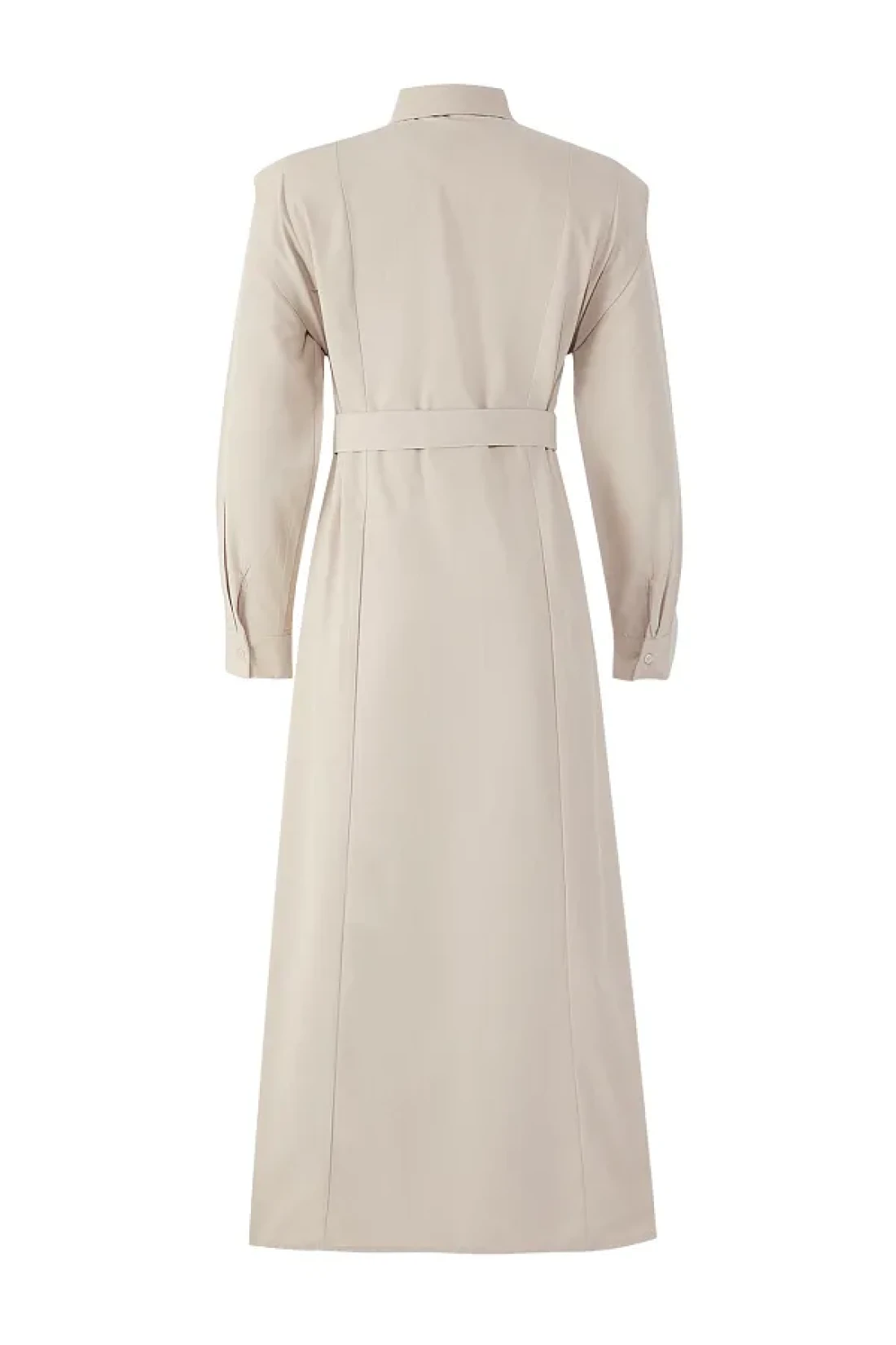 Modest Beige Belt Buckle Detailed Woven Terrycotton Dress Tctss25Eb00134
