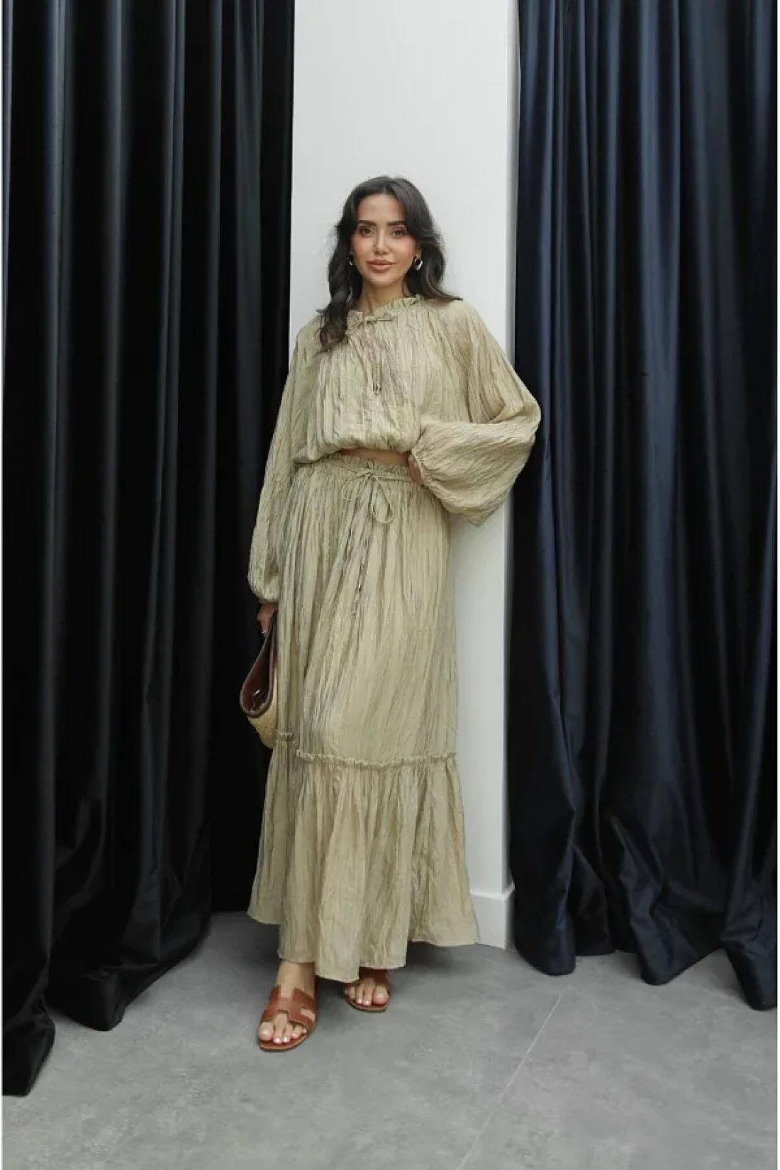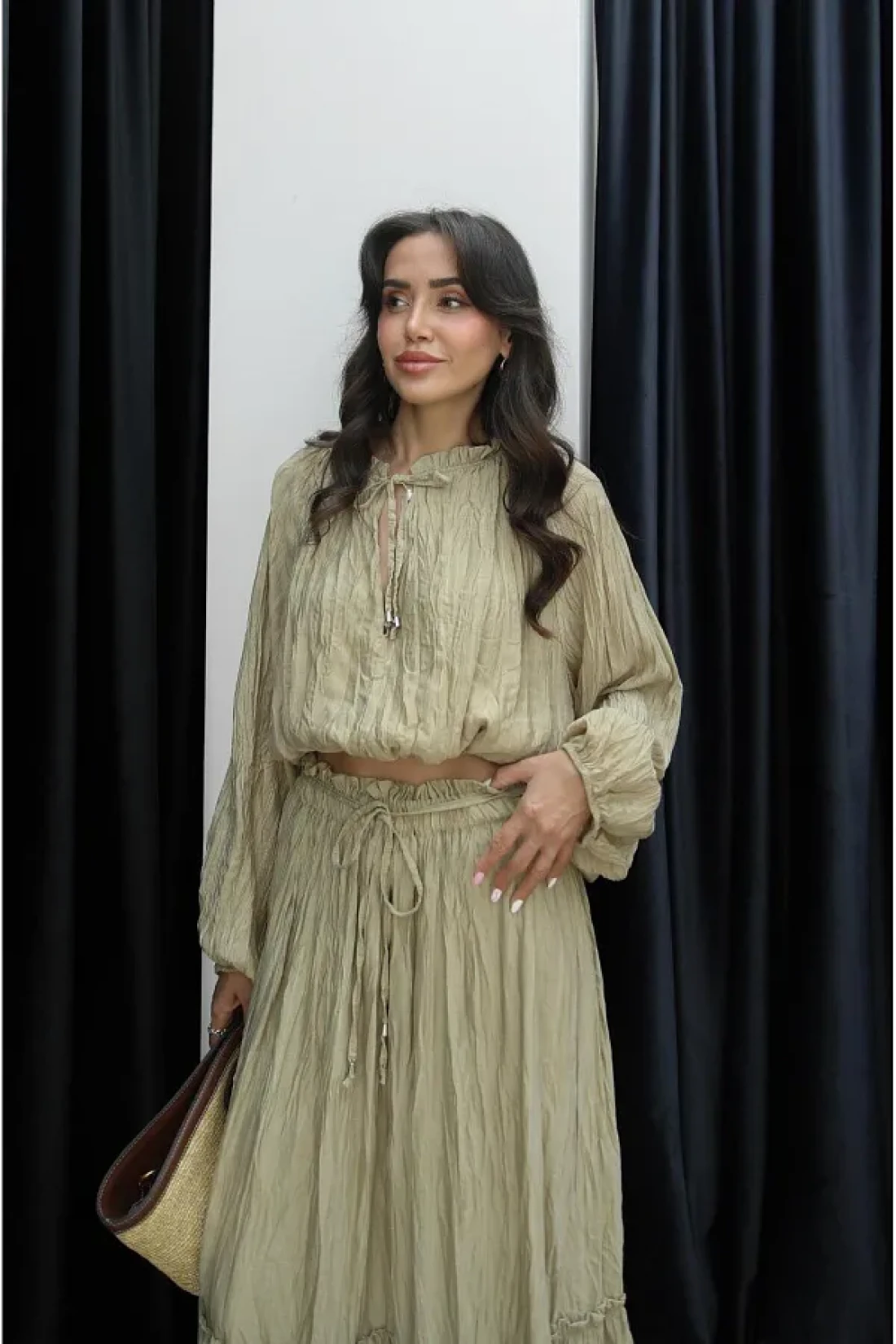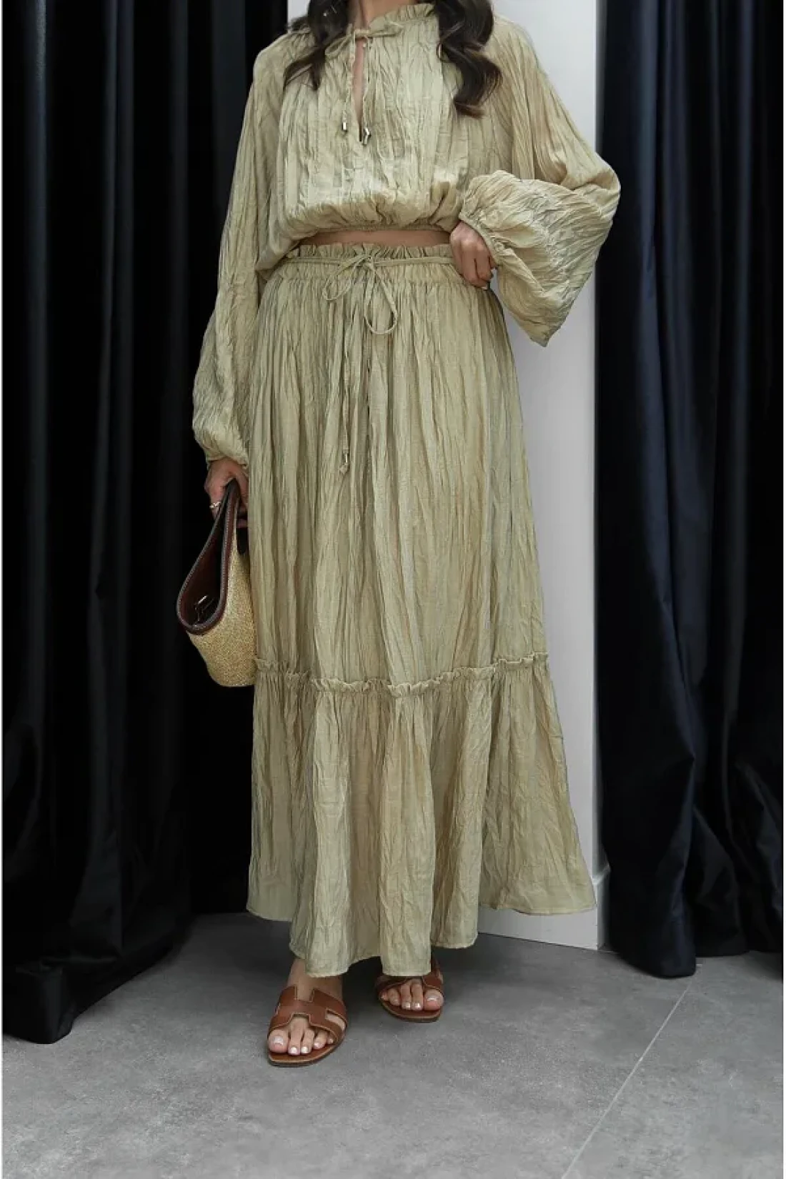 Bak'ap Premium Wrinkle Pattern Flounced Ruffled Trend Shirt Blouse-Long Skirt 2-Piece Set