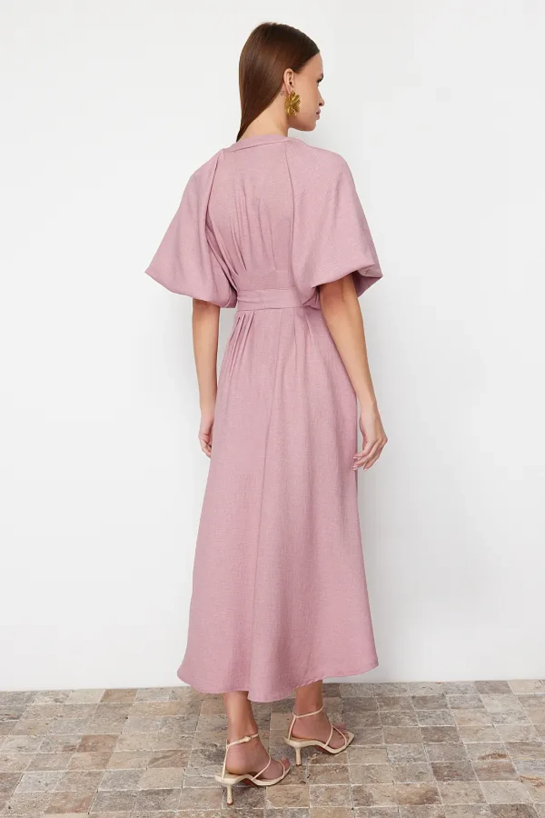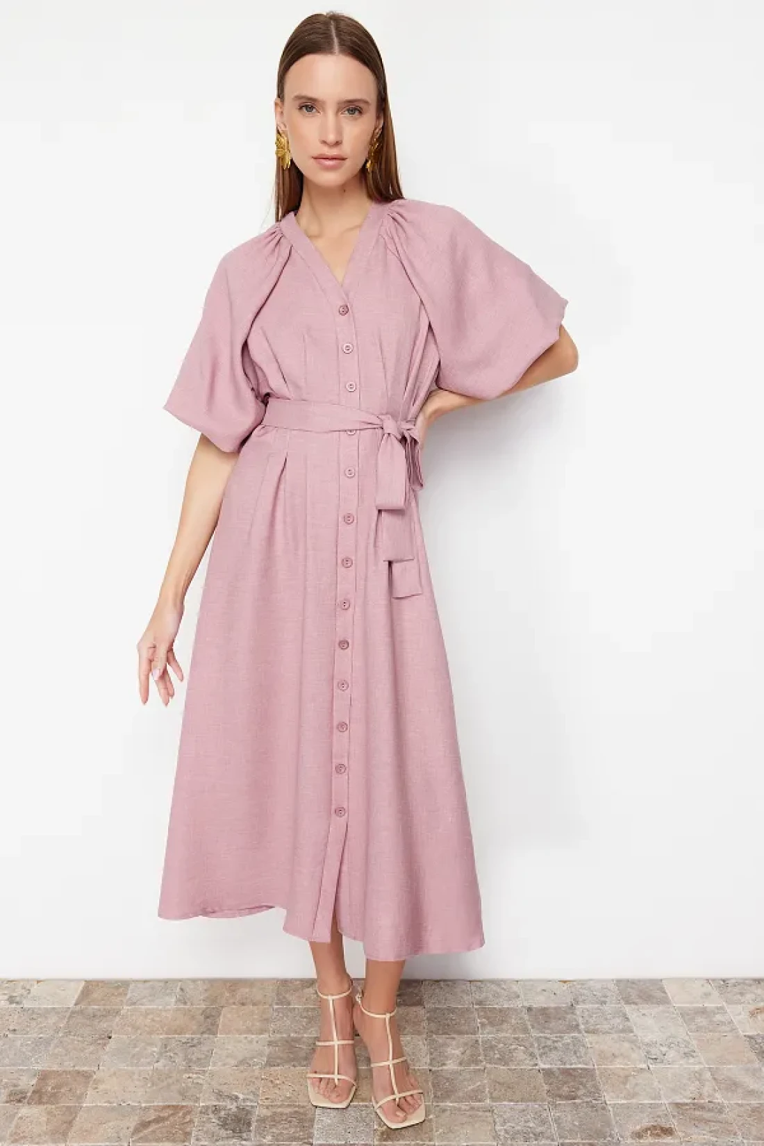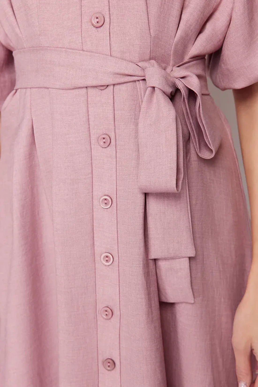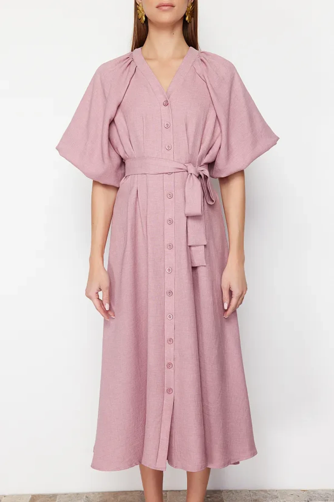 Modest Pink Belted Half Balloon Sleeve Linen Look Woven Shirt Dress TCTSS24EB00014