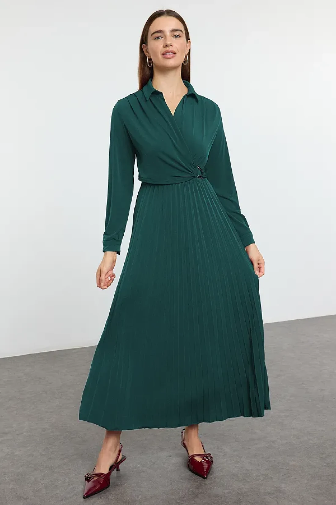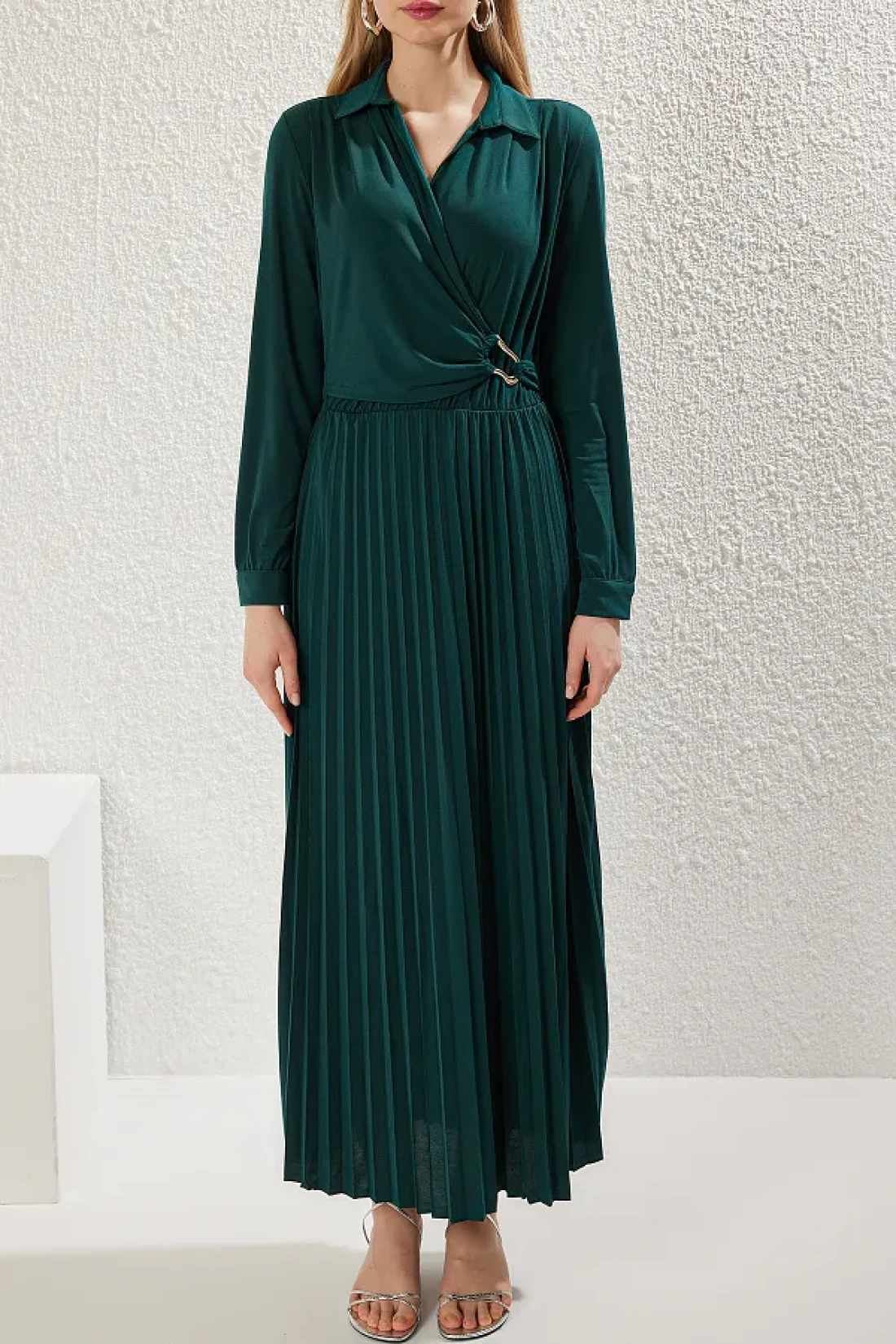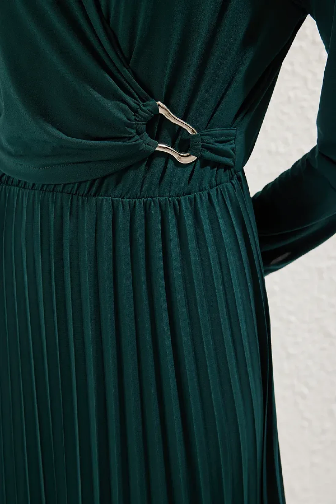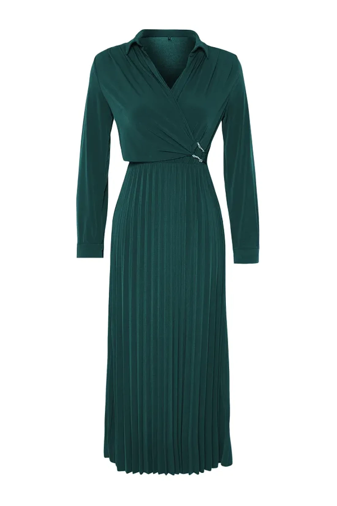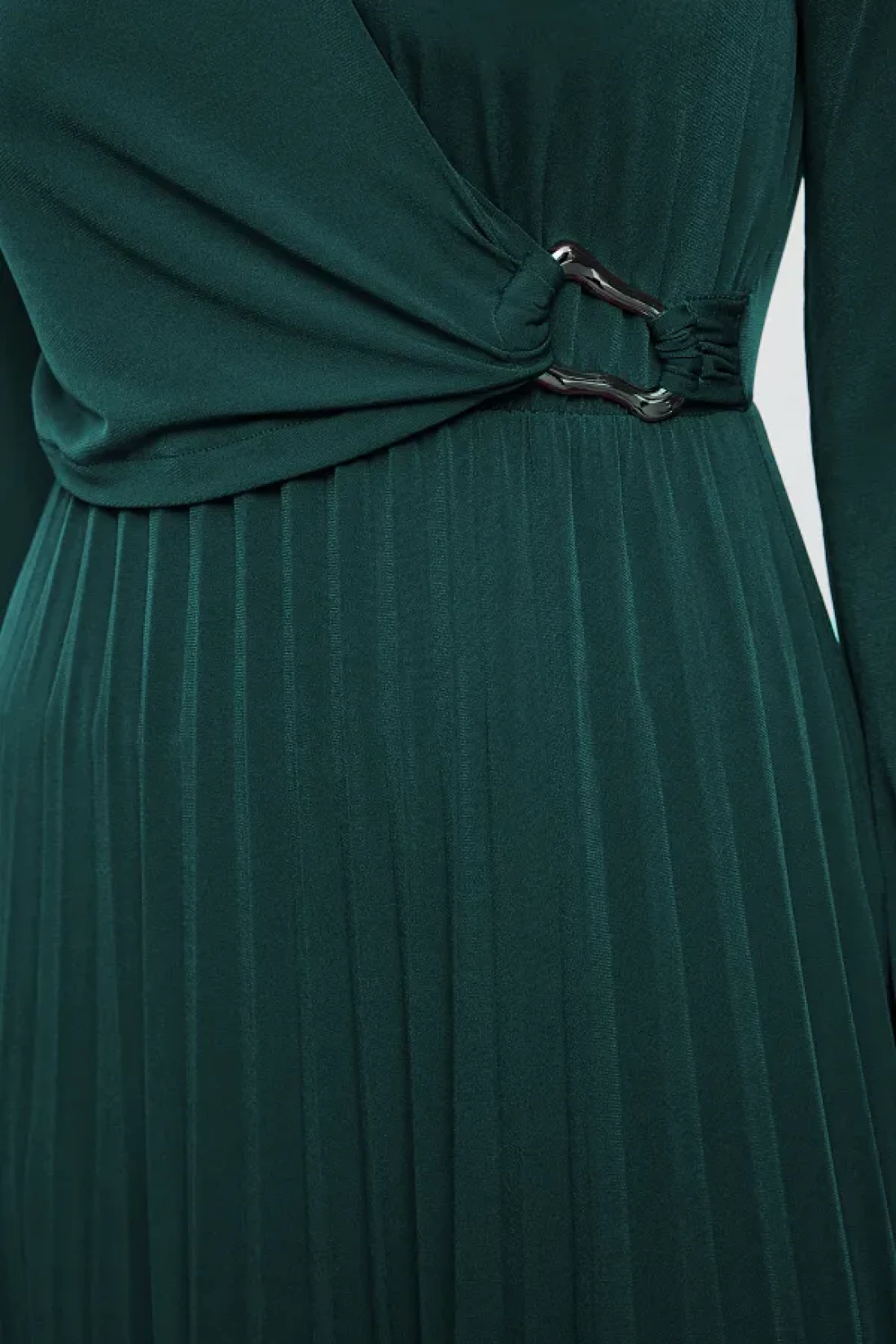 Modest Emerald Green Double Breasted Neckline Pleated Accessory Detail Knitted Dress Tctaw25Eb00138