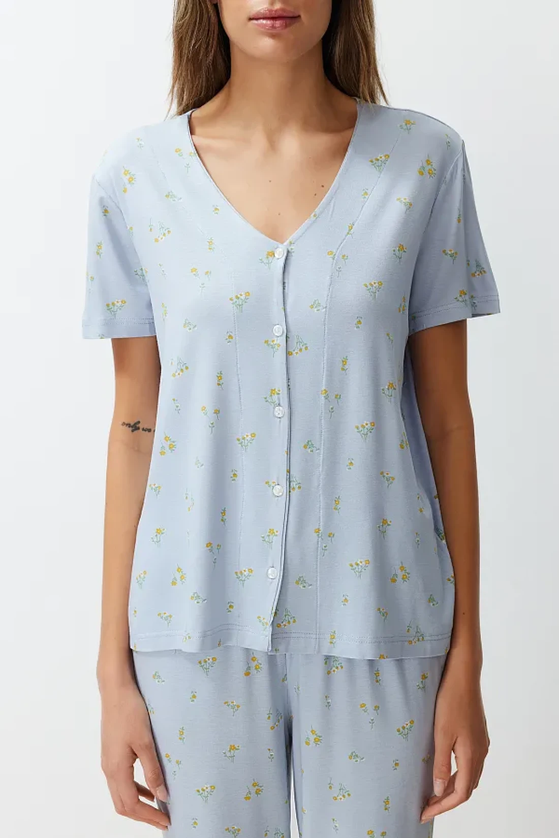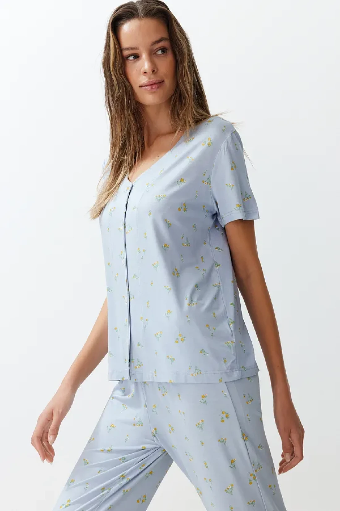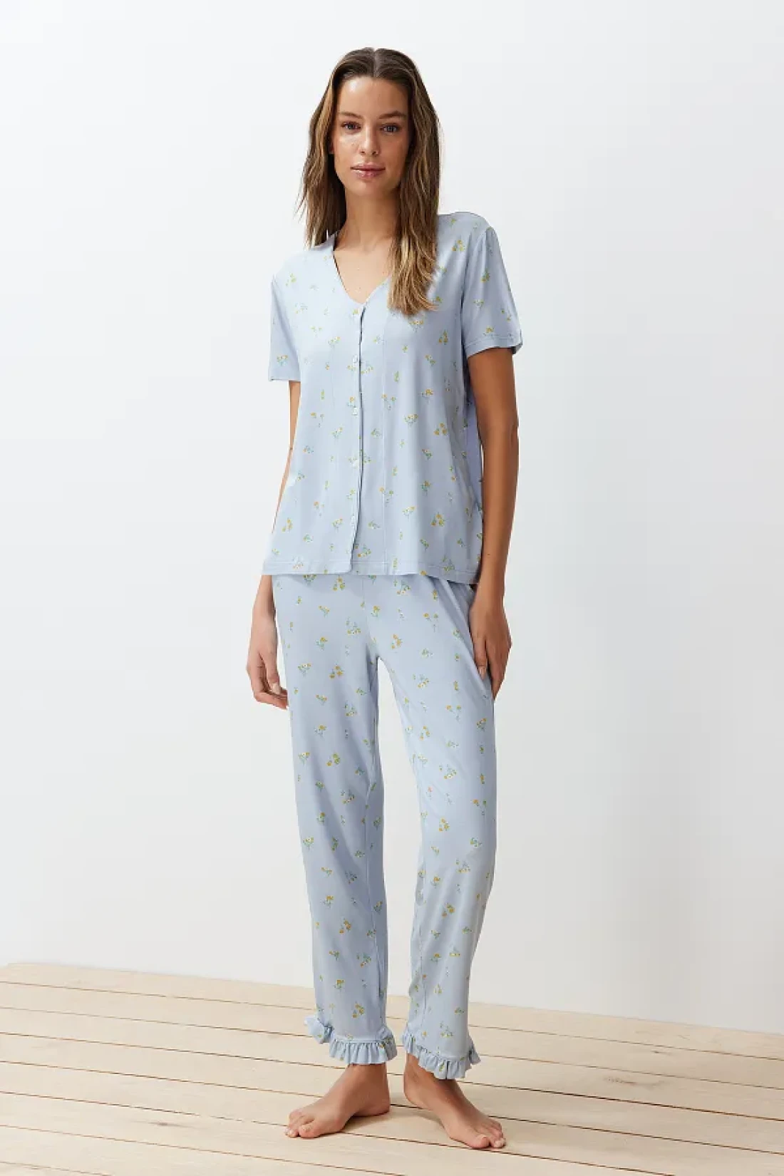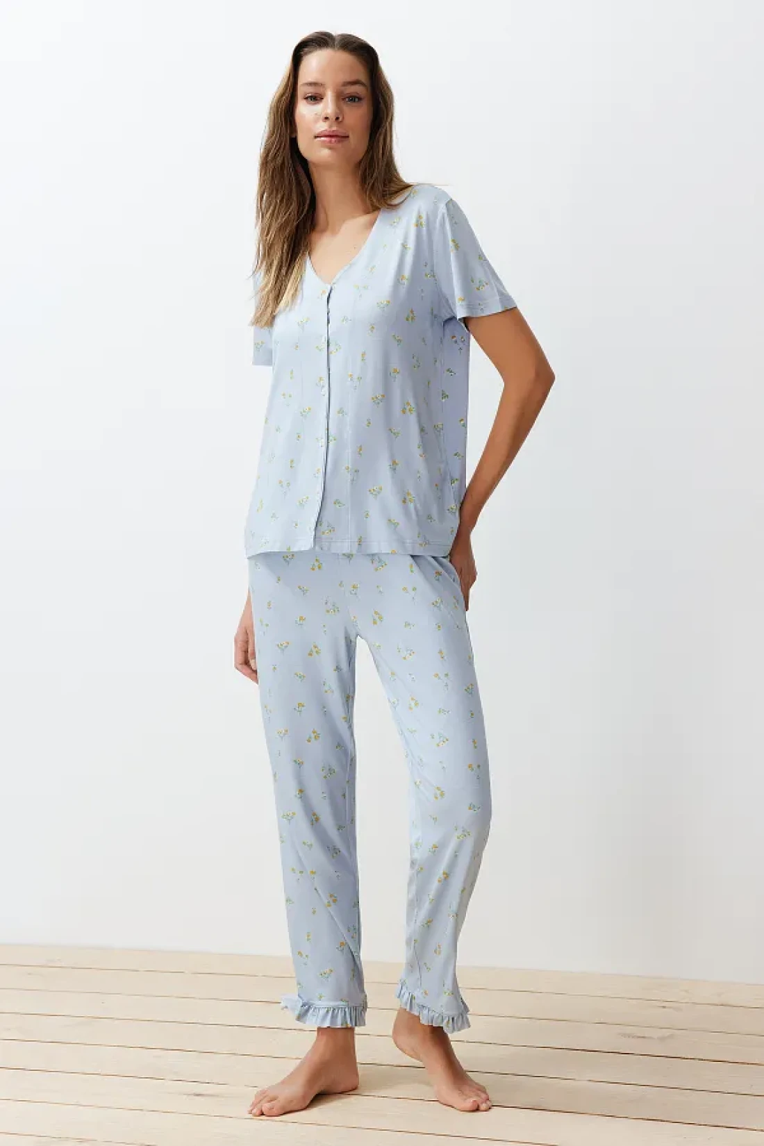 Collection Colorful Floral Pattern and Ruffle Knitted Pajamas Set - Blue THMSS24PT00232