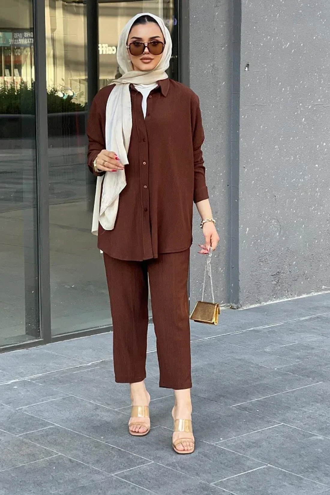 A women's hijab suit with trousers, designed specifically for the hijab clothing collection, offering comfort and elegance together. Thanks to its buttoned closure, it can be easily put on and taken off, making it suitable for daily use.