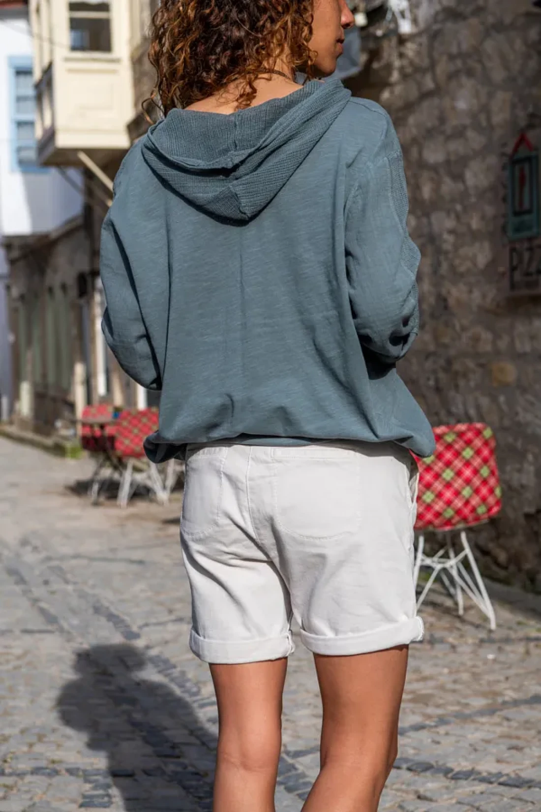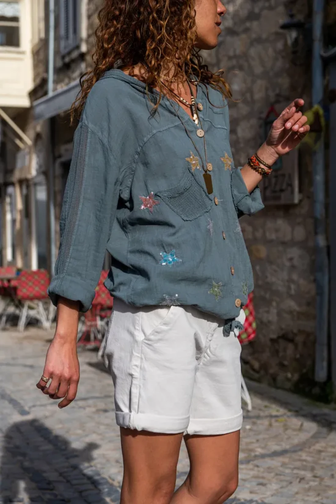 Güneşkızı Women's Gray Washed Linen Mesh Star Sequin Hooded Blouse GK-RSD2046