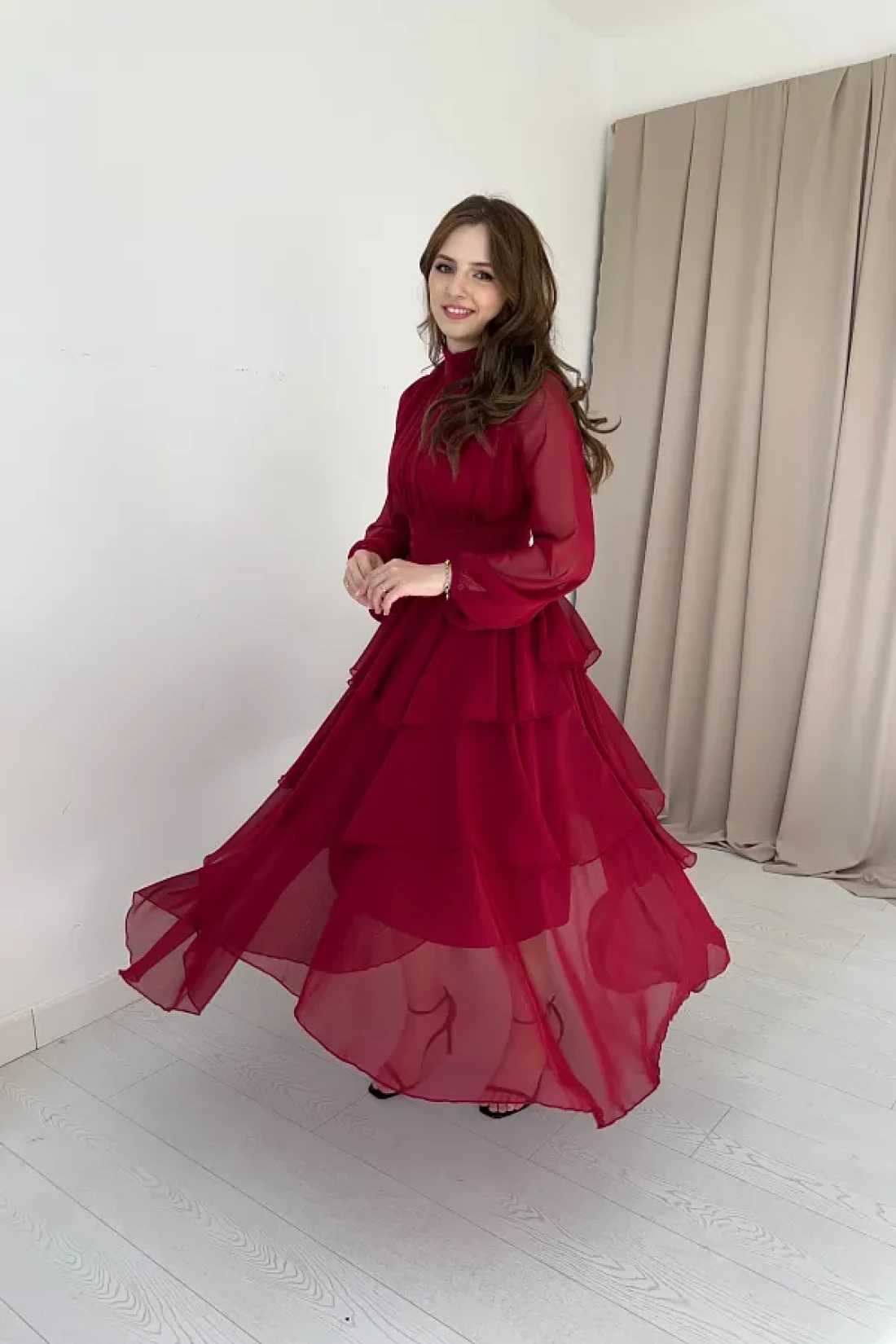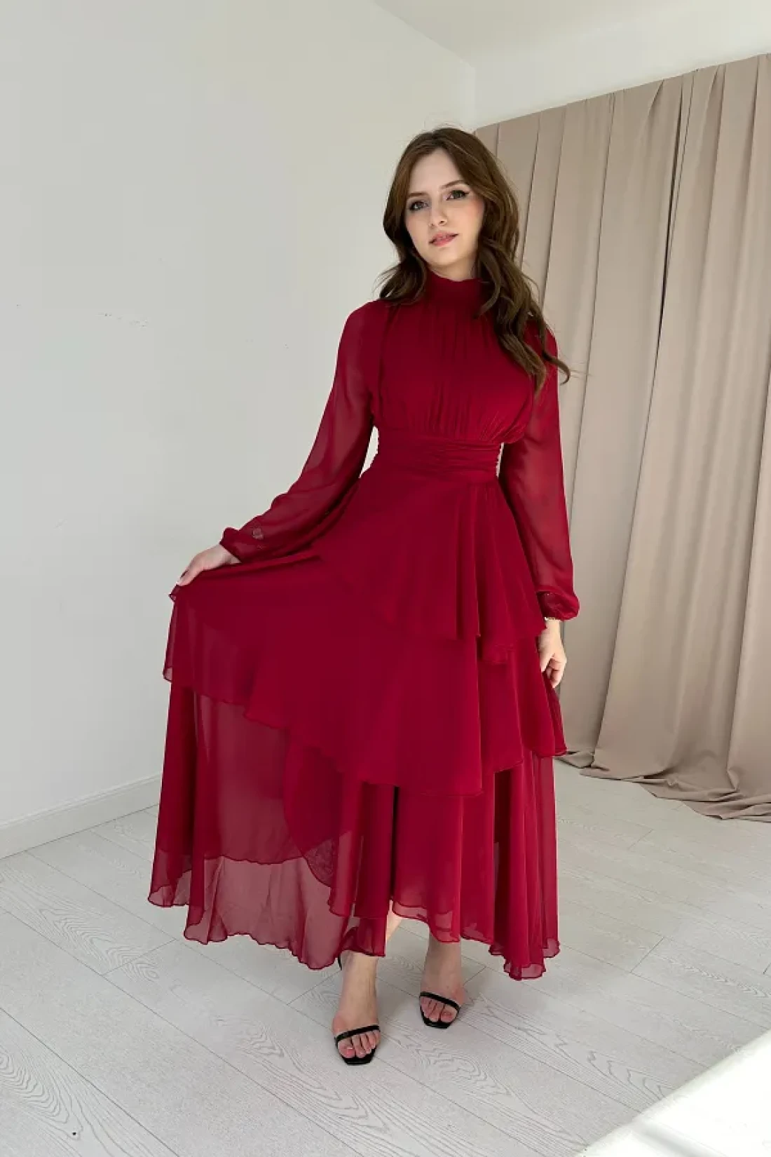HELİS BUTİK Burgundy Chiffon Dress - Neck Collar and Drape Detail