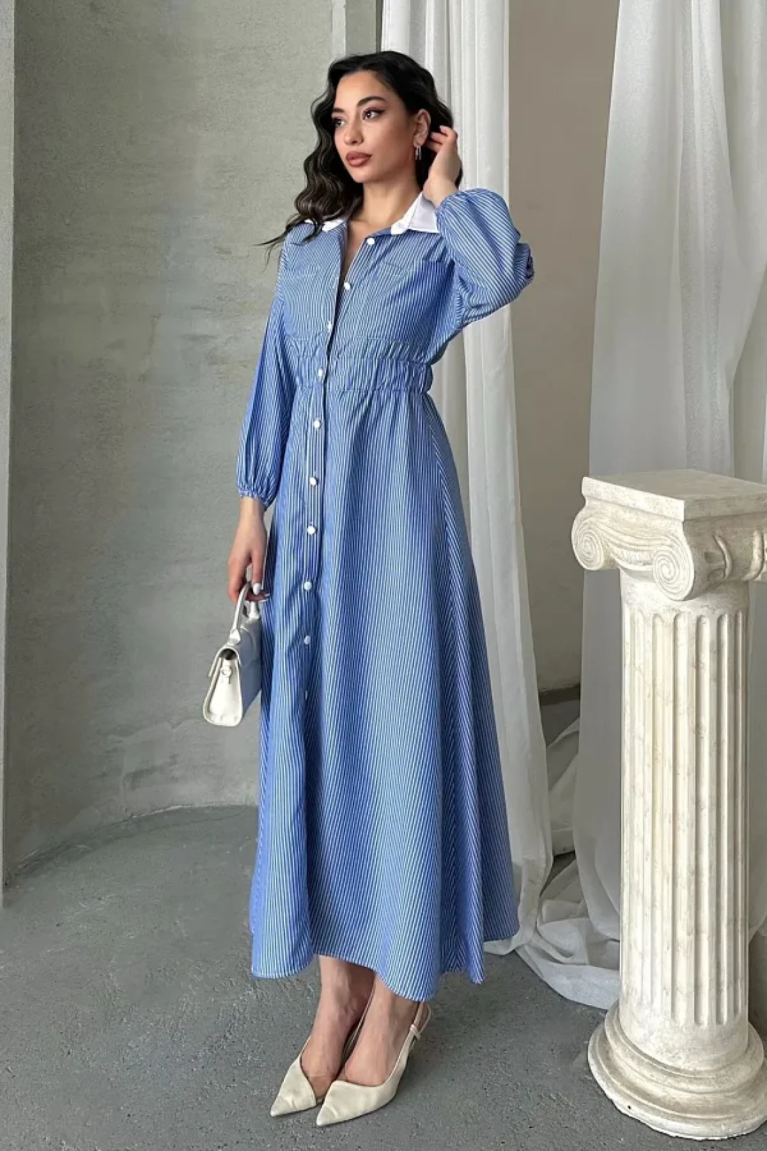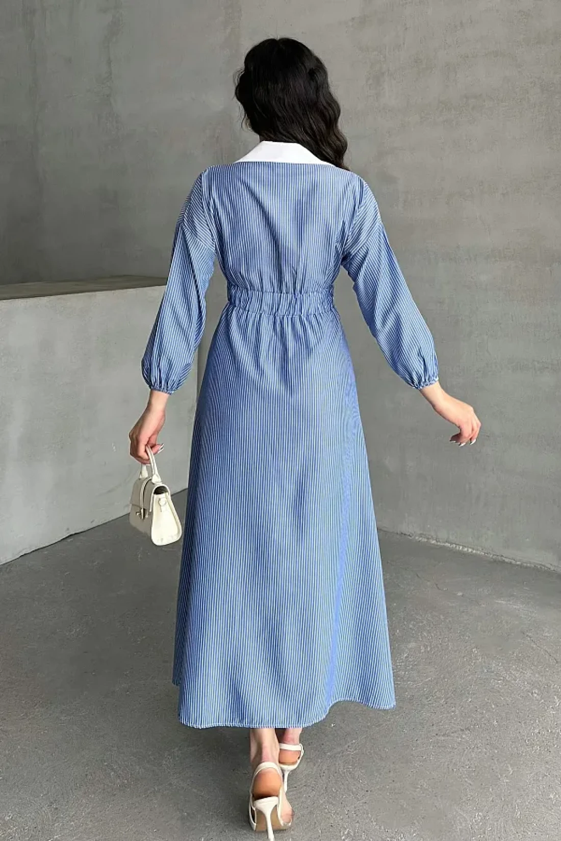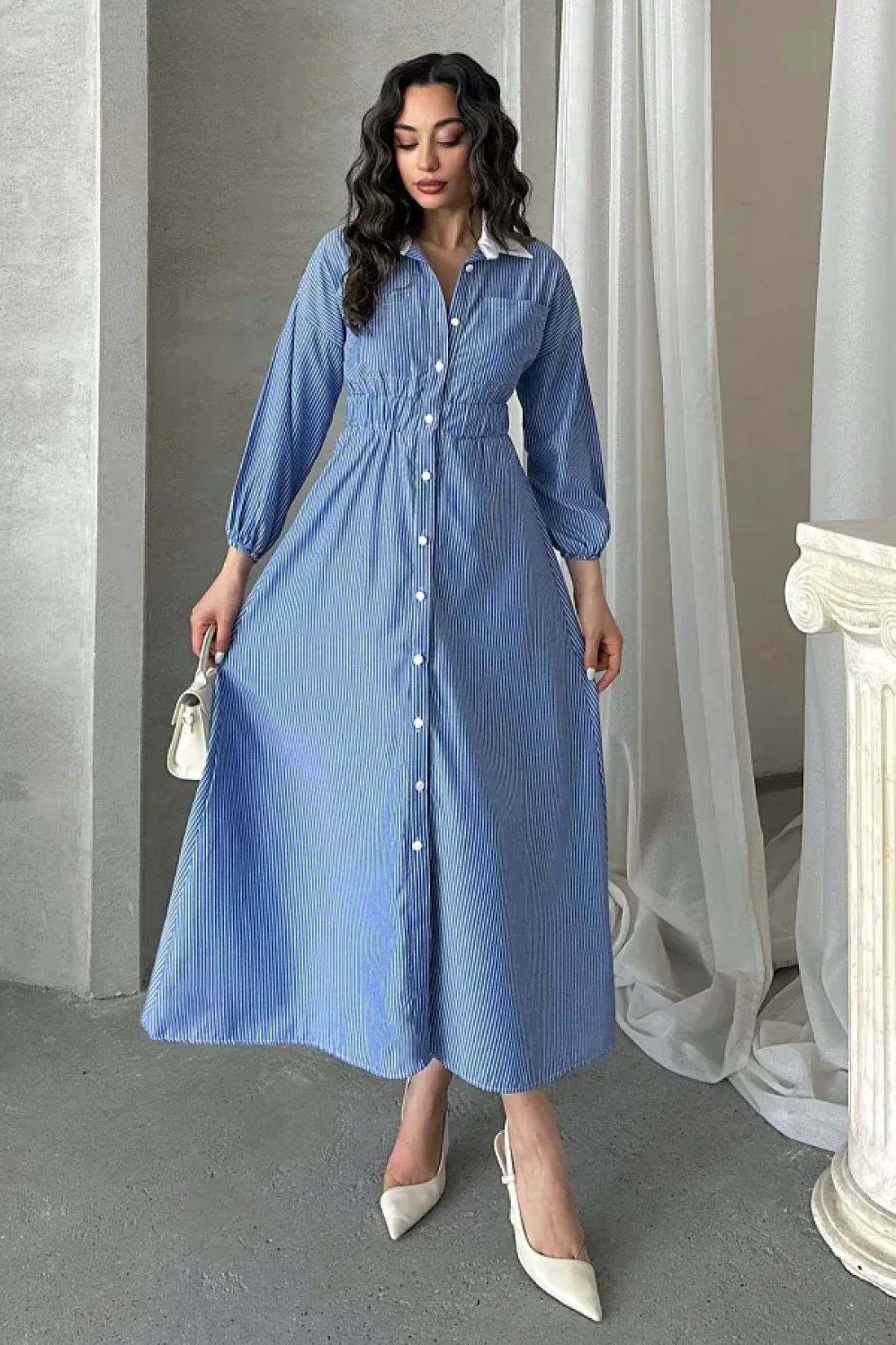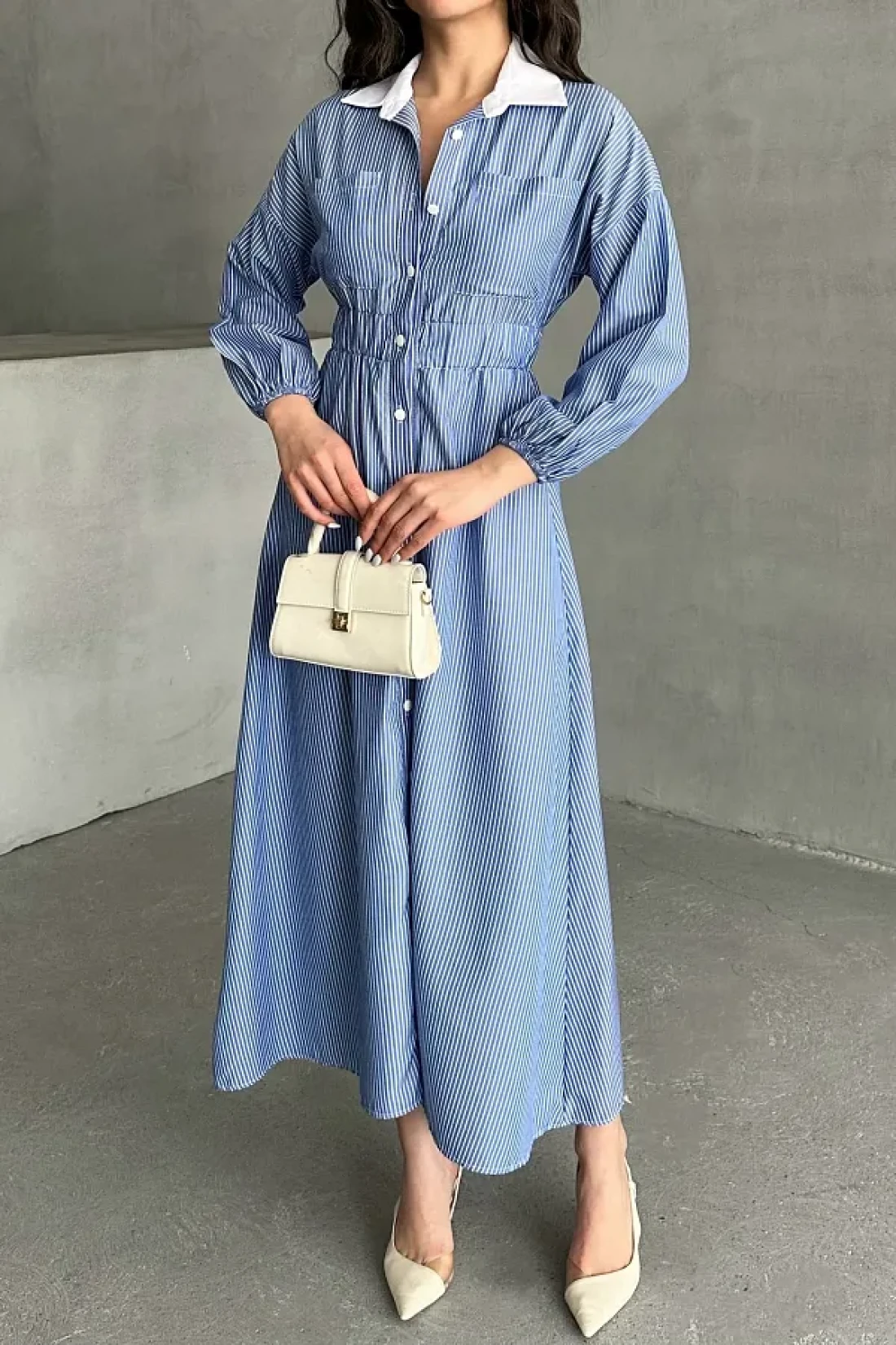 MD trend Women's Striped Buttoned Collar Garnished Waist Elastic Long Dress