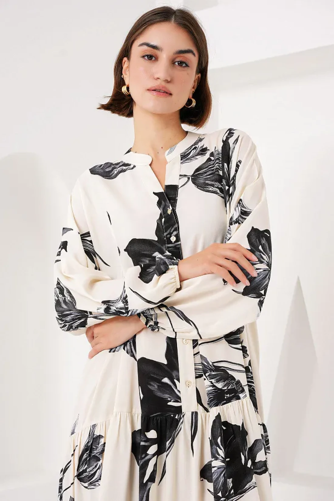 It offers an elegant and stylish appearance with its long design. It creates a modern and trendy silhouette thanks to its asymmetrical pattern. Woven fabric construction offers durability and comfort together