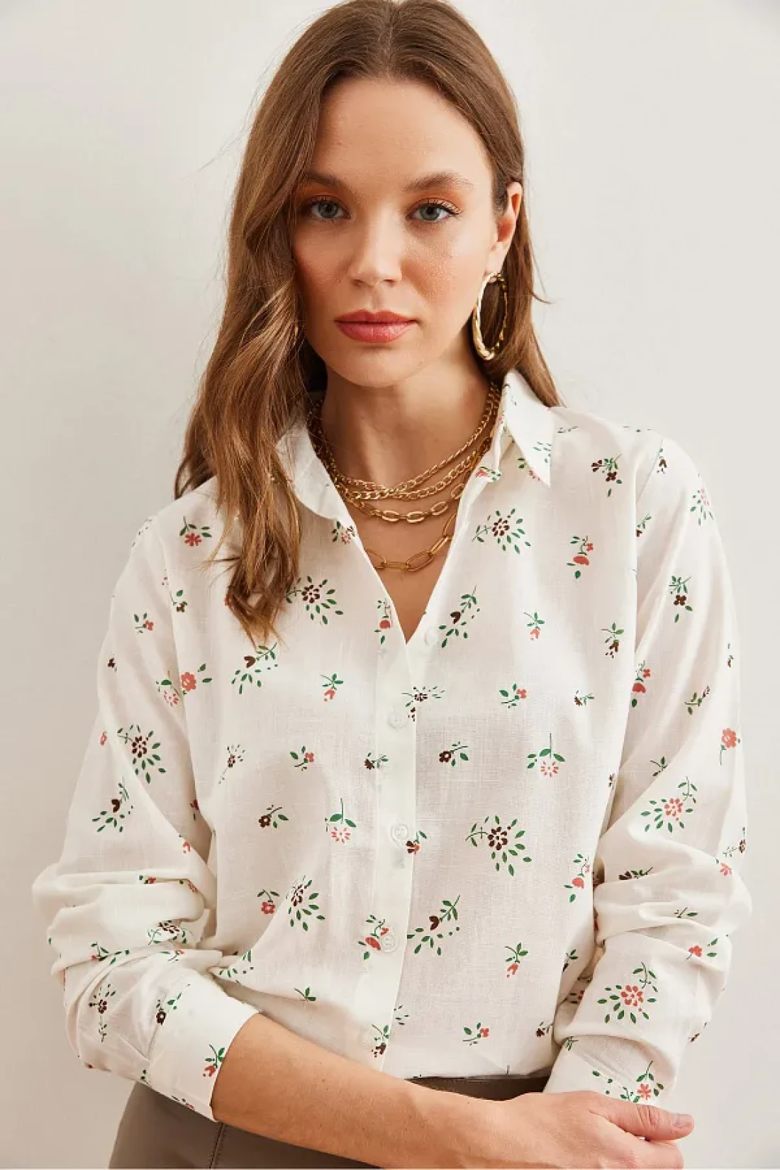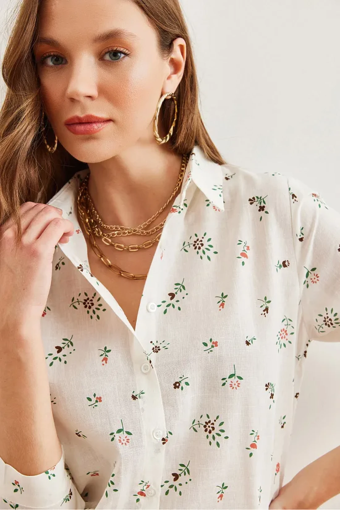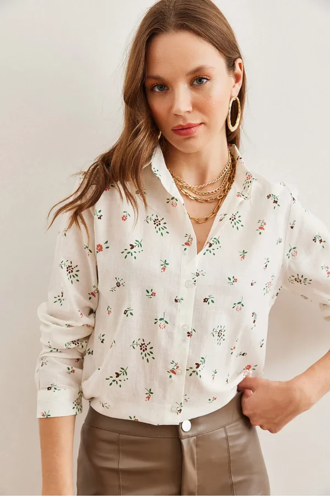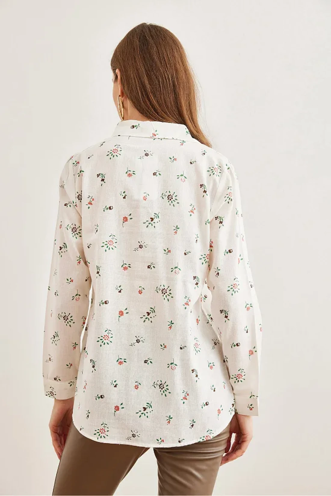 Olalook Tiny Floral Patterned Linen Women's Shirt - Coral Cuffed Gml- 19001248