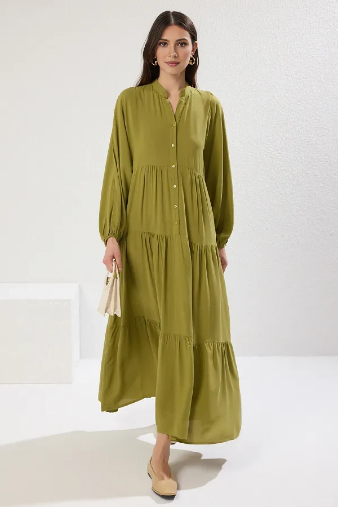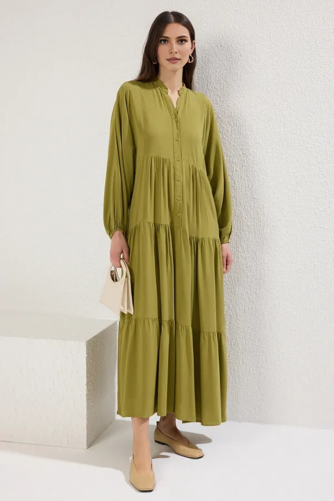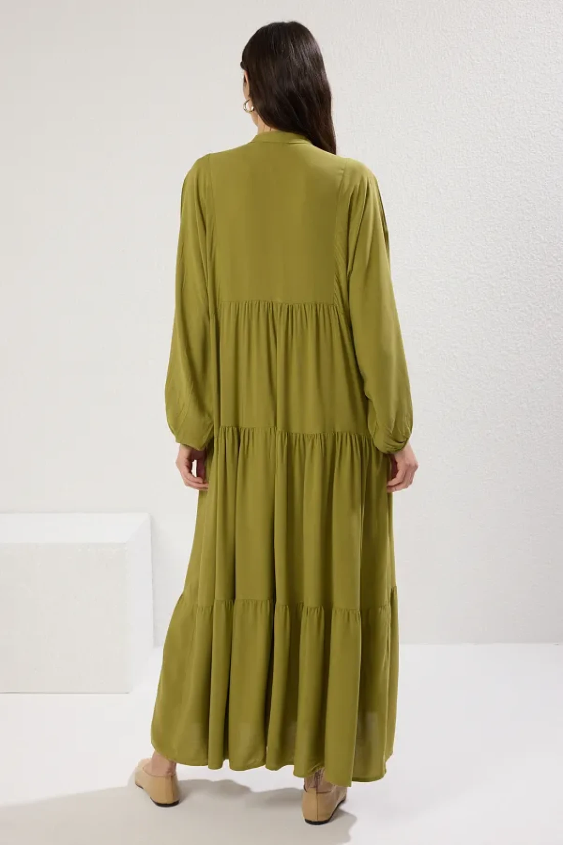 Modest Oil Green Viscose Unlined Woven Dress Tctss24Eb00221