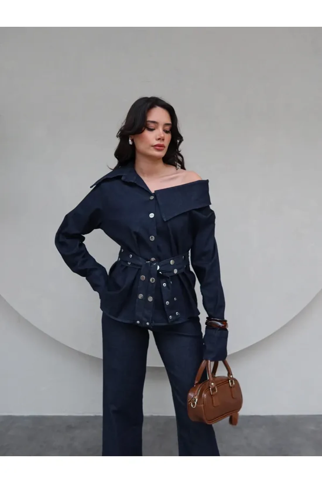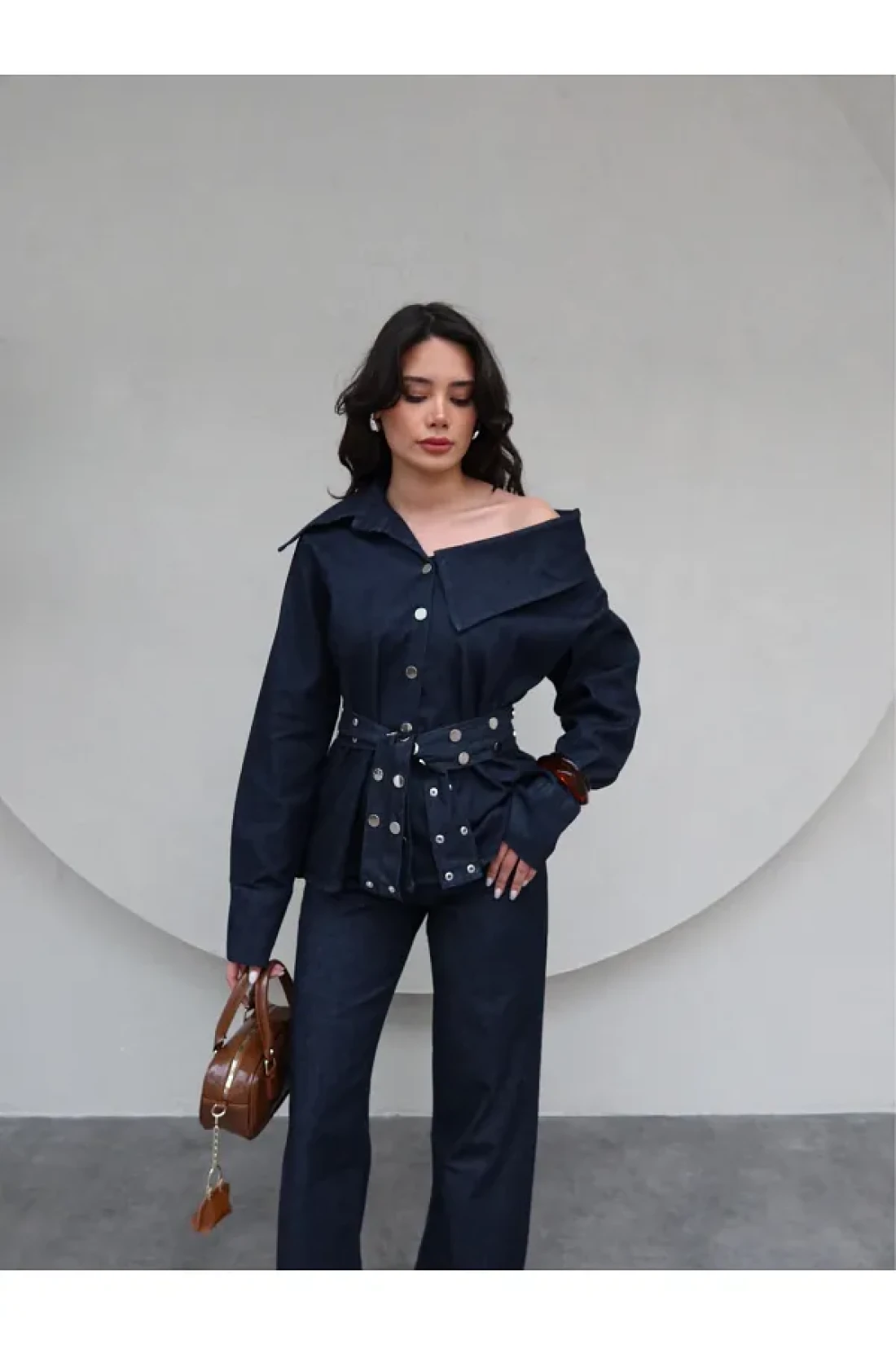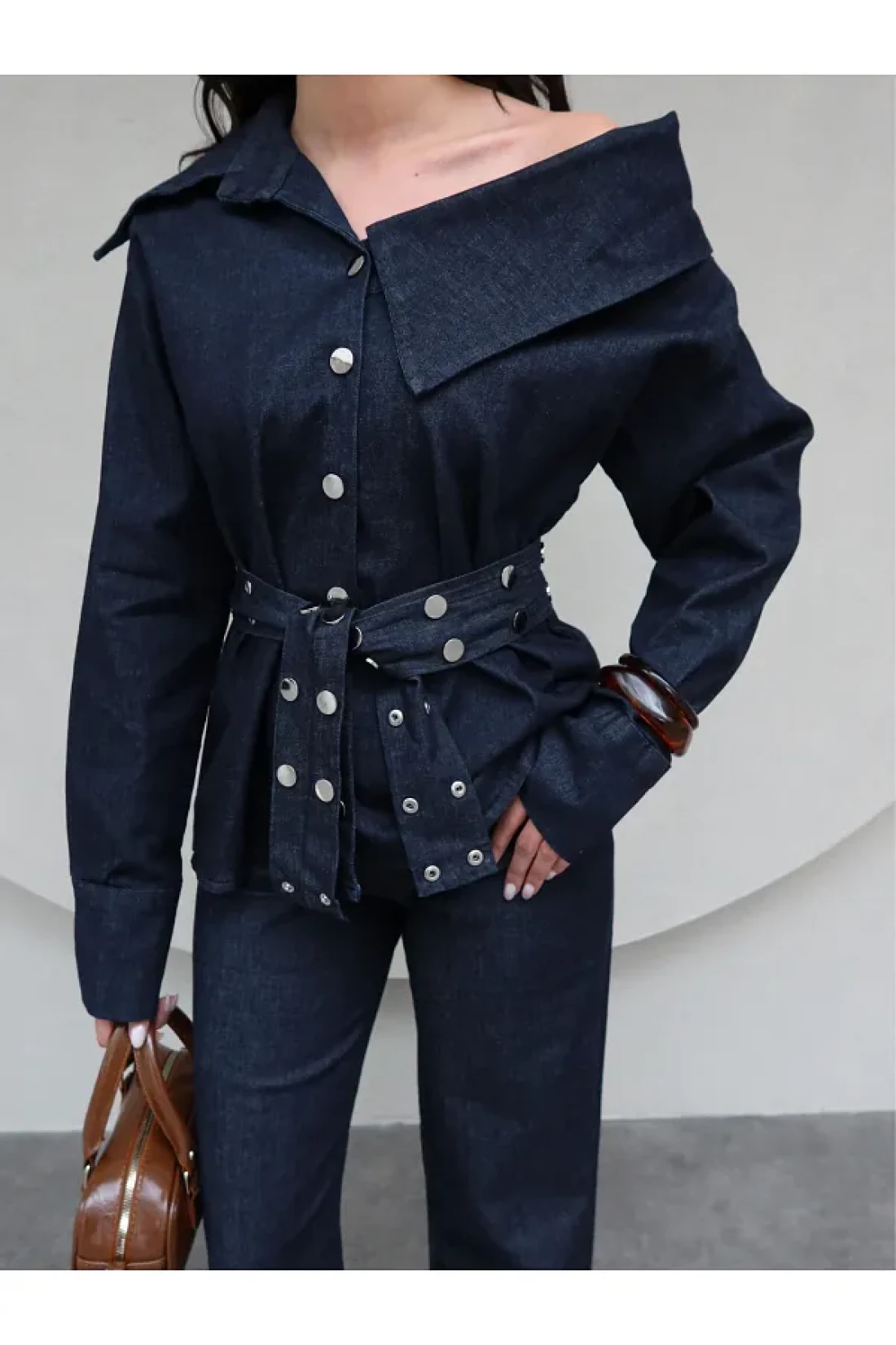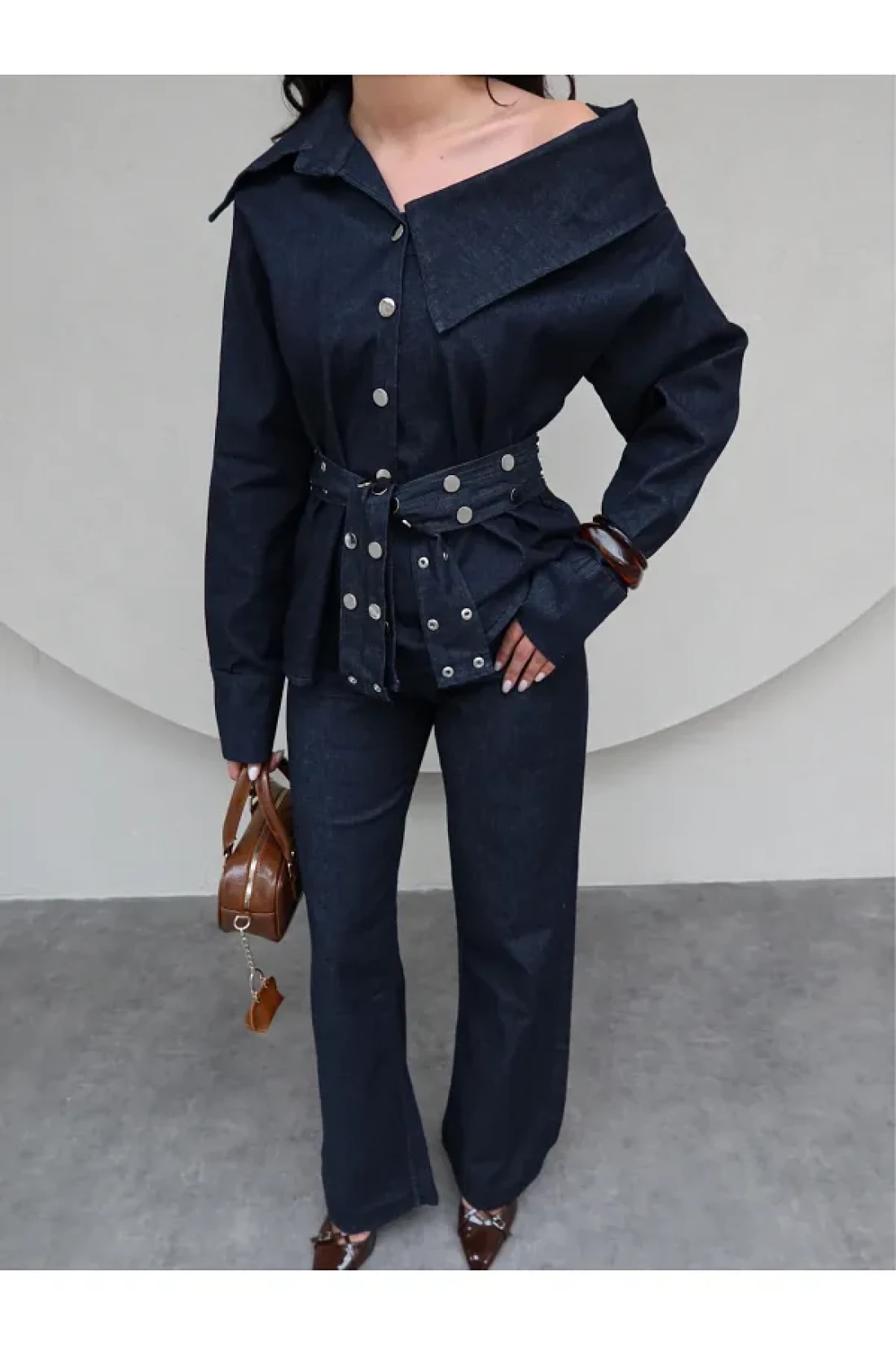 ESRAHELVACI Belted Asymmetrical Collar Denim Suit