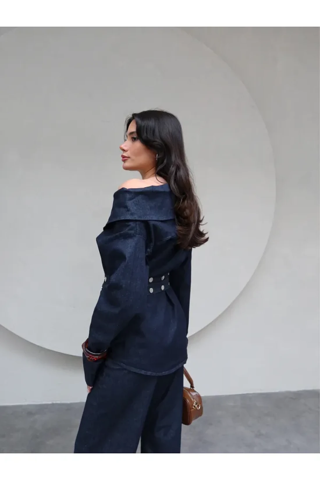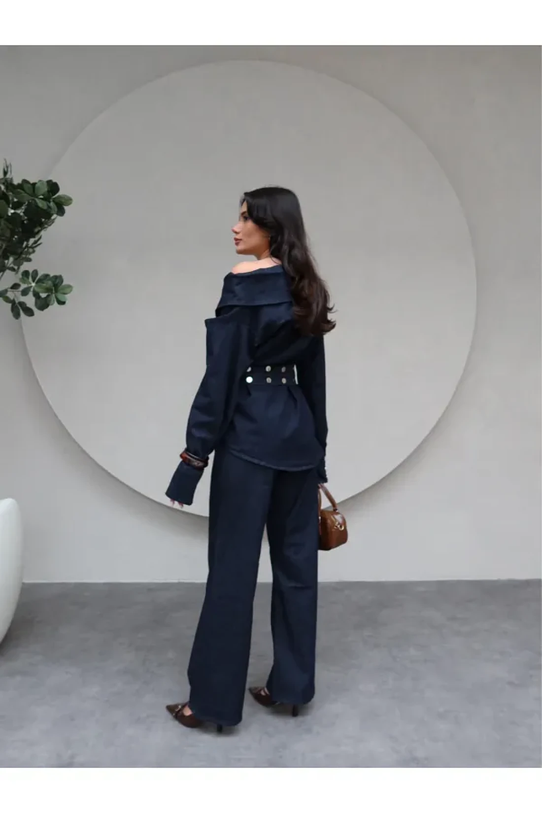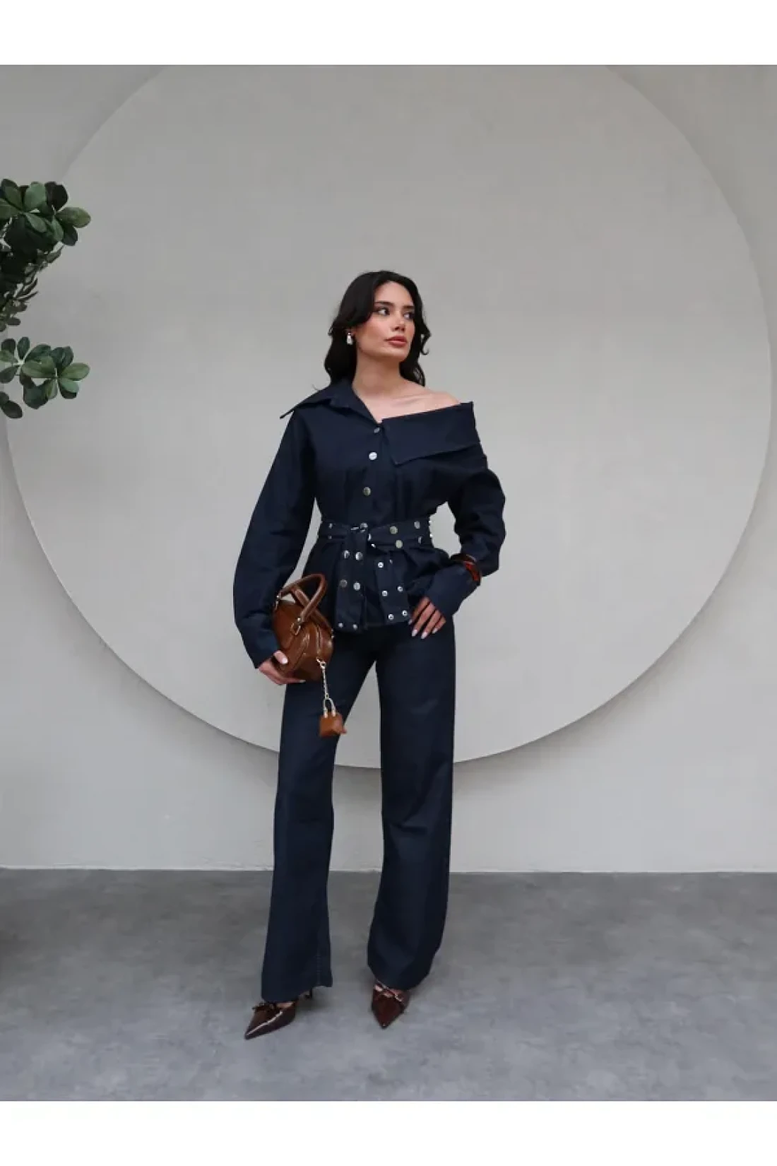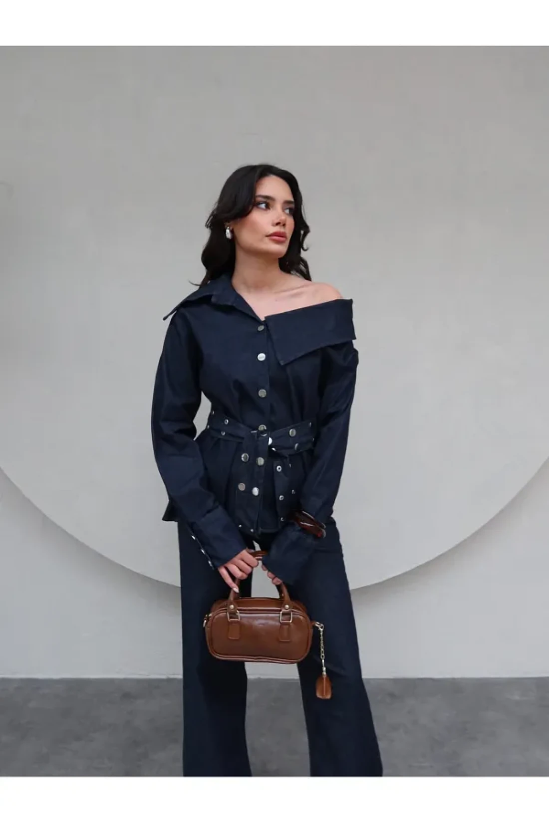 ESRAHELVACI Belted Asymmetrical Collar Denim Suit