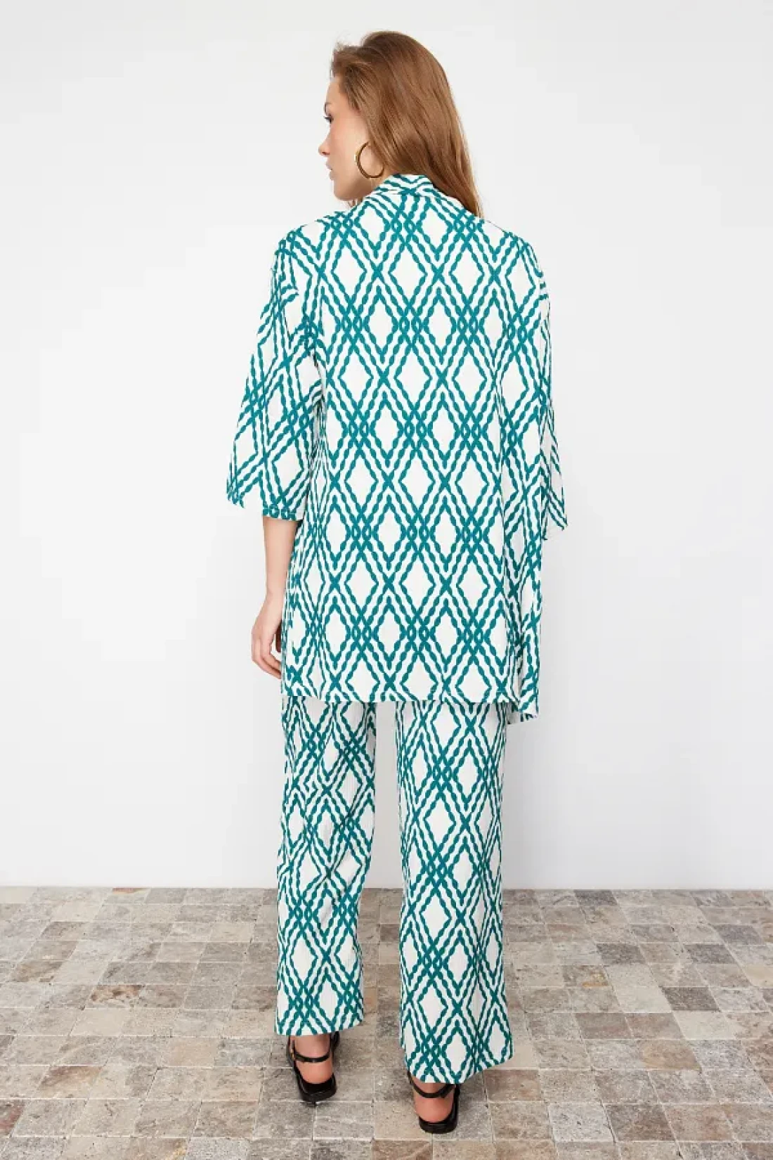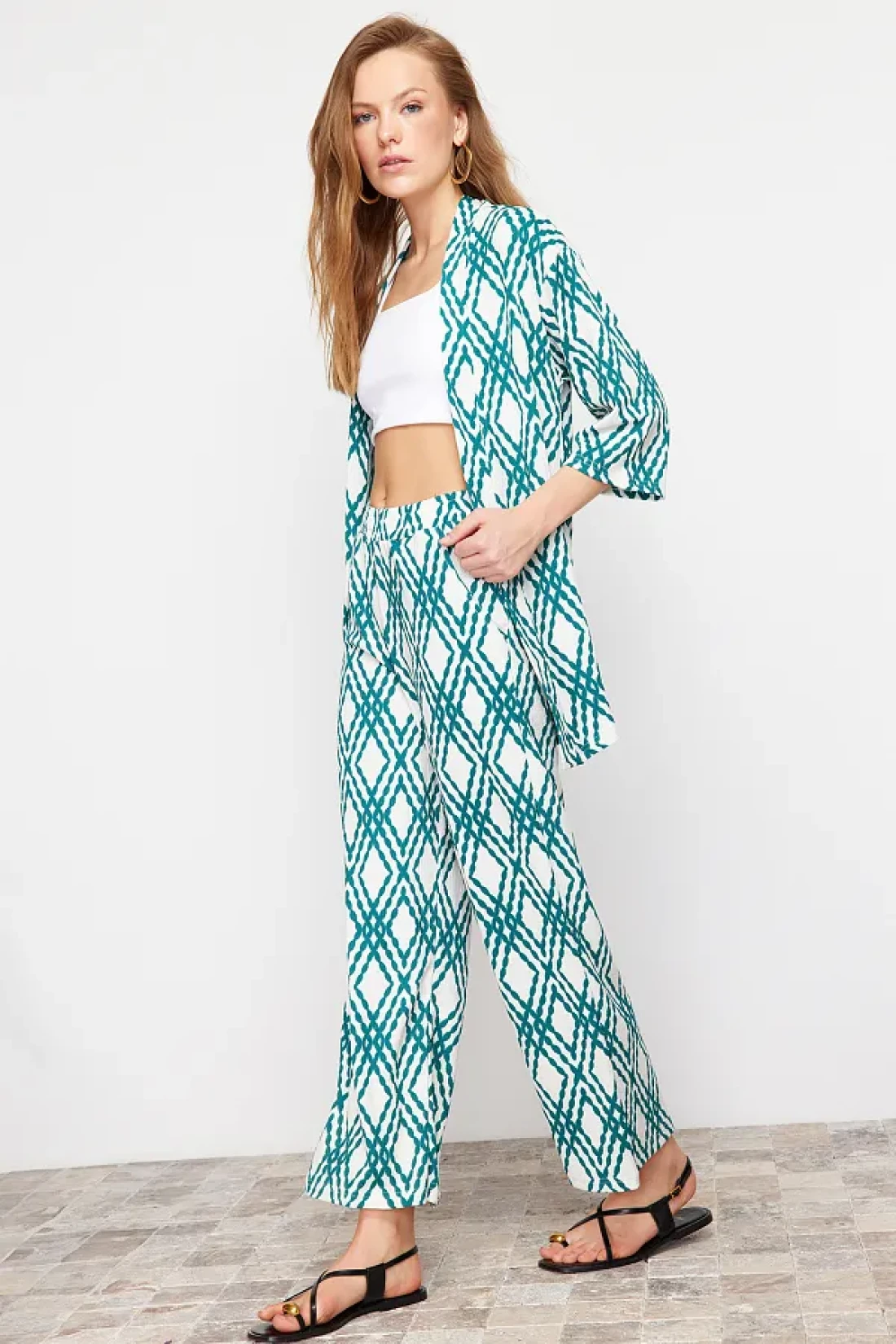 Collection Green Printed Comfortable Cut Stretchy Kimono Knitted Top and Bottom Set TWOSS24AU00103