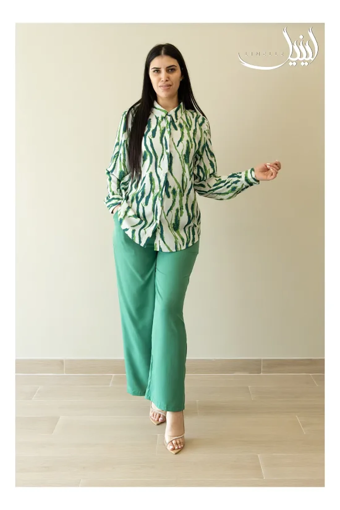 • Matching Green Pants: A perfectly coordinated solid green pant that complements the printed shirt.