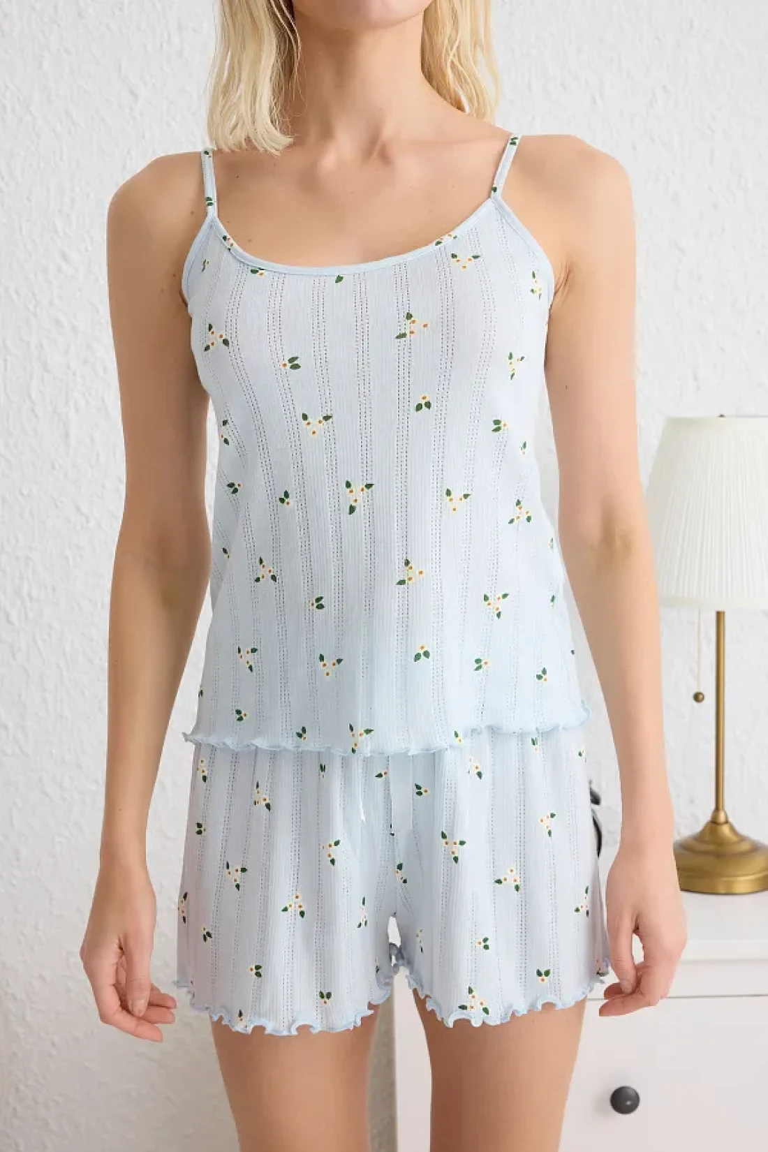 Collection Blue 100% Cotton Floral Pointel Openwork/Hollowed Out Shorts Knitted Pajamas Set Thmss25Pt00082