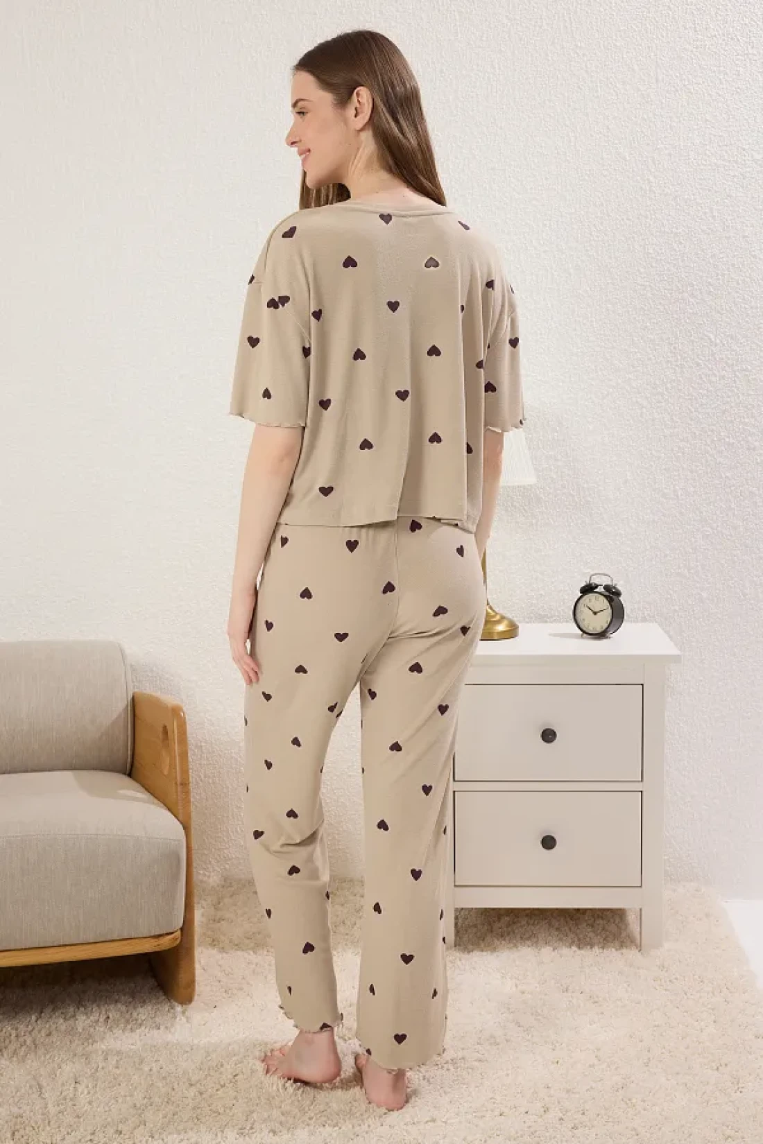 Collection Mint Heart Slogan Rubber Detailed Ribbed Knitted Pajamas Set Thmss24Pt00404