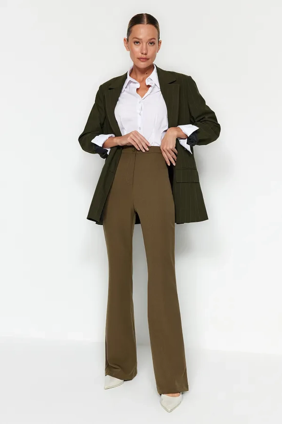 Thanks to its plain pattern, it can be easily combined and provides a timeless look. Creates a modern and trendy silhouette with its spanish leg design Its double pocket construction offers practical storage spaces for your small items