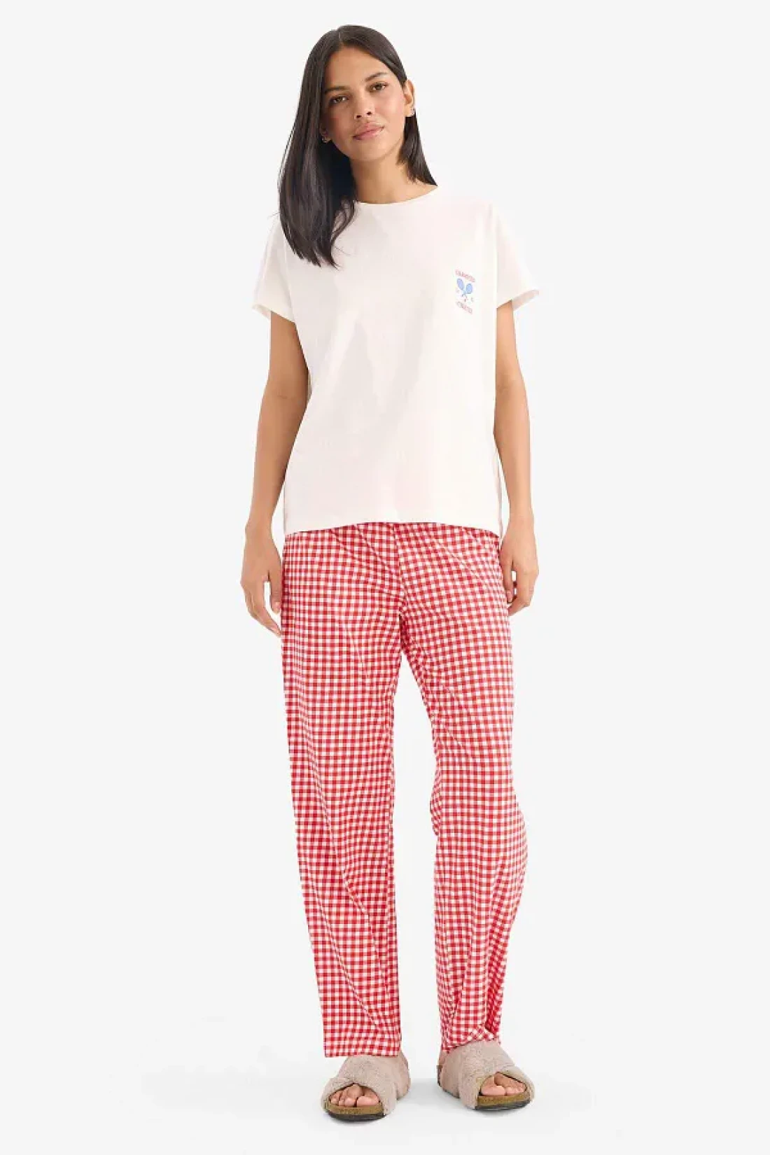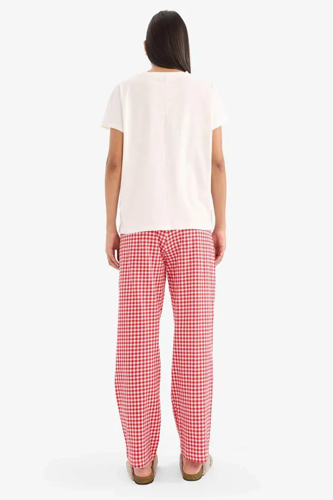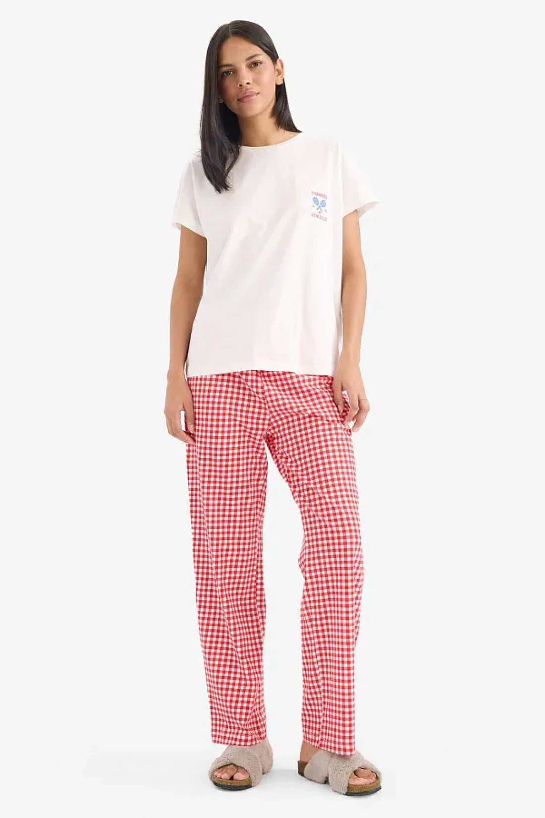 Defacto Pajama Sets Short Sleeve Top Stretchy Waisted Checked Long Bottom-Fall in Love E4822Ax25Sp