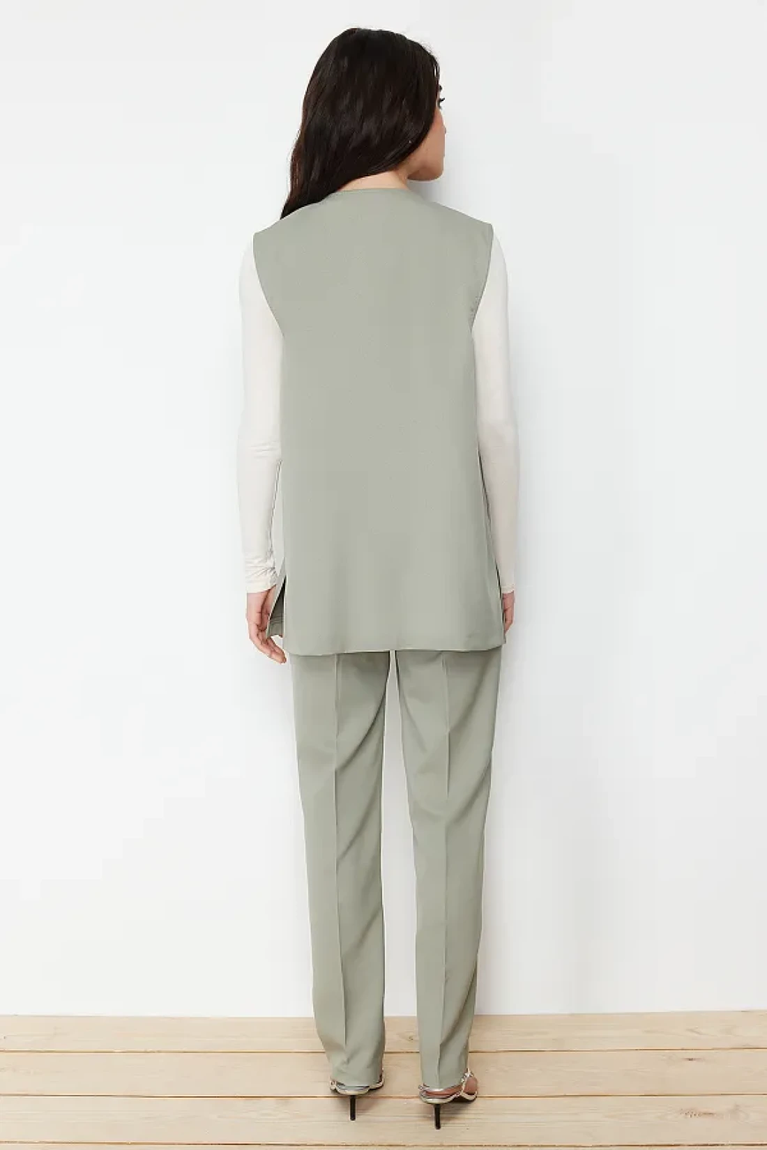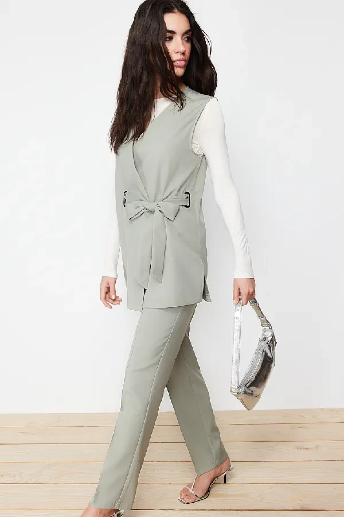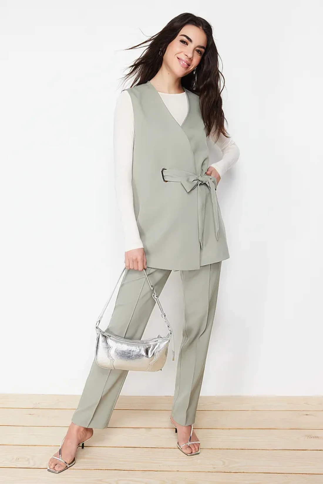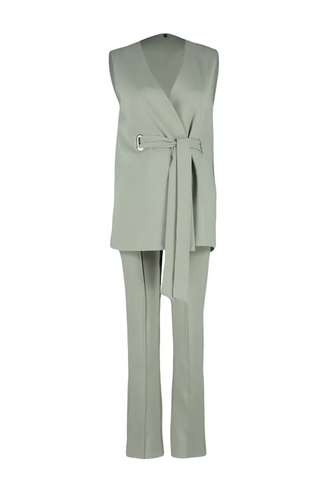 Modest Khaki Accessory Detailed Woven Fabric Vest Trousers Top and Bottom Set TCTSS24US00035
