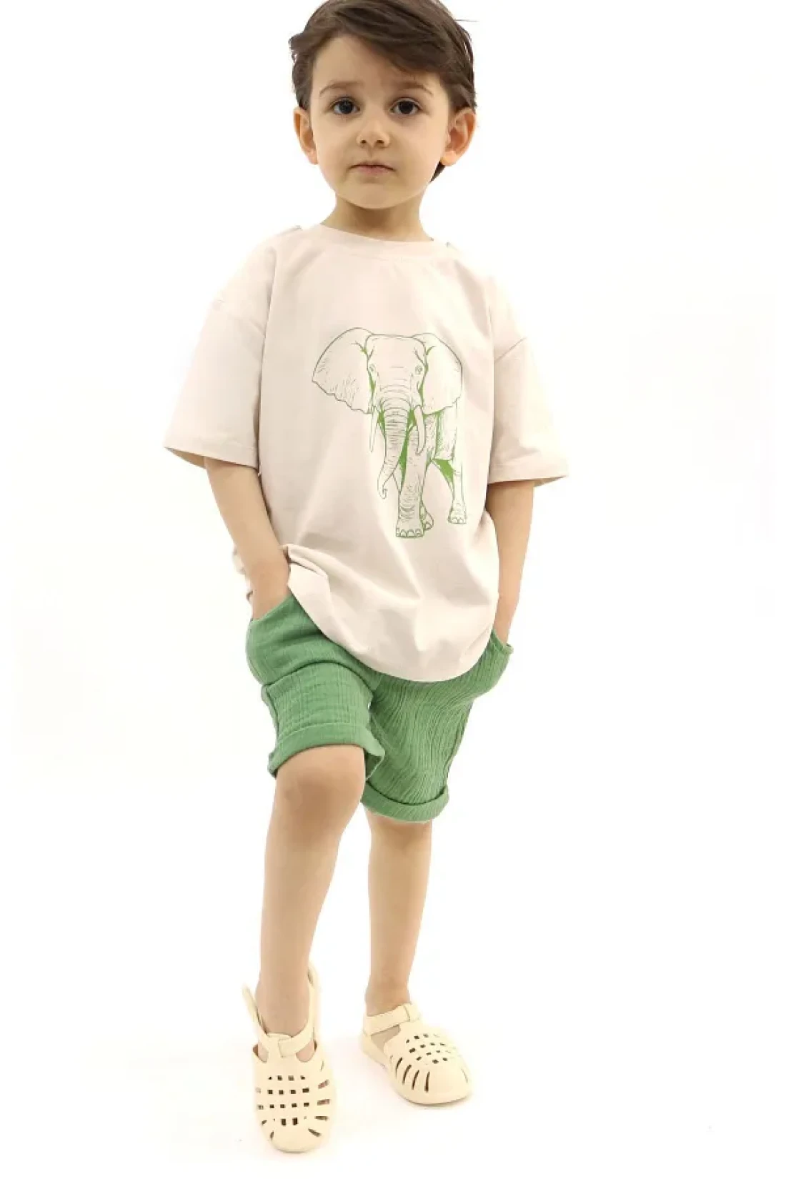 BALKABAĞI Elephant Stone Color T-shirt Green Muslin Shorts Set TYE0031
