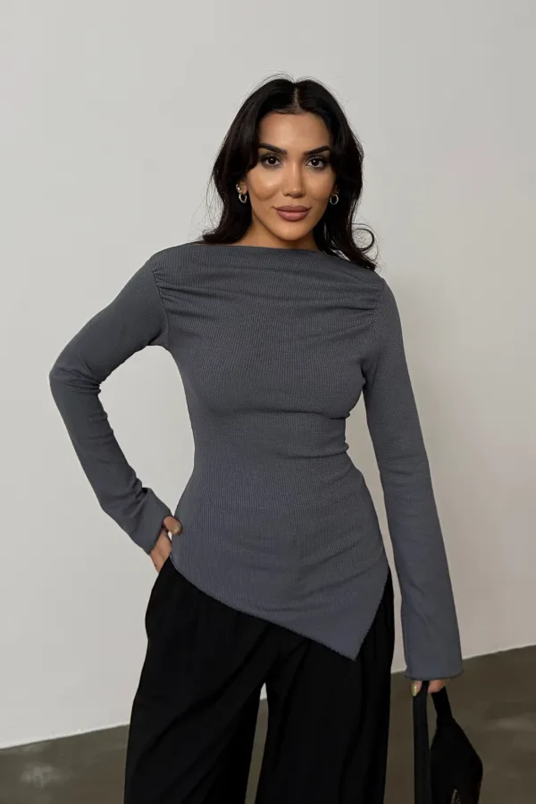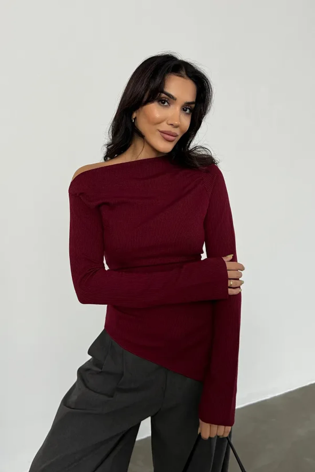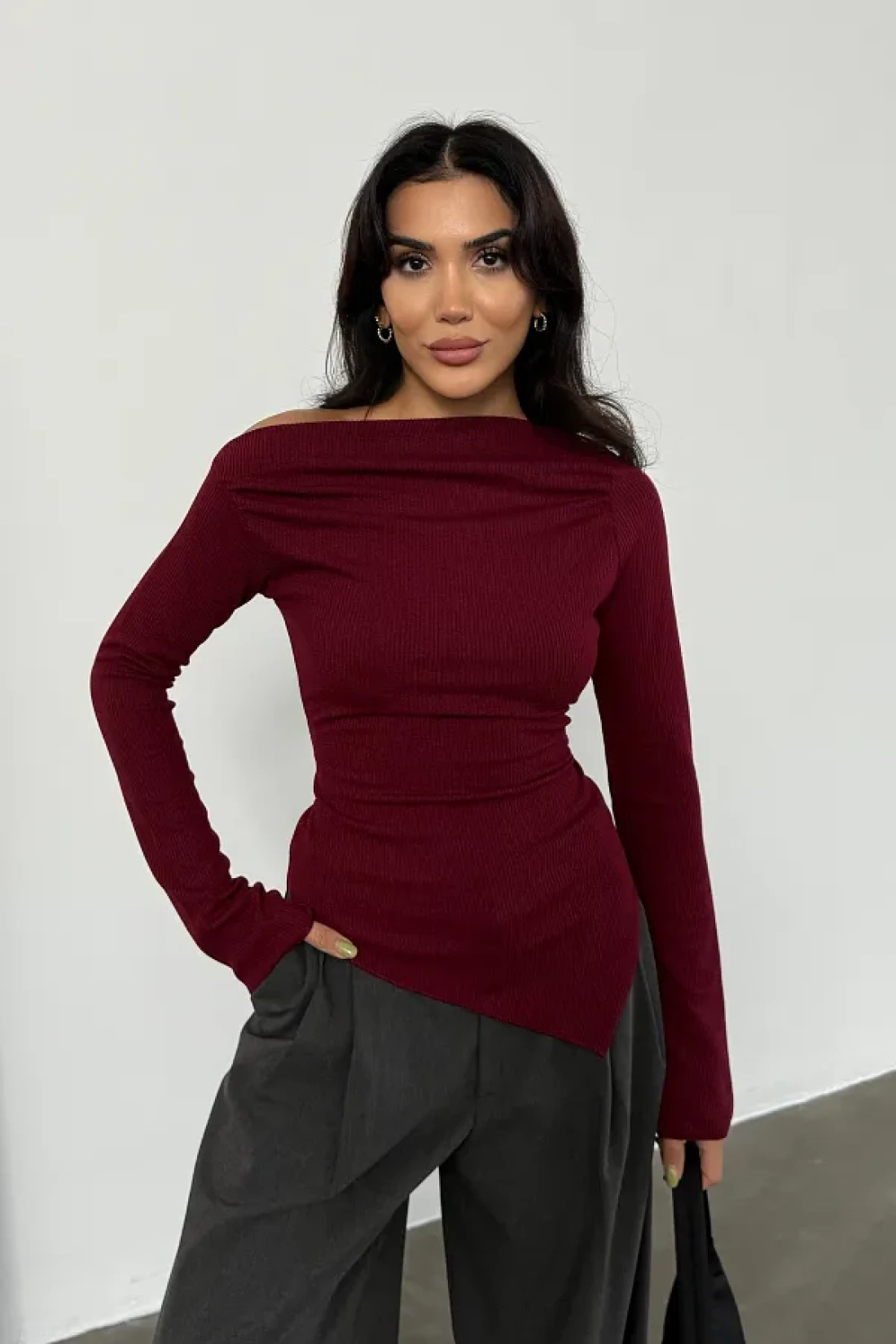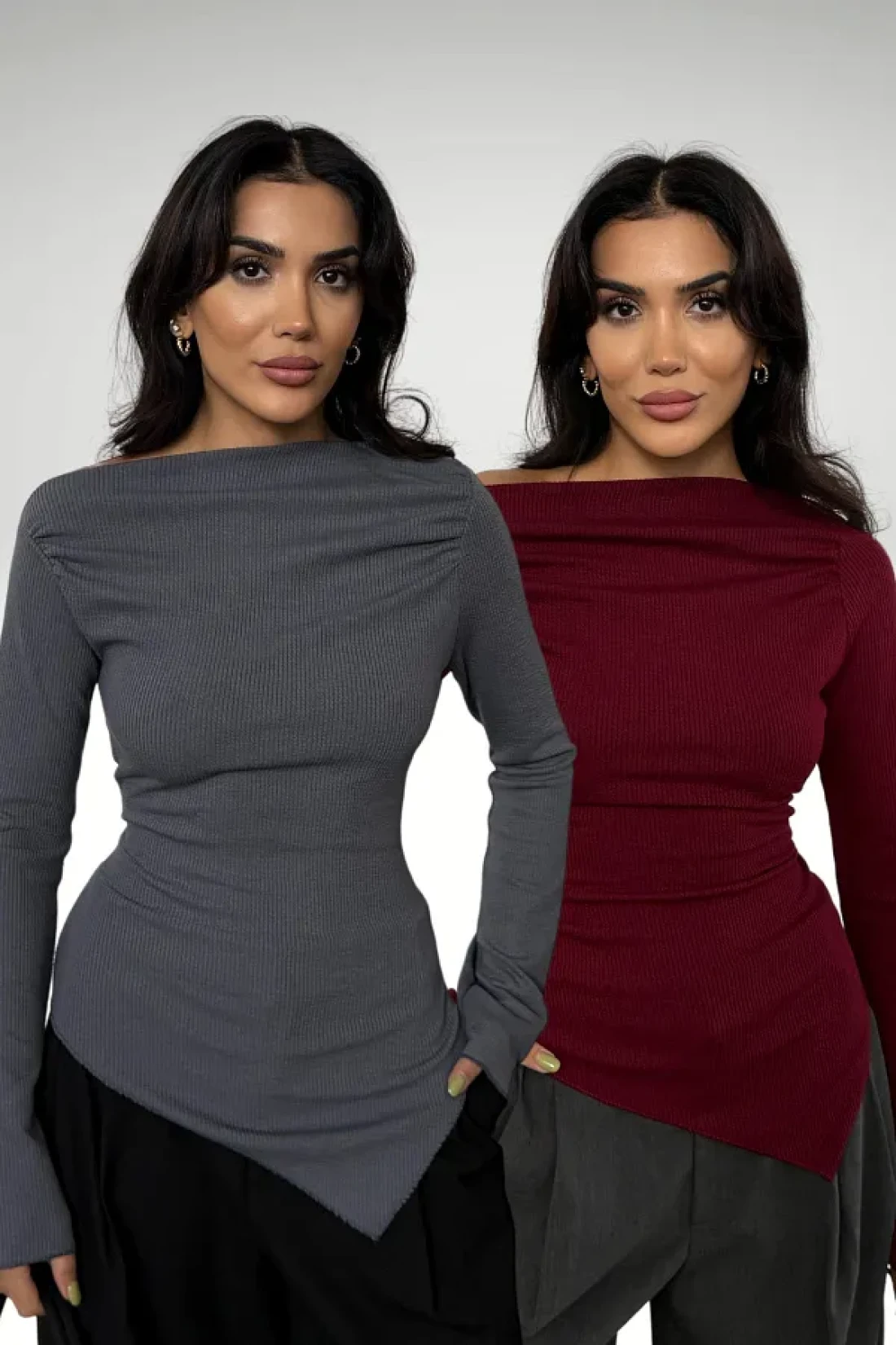 Bipantolon Burgundy Anthracite 2-Piece Blouse - Draped, Boat Neck, Asymmetrical Lycra Knitted Blouse