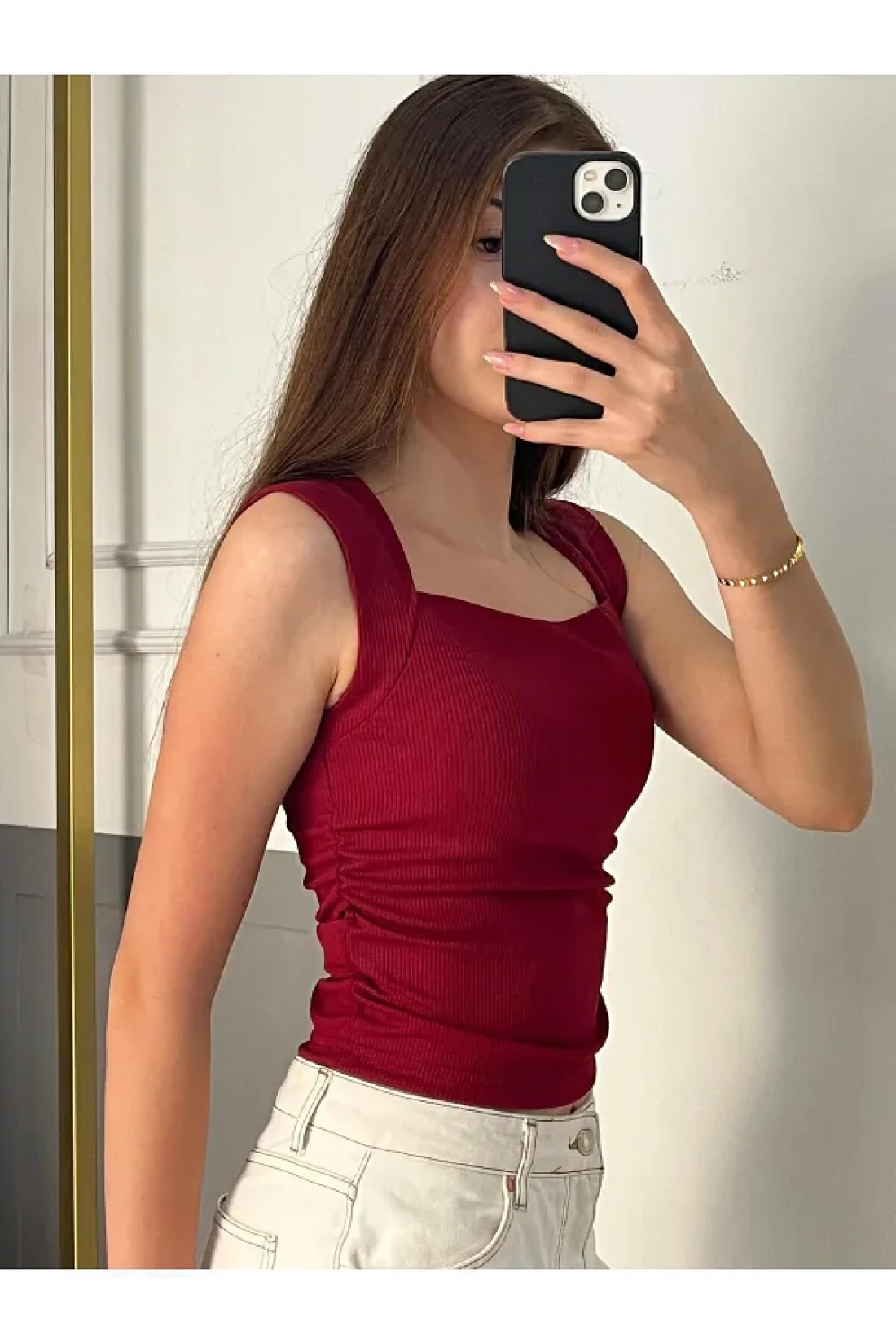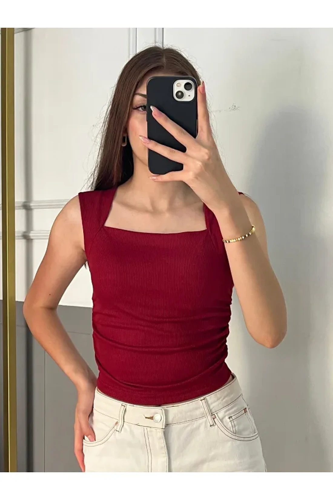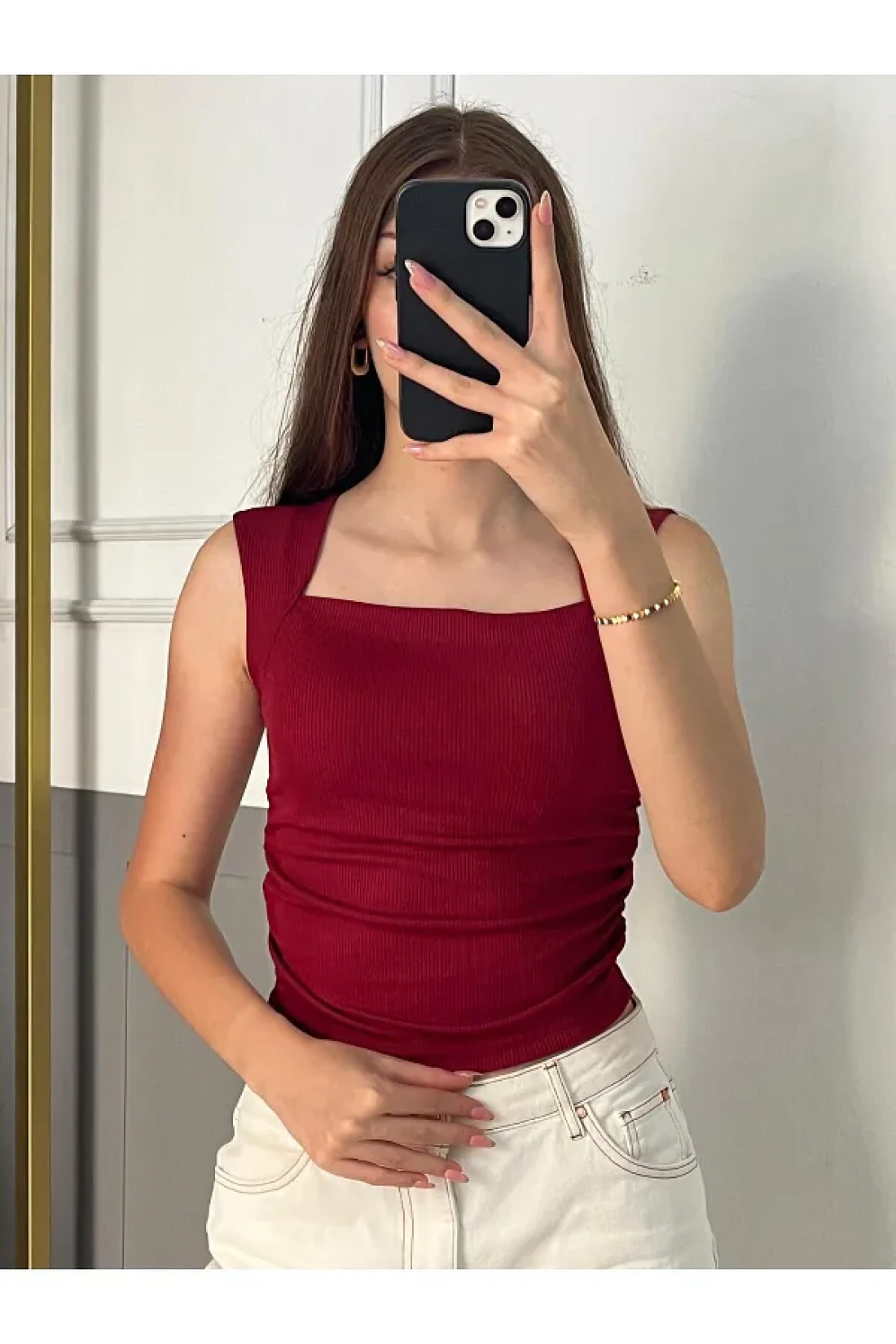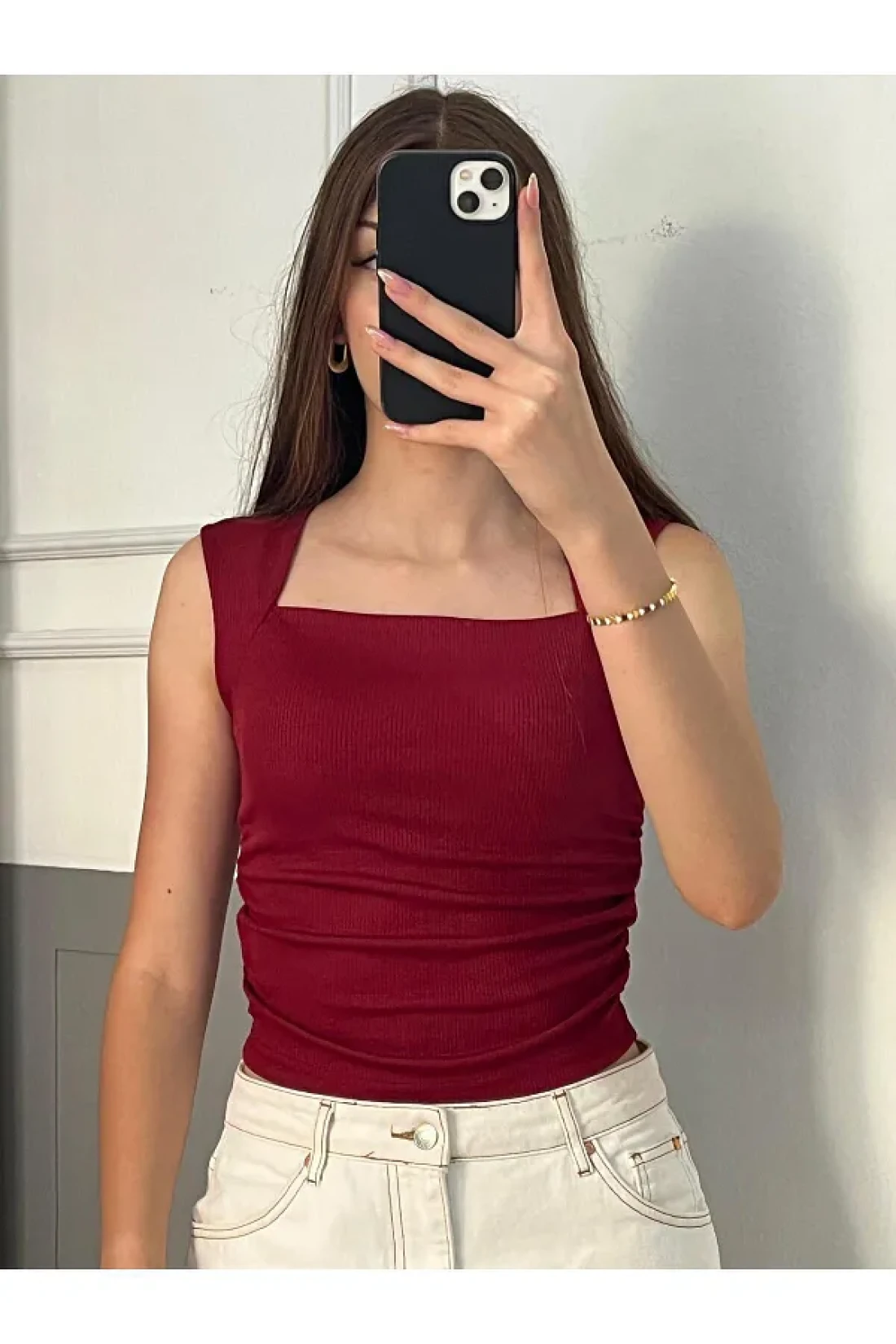 peri tower New Product Square Neck Waist Shirred Burgundy Camisole Undershirt