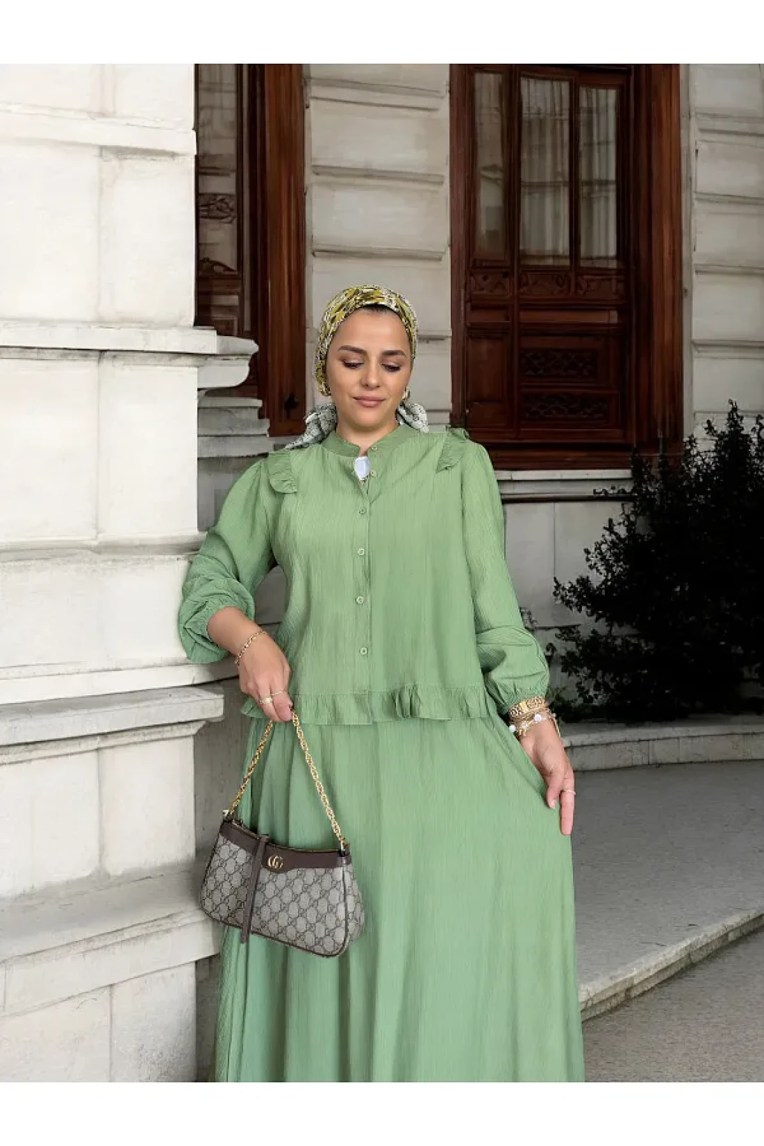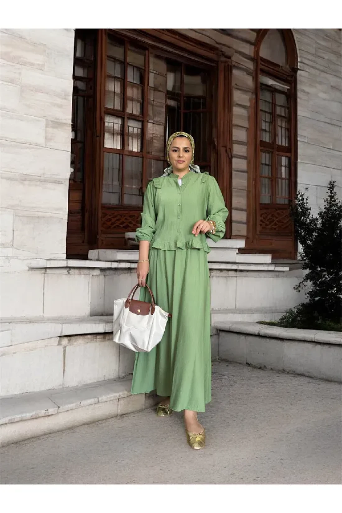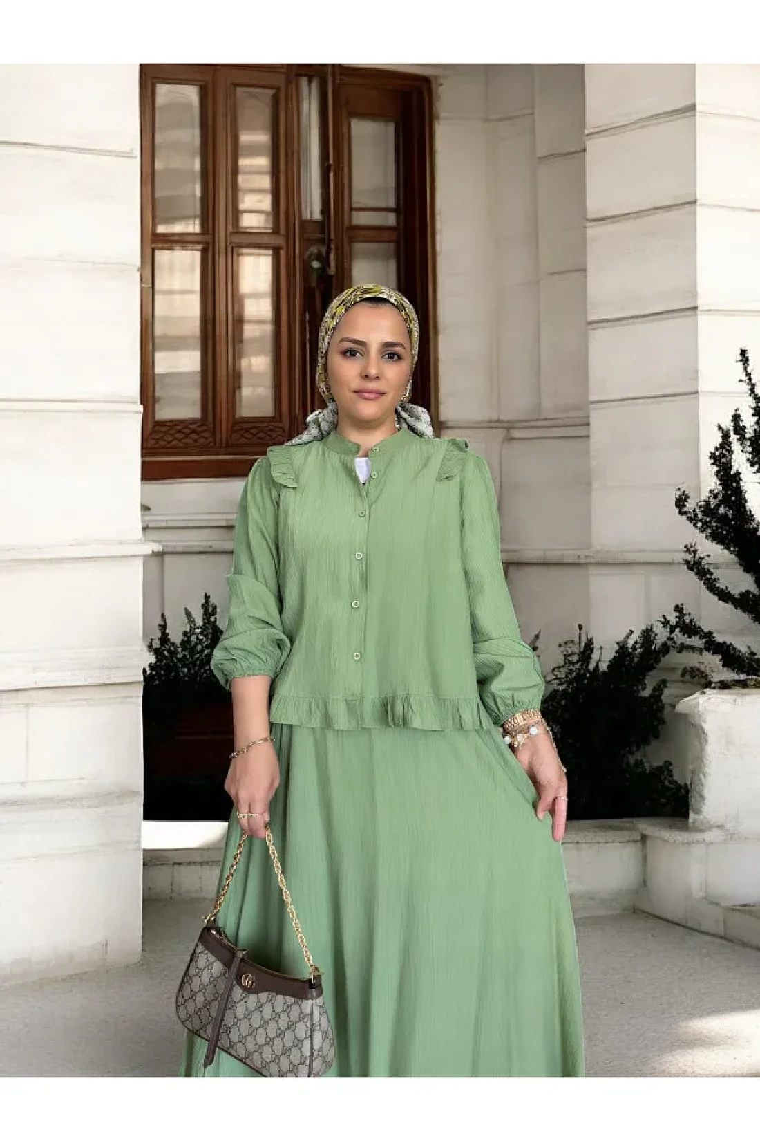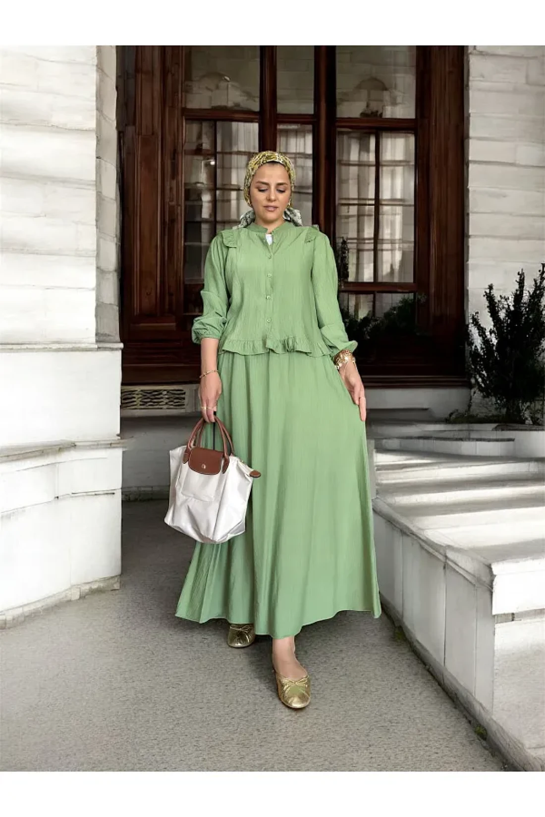 Aselim Hijap Moda Strawberry Fabric Cotton Ruffle Shirt Skirt Suit – Green