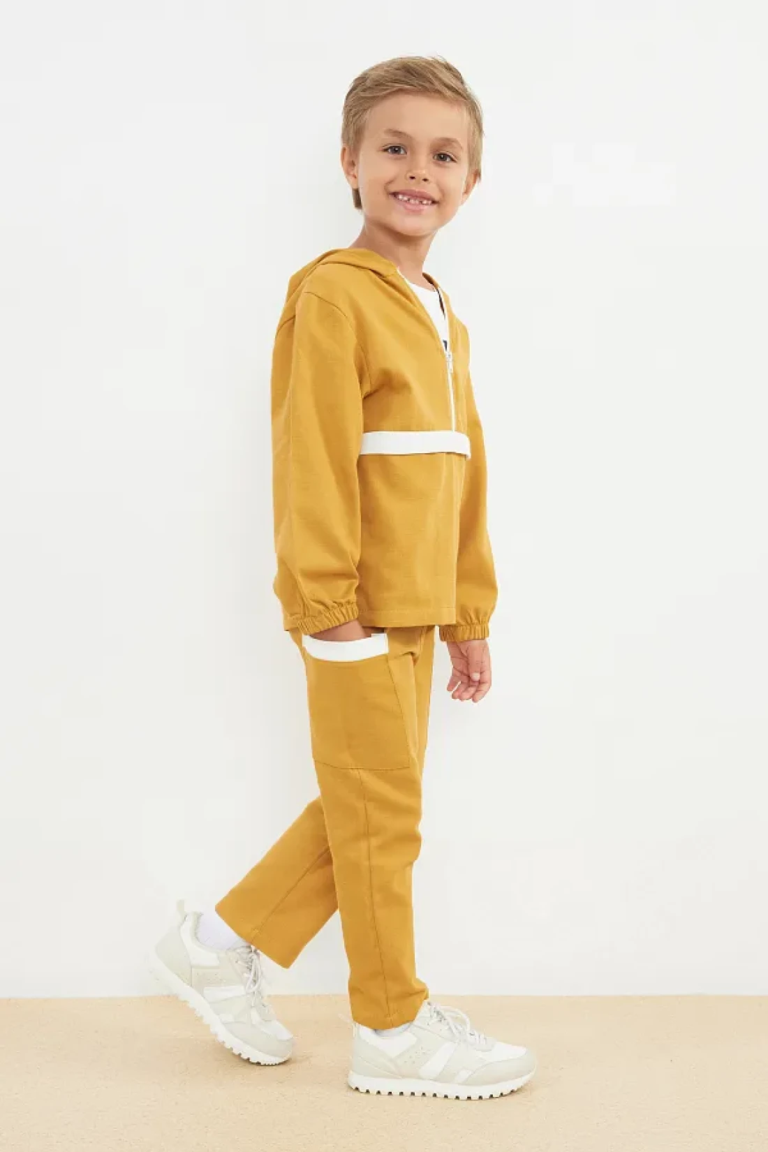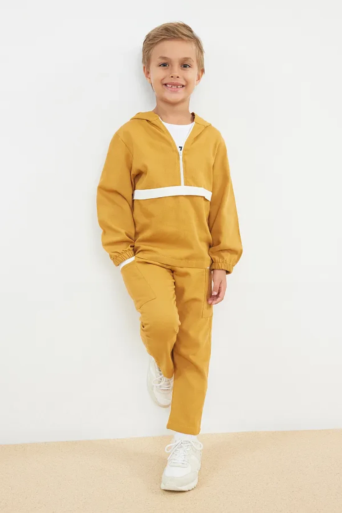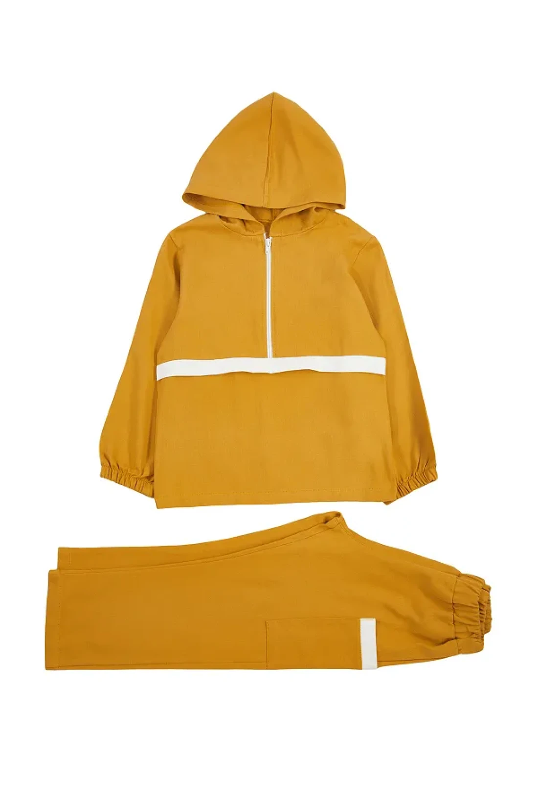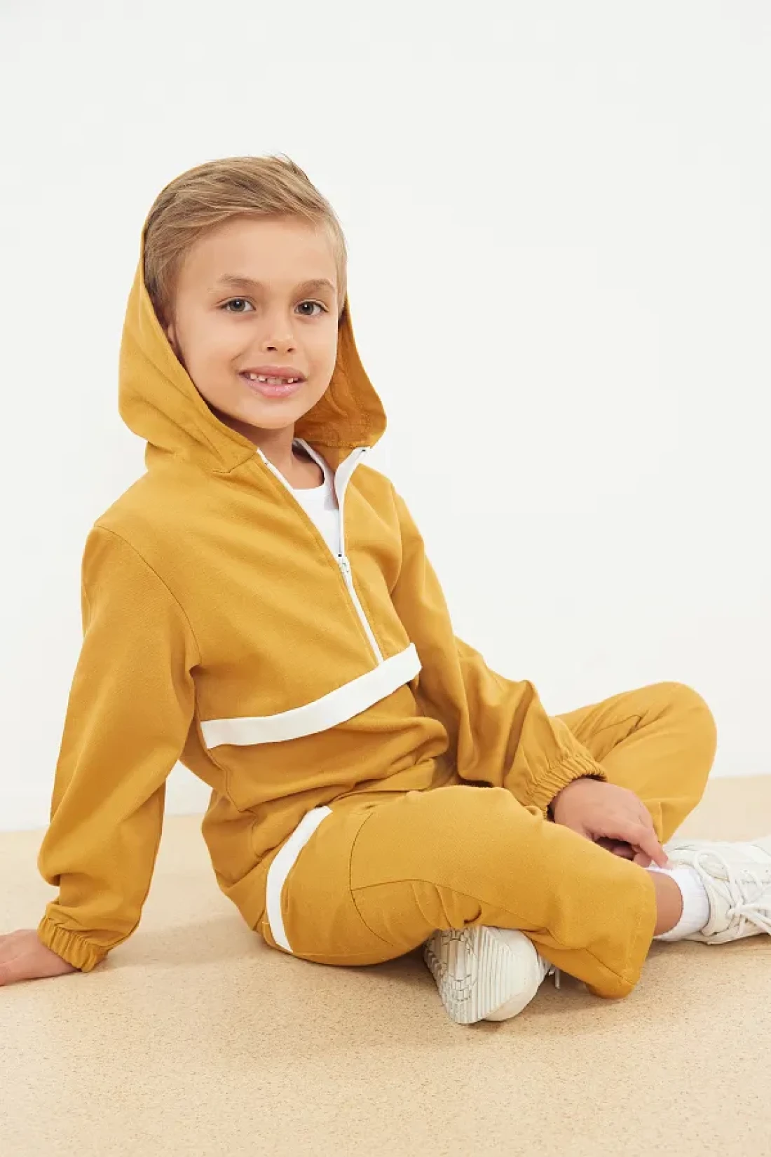 the top set prioritizes children's comfort. Thanks to the 2-thread weaving type, it has increased durability and offers an ideal structure for long-term use. It provides a modern and dynamic appearance with its color-blocked pattern, and it harmonizes with any combination. With its standard sleeve type and hooded collar design, it offers ideal protection and elegance during seasonal transitions. Thanks to its long-sleeved structure, it keeps you warm even in cool weather and allows for comfortable movement. With its 100% cotton material component, it gives a soft touch without irritating the skin. Knitted fabric type offers a comfortable experience all day long with the characteristics of flexibility and breathability
