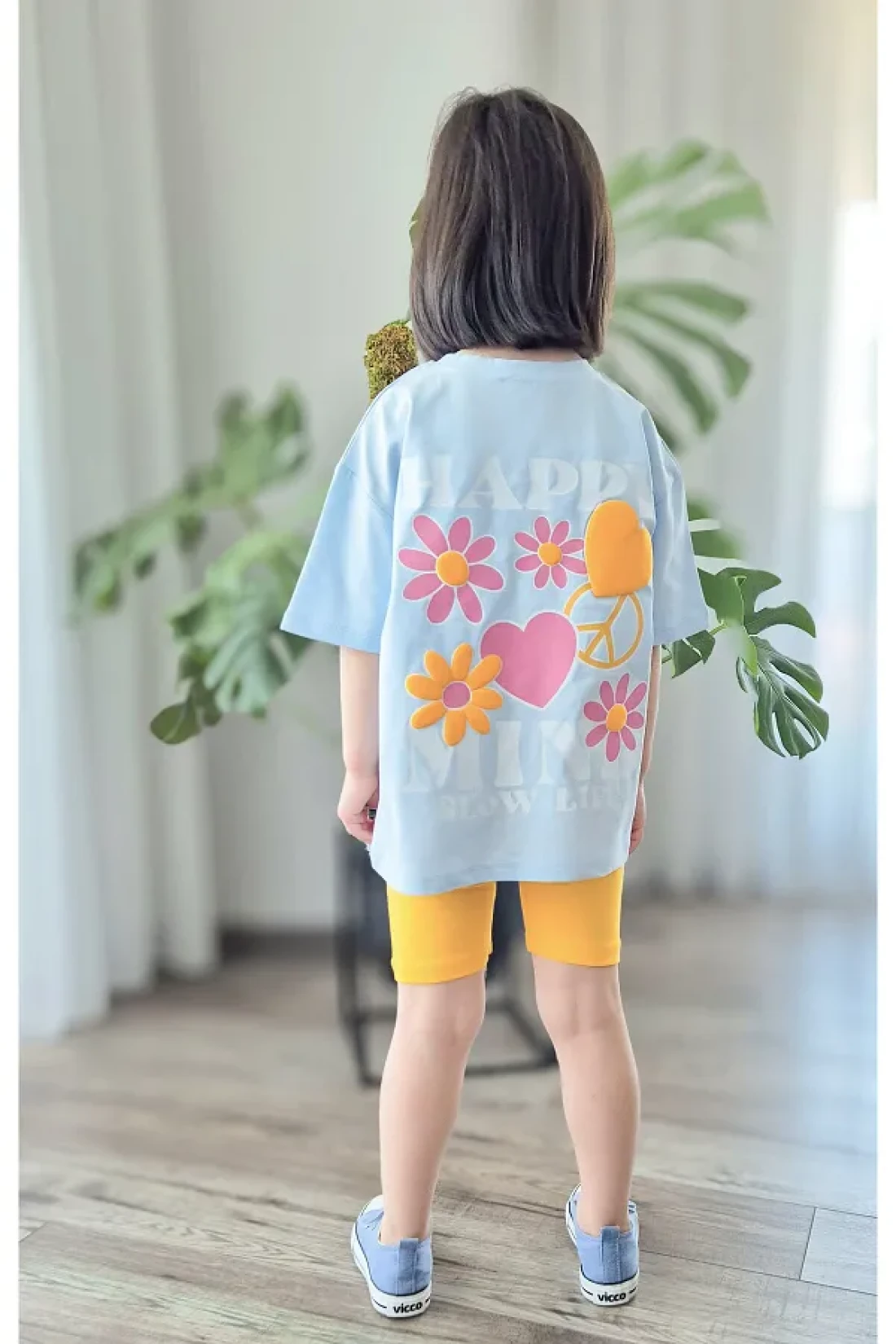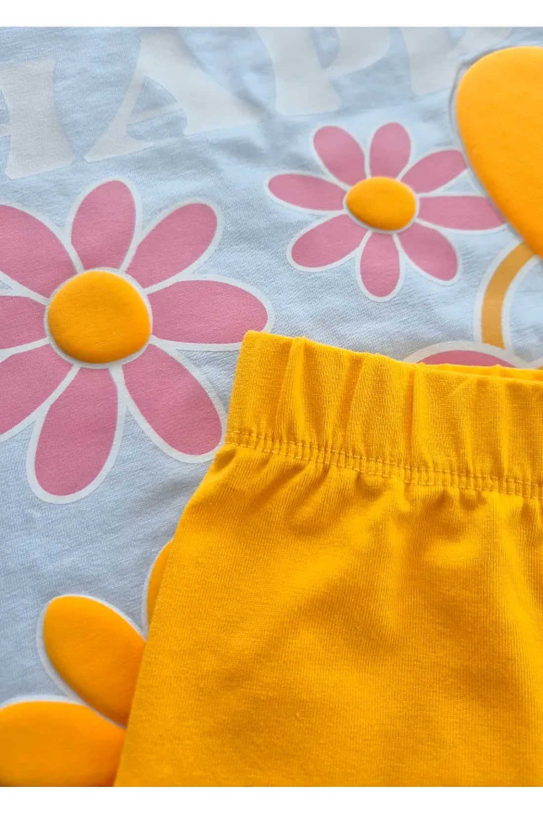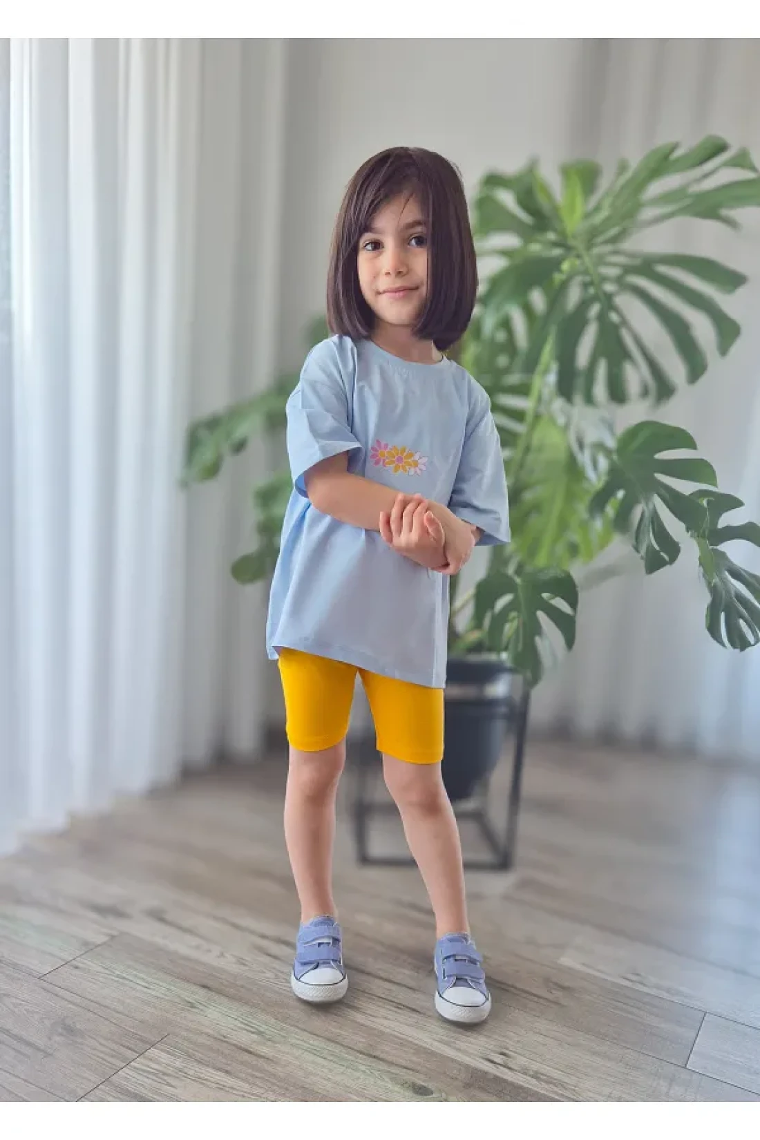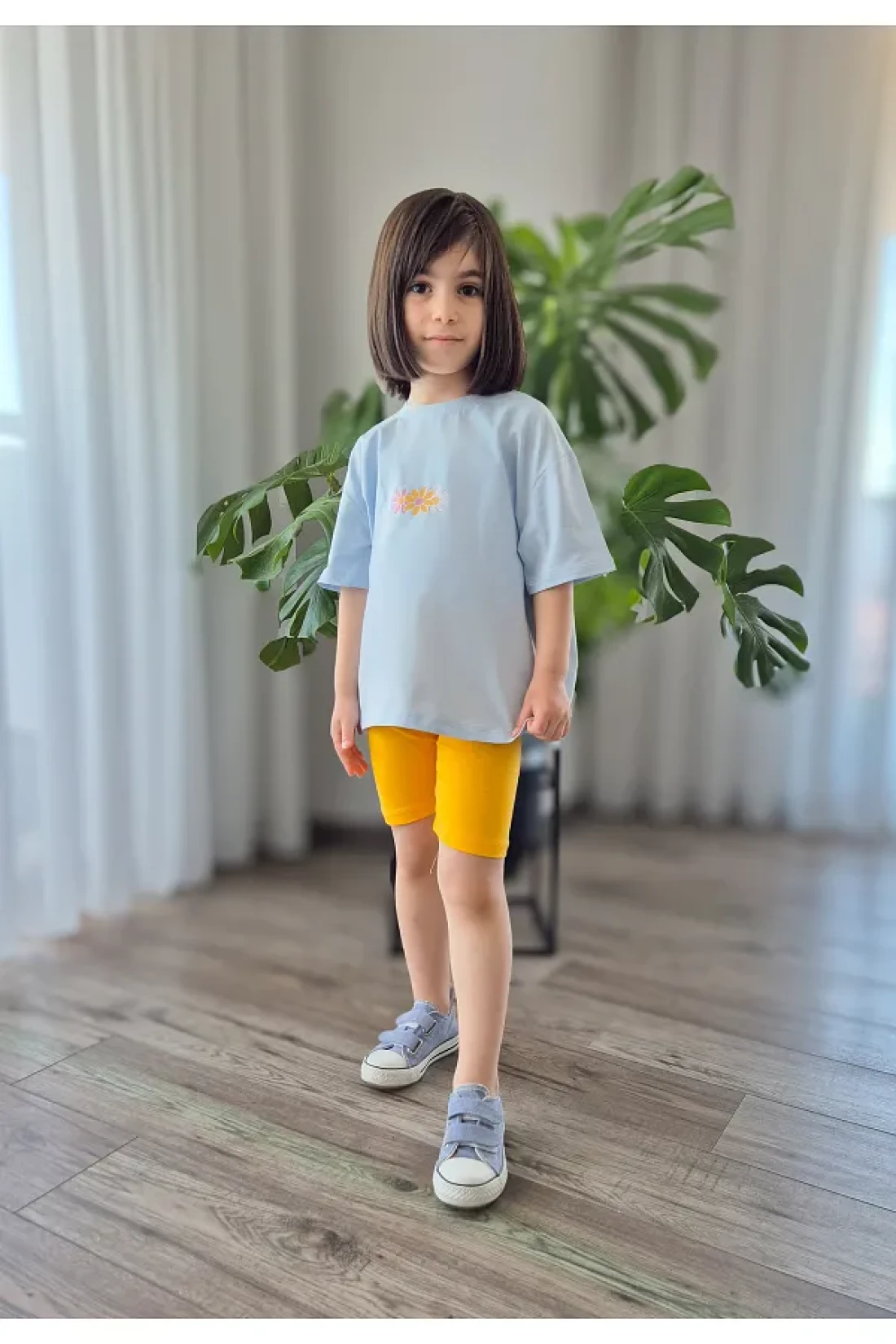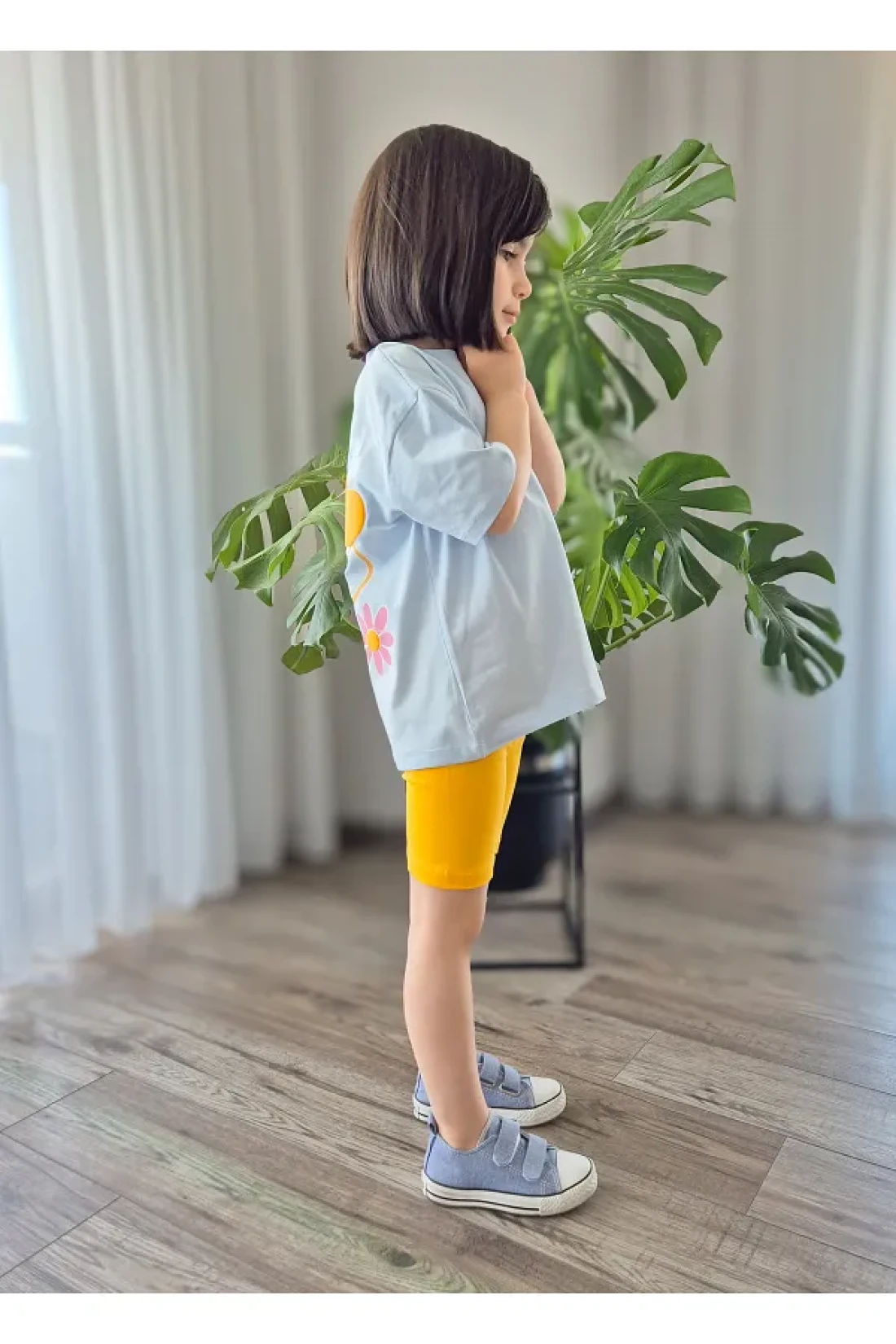 A t-shirt adorned with floral patterns in shades of blue completes the elegance of girls in the summer months. The sun-yellow biker tights allow for comfortable movement while also attracting attention with their vibrant colors. Thanks to its oversized mold, it offers a wide area of use where children can play freely.