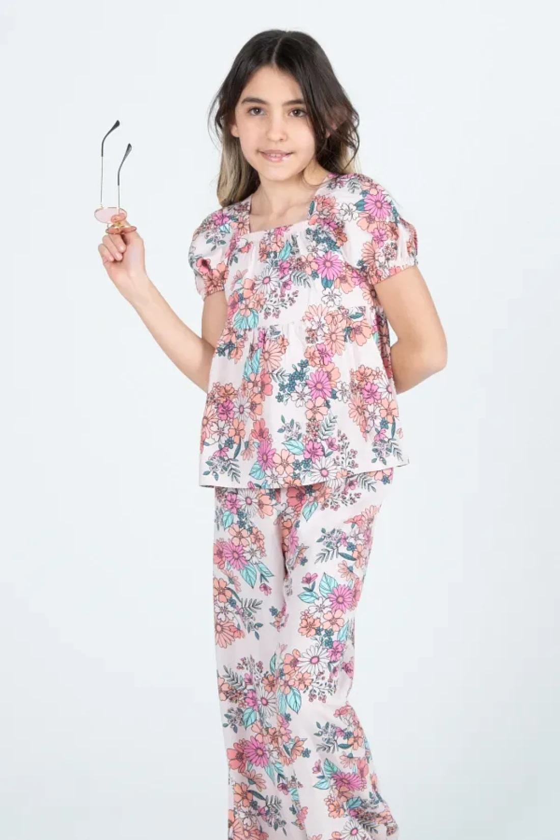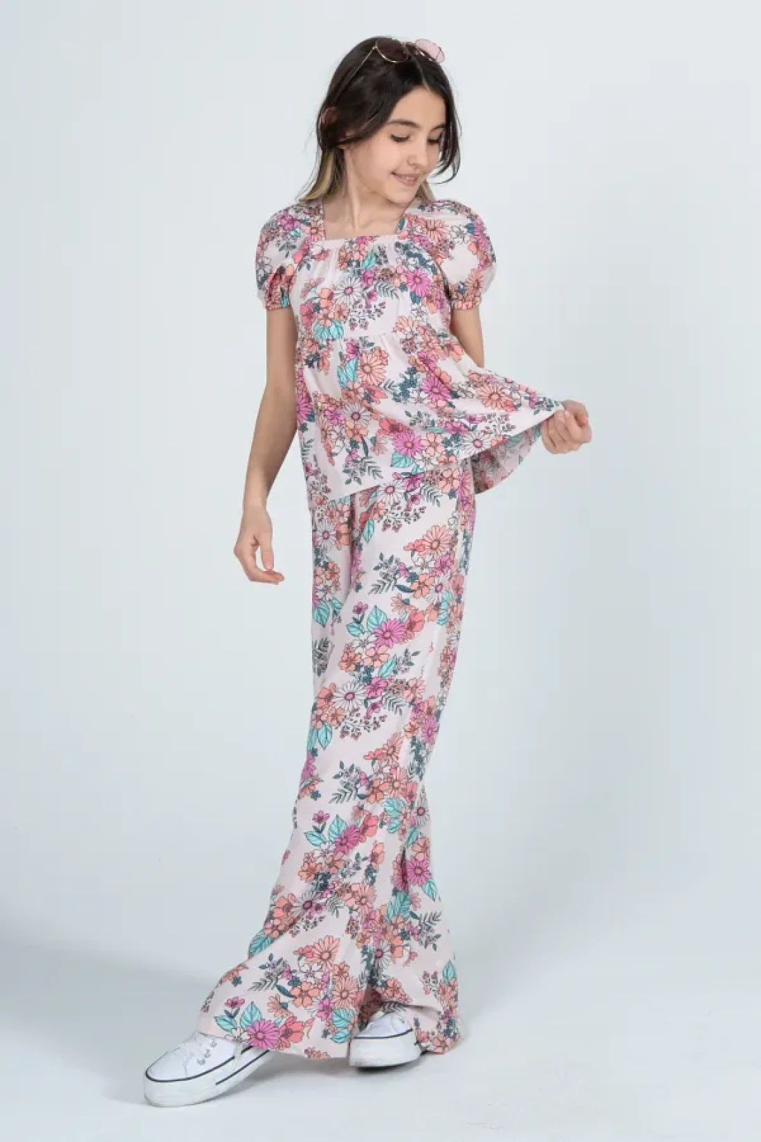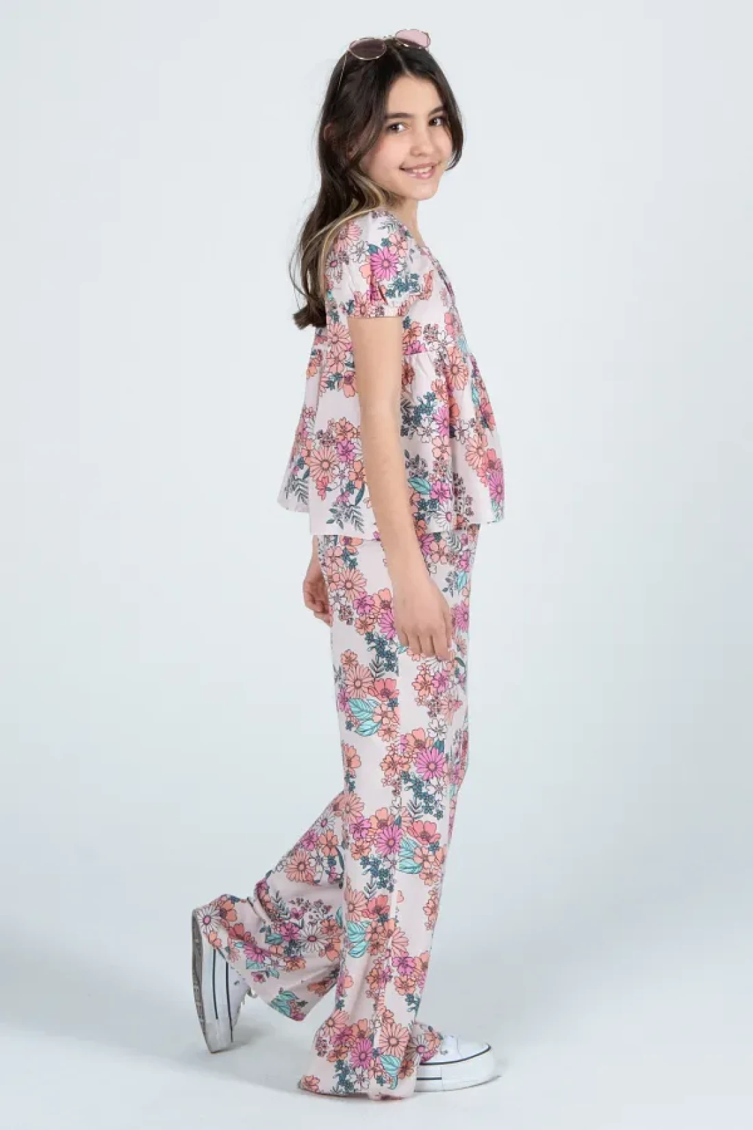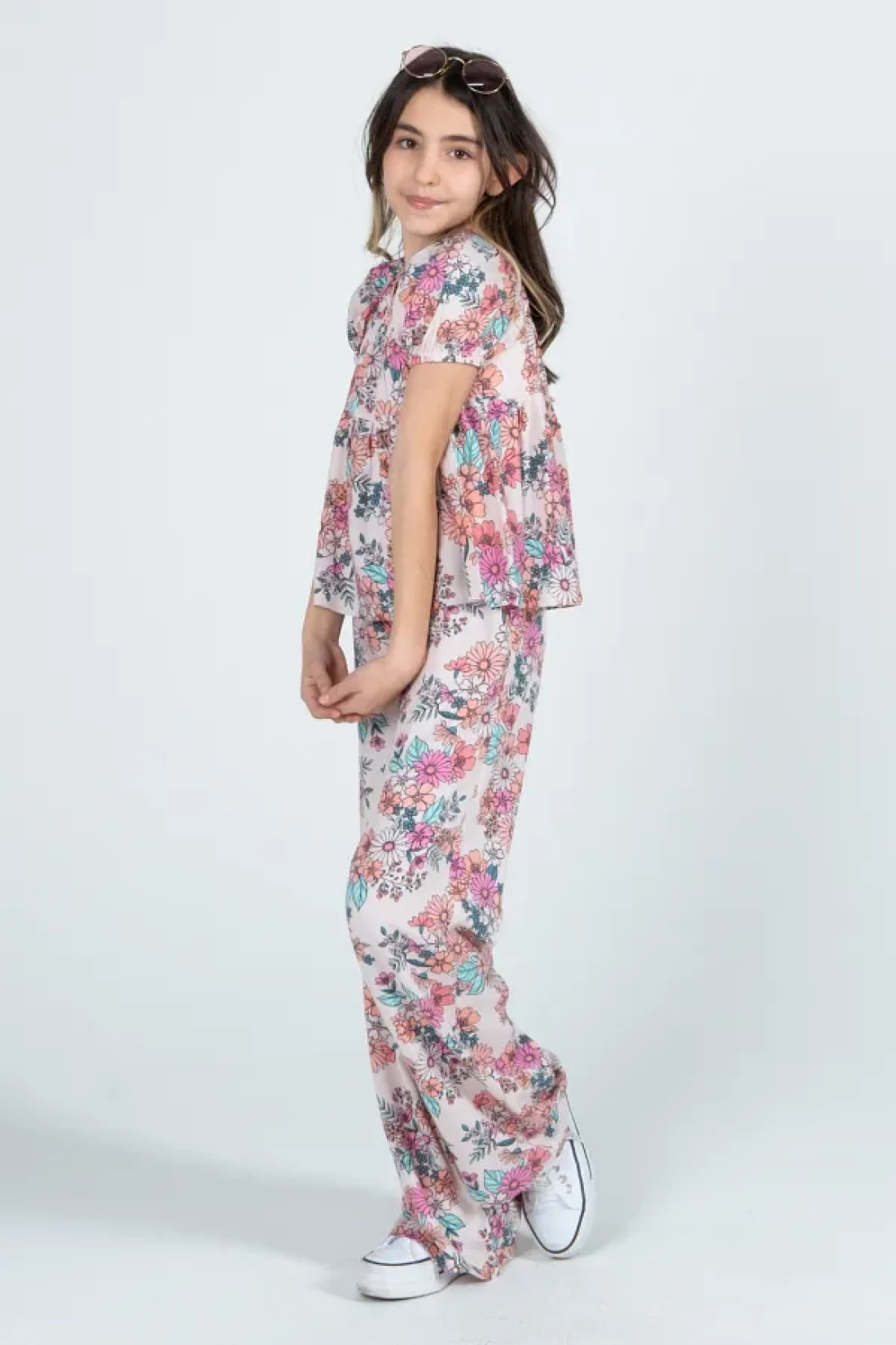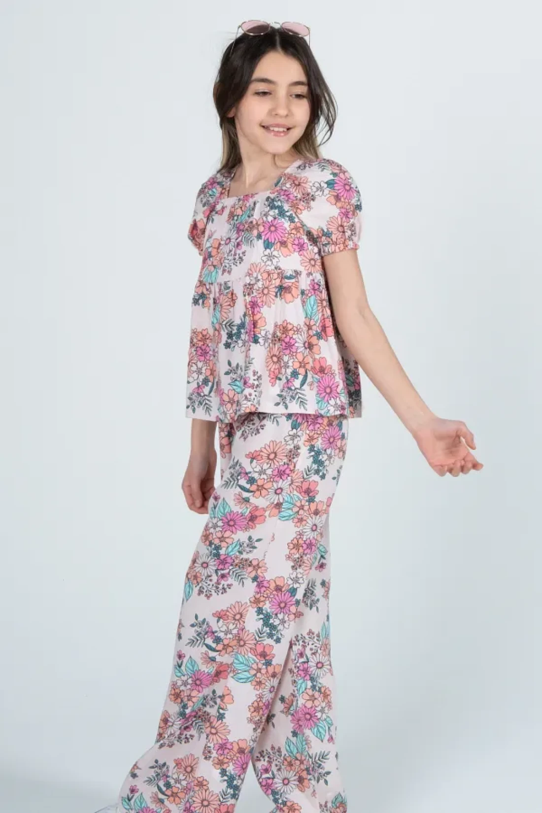 - the blouse and pants set decorated with floral patterns, reflects the energy of the girl. Thanks to its thin thickness, it offers ideal comfort during seasonal transitions