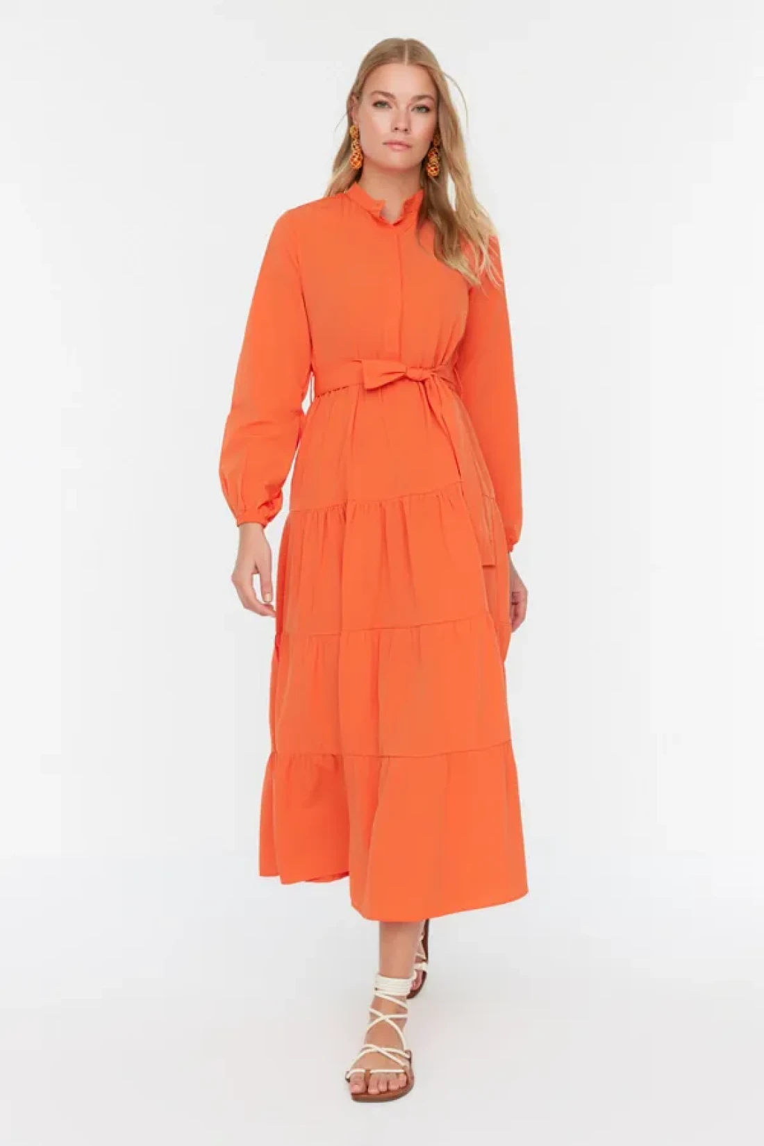 Modest Orange Belted Prevailing Collar Button Detail Woven Dress TCTSS21EL3343