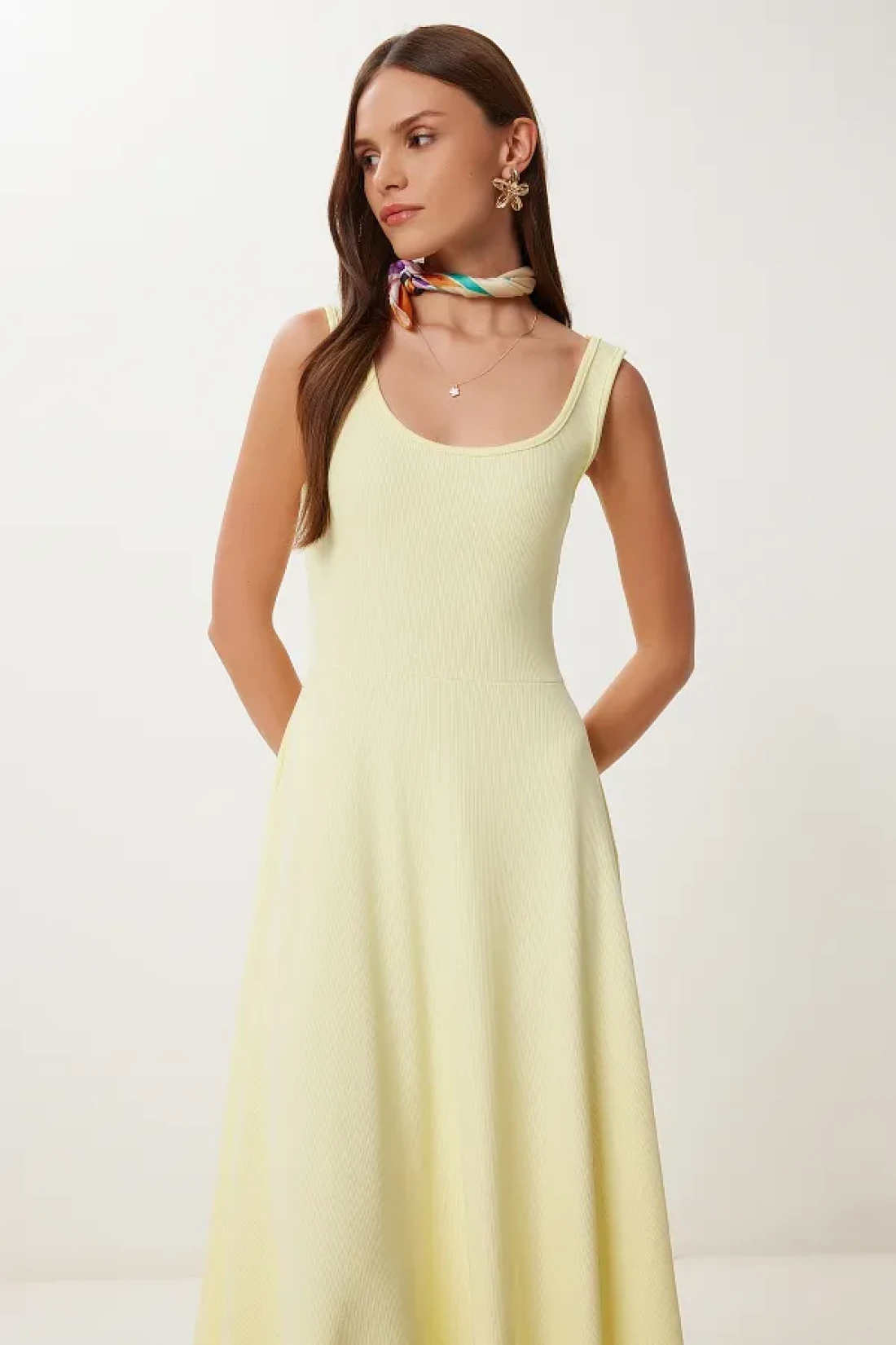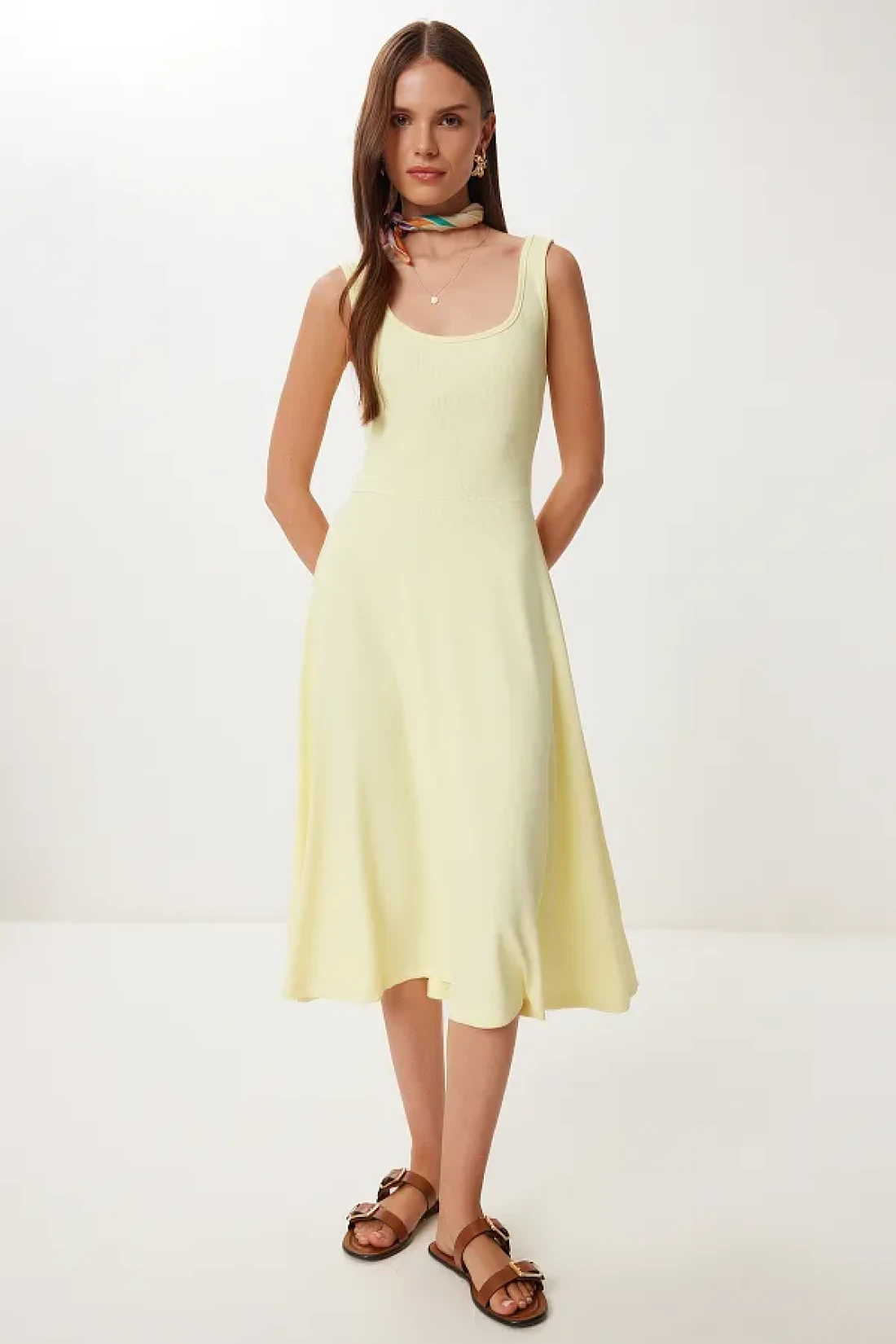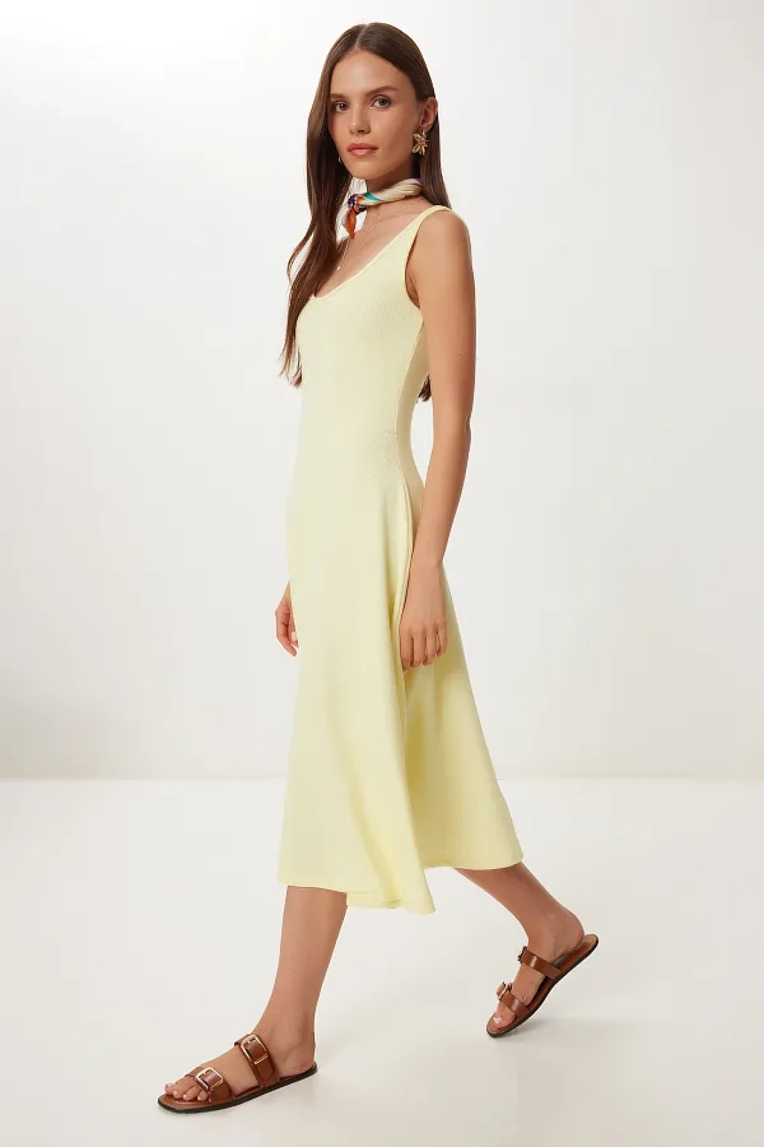 Happiness İstanbul Women's Yellow Strap Summer Ribbed Knitted Midi Dress Dz00130