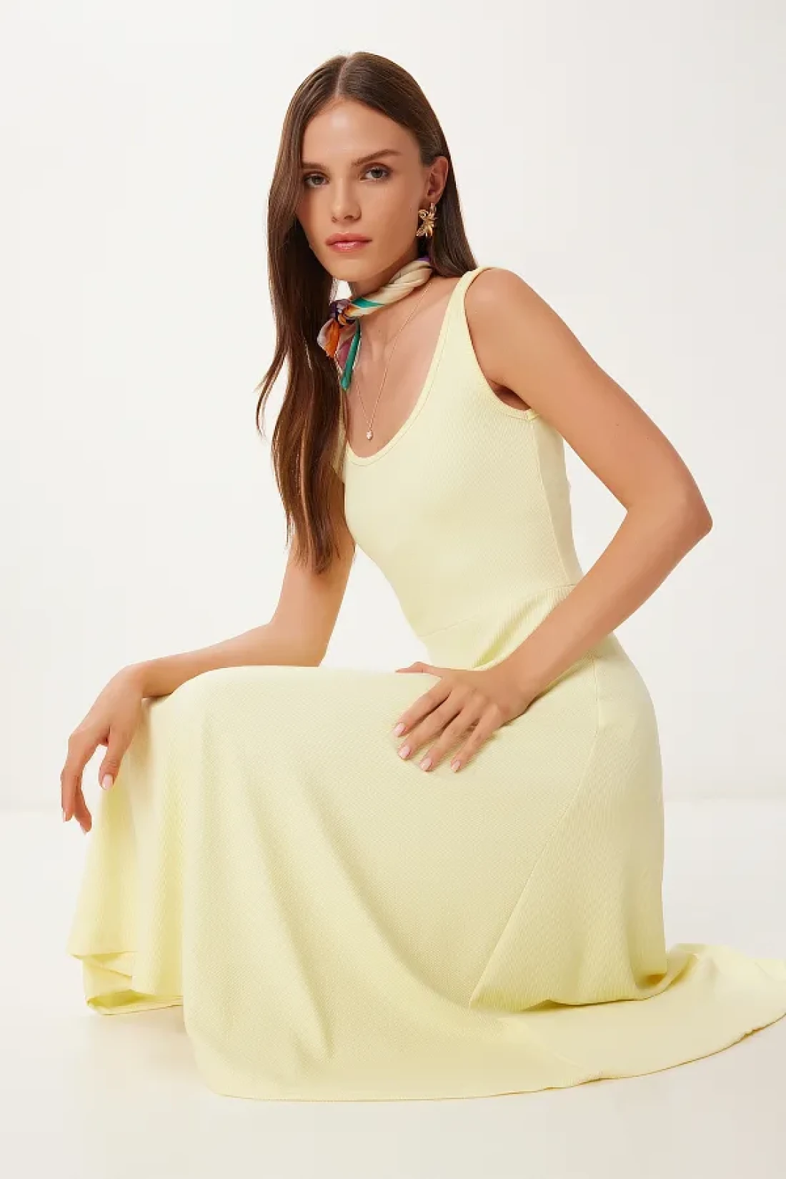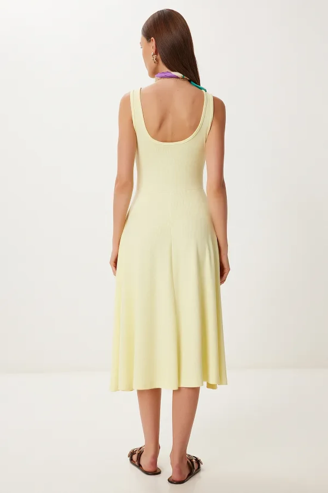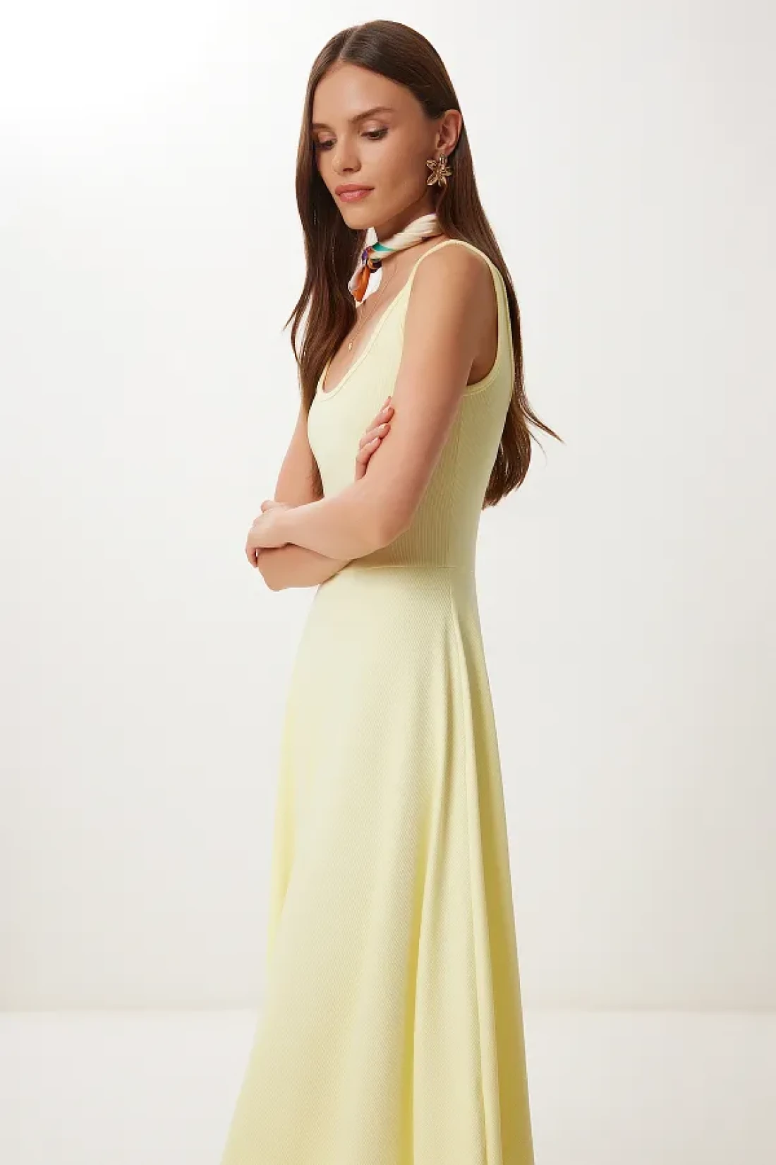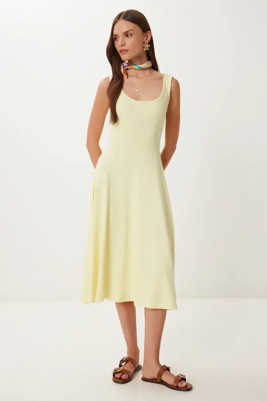 Happiness İstanbul Women's Yellow Strap Summer Ribbed Knitted Midi Dress Dz00130