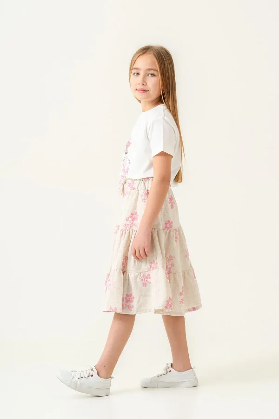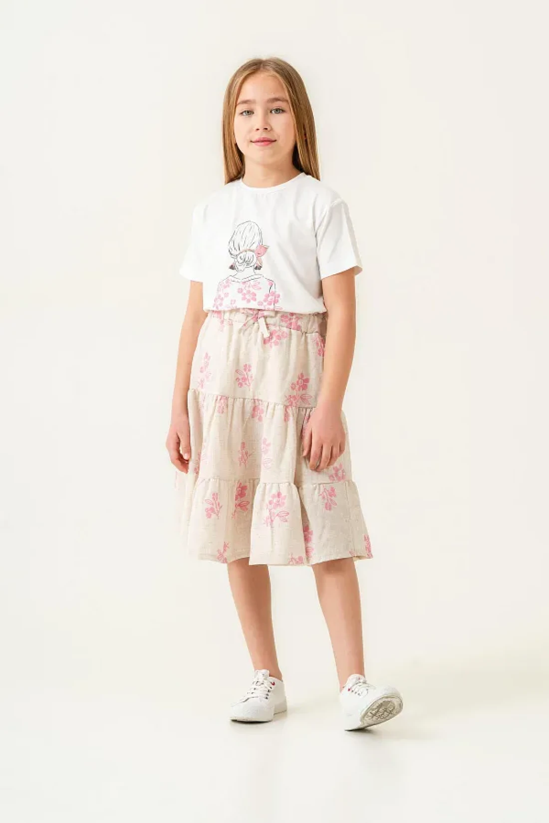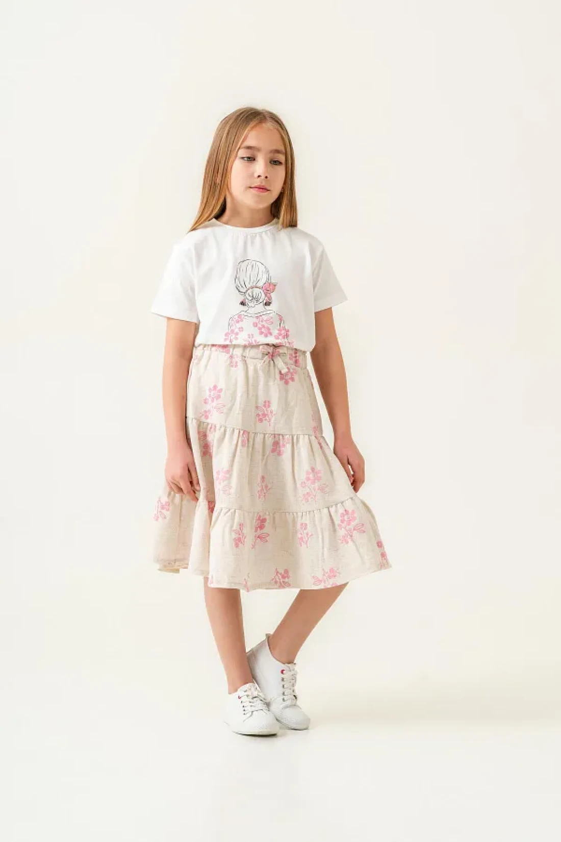 - t-shirt and skirt set decorated with colorful and vivid floral patterns, special design for girls. It offers coolness and comfort in the summer months thanks to its cotton fabric. It provides freedom of movement with a regular fit