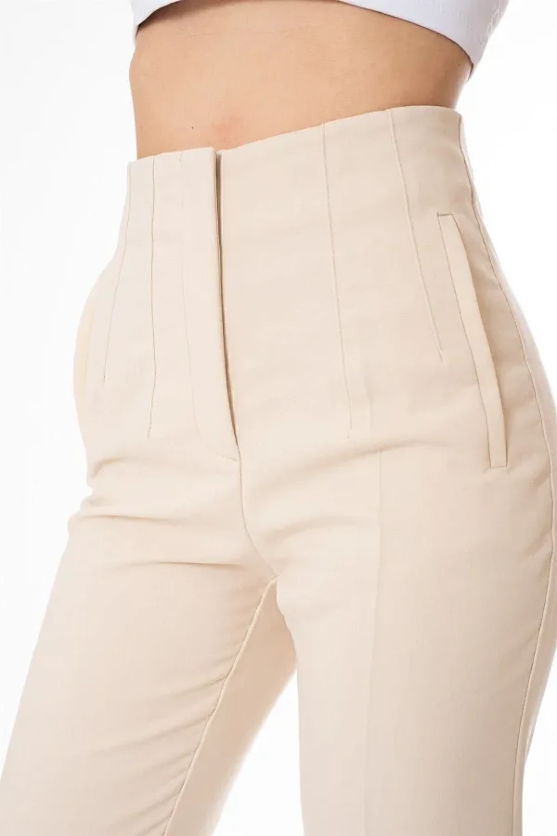 Tebessüm Life High Waist Beige Fabric Trousers - Collar Detail