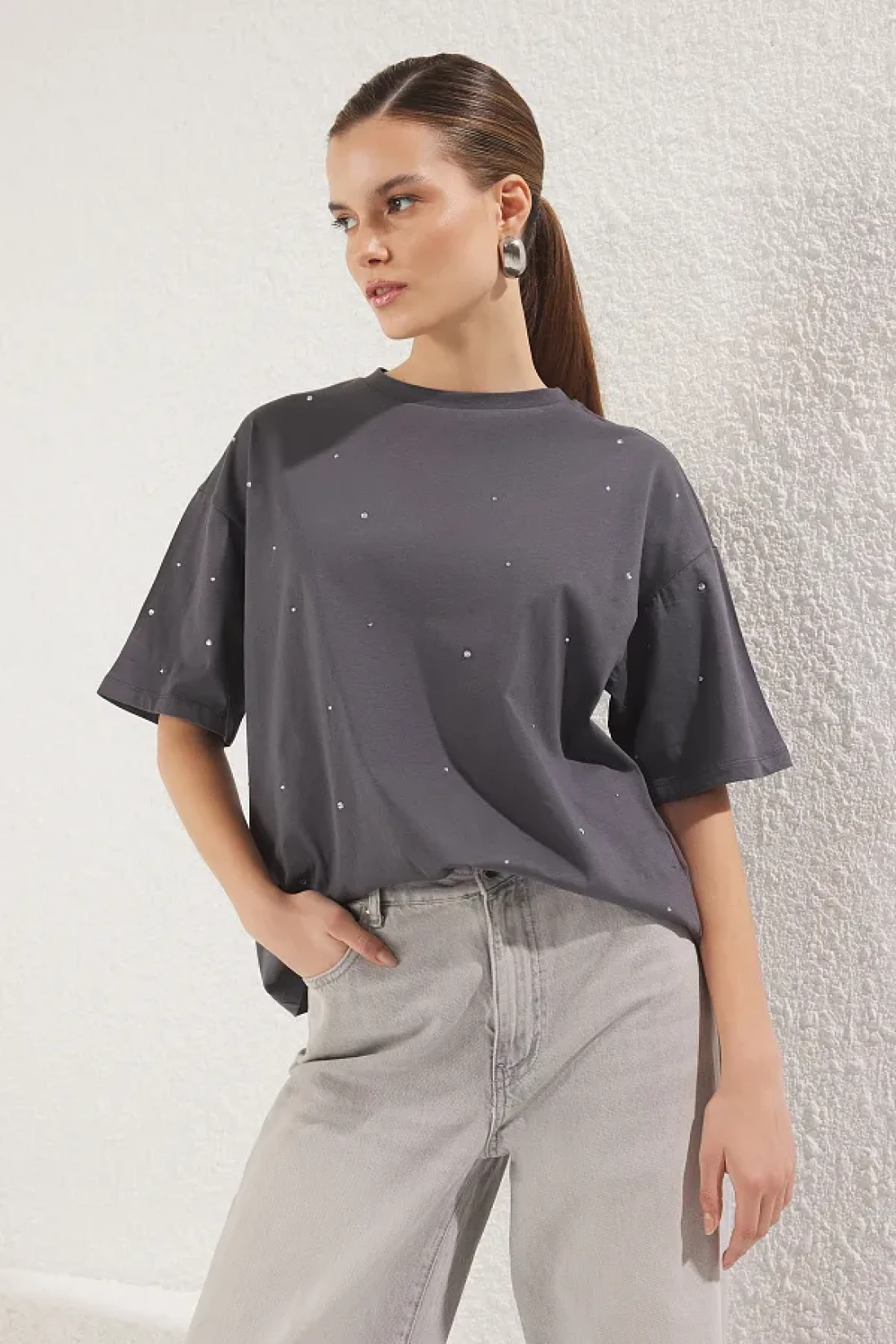 Collection Anthracite 100% Cotton Stone Detailed Relaxed/Wide Relaxed Fit Crew Neck Knitted T-Shirt Twoss23Ts00153